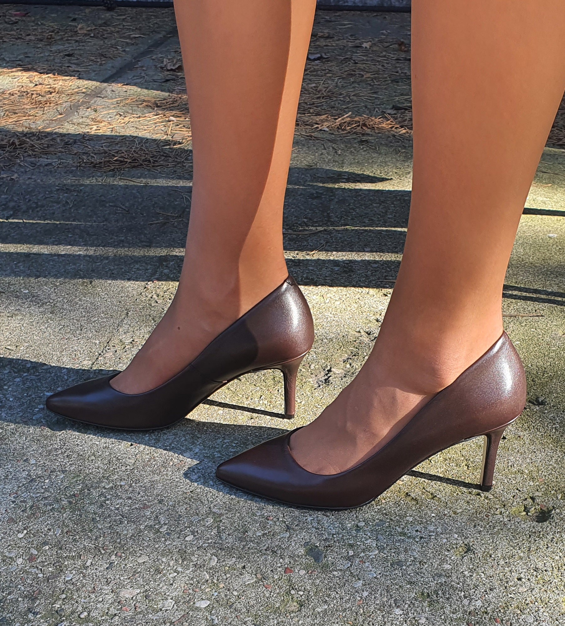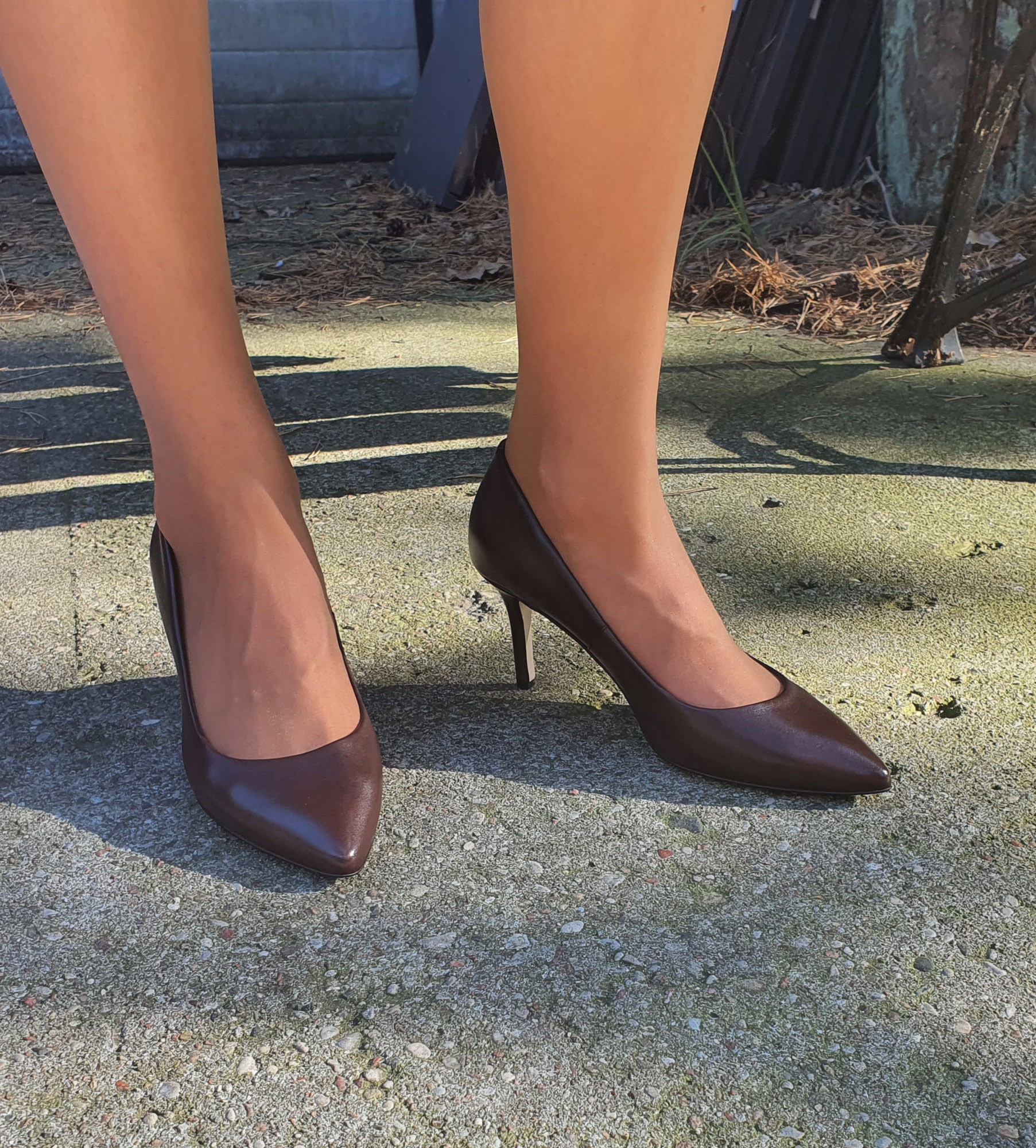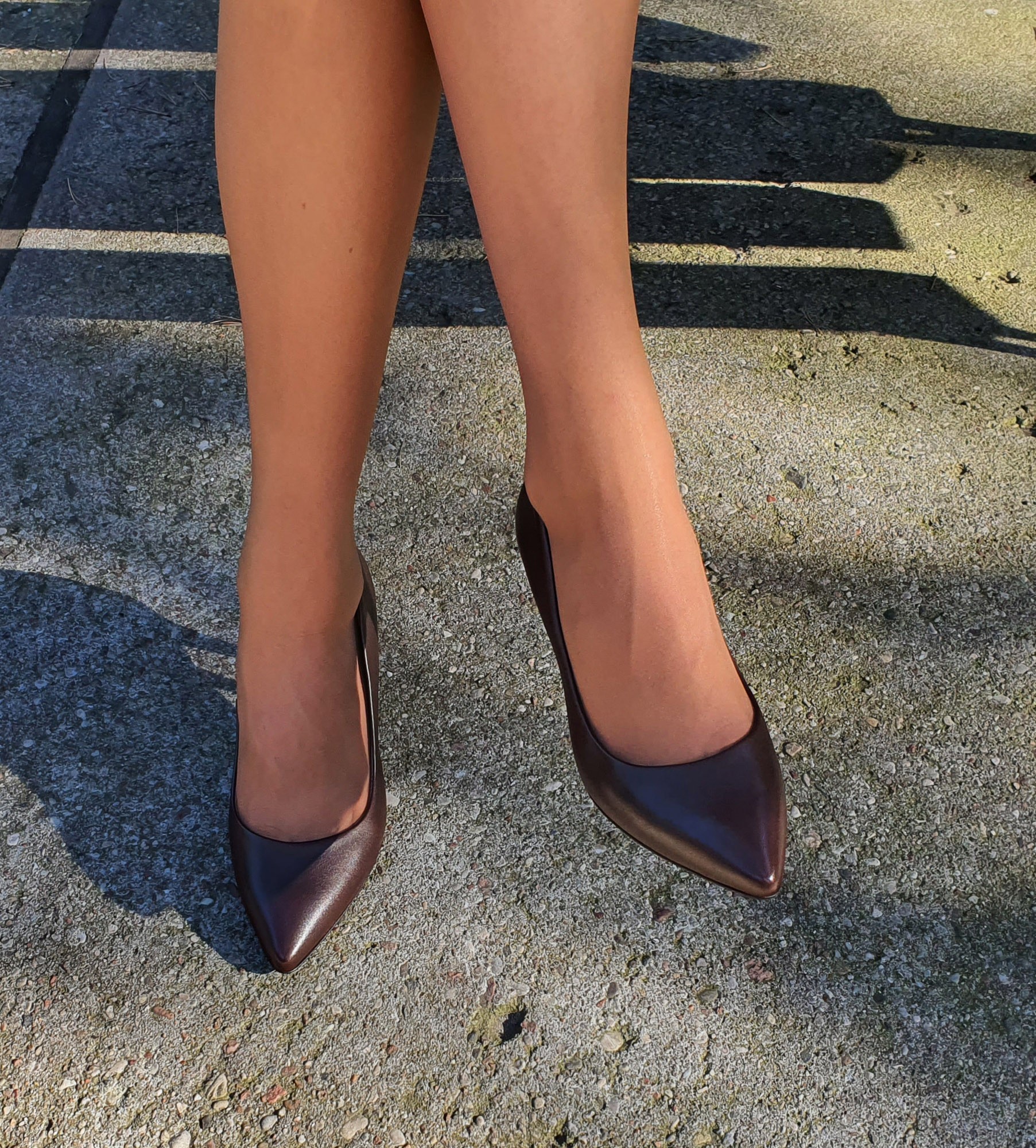 Te klasyczne czółenka wykonane zostały z najwyższej jakości skóry cielęcej, która emanuje delikatnym połyskiem i miękką fakturą. Wnętrze wyściełane jest luksusową skórą jagnięcą — zapewniającą komfort, oddychalność i przyjemne dopasowanie do stopy. Szpilka – klasyczna i idealnie wyprofilowana – balansuje elegancję z wygodą, unosząc sylwetkę bez uczucia dyskomfortu. Neutralny, ciepły brąz sprawia, że czółenka te stają się uniwersalnym dodatkiem, pasującym zarówno do garniturów, ołówkowych spódnic, jak i eleganckich sukienek dziennych.