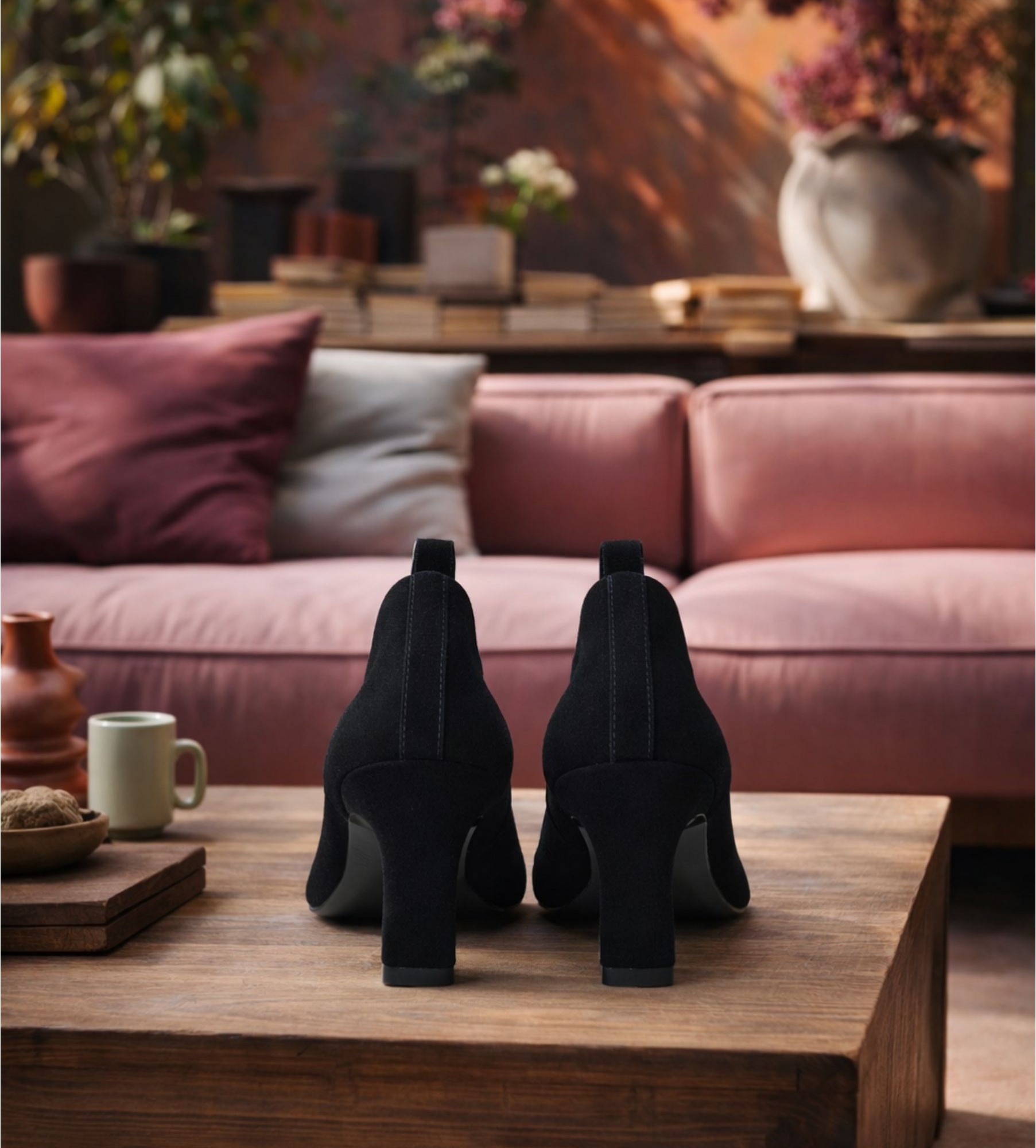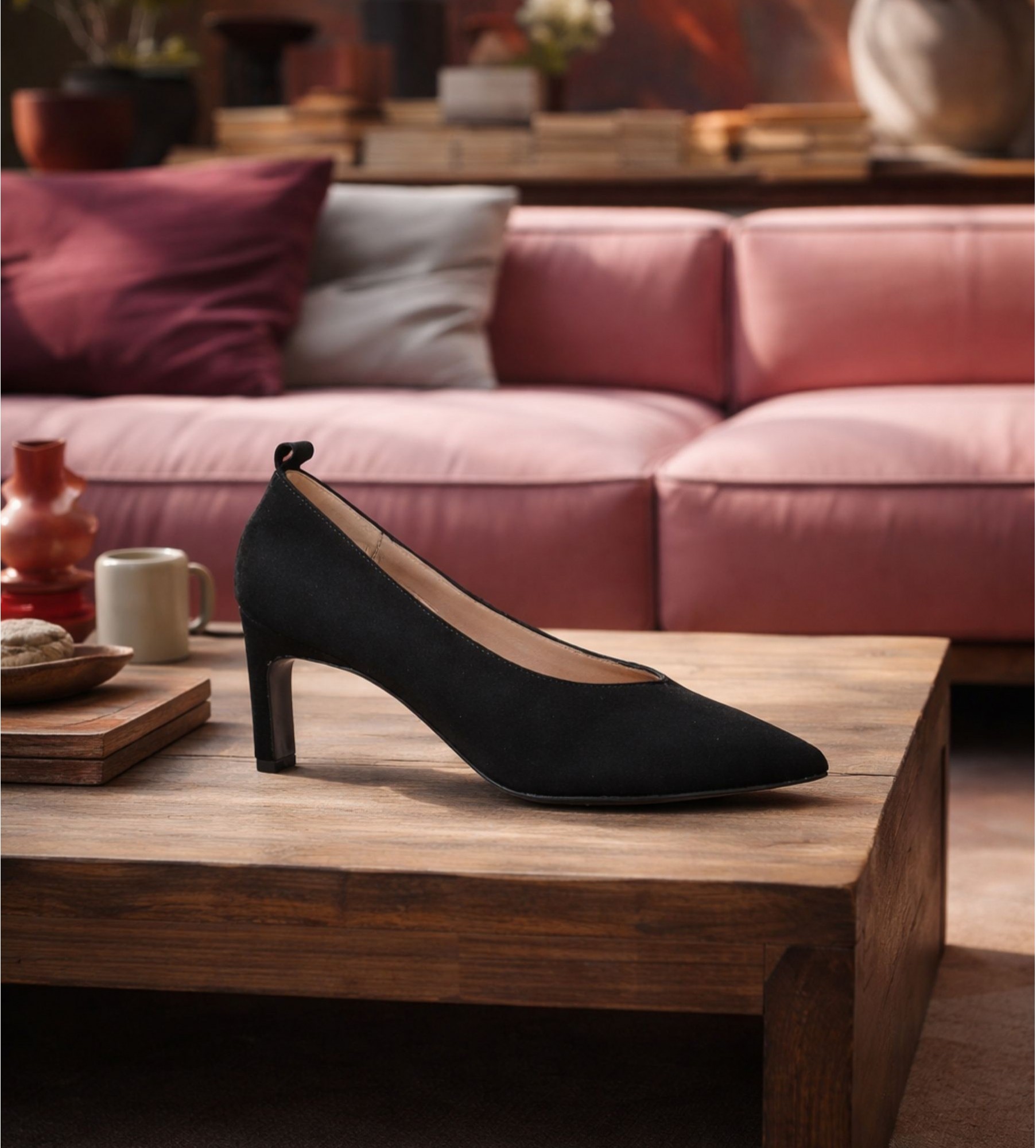 Czarne zamszowe czółenka damskie to połączenie klasyki i subtelnej elegancji. Wykonane z miękkiego zamszu, prezentują się niezwykle stylowo, podkreślając każdą stylizację delikatnym kobiecym wykończeniem. Smukły obcas zapewnia wygodę i elegancki wygląd, doskonale wydłużając nogi. Te czółenka to wszechstronny wybór, idealny zarówno na formalne okazje, jak i codzienne wyjścia, oferując komfort noszenia przez cały dzień i podkreślając Twoją wyjątkowość.