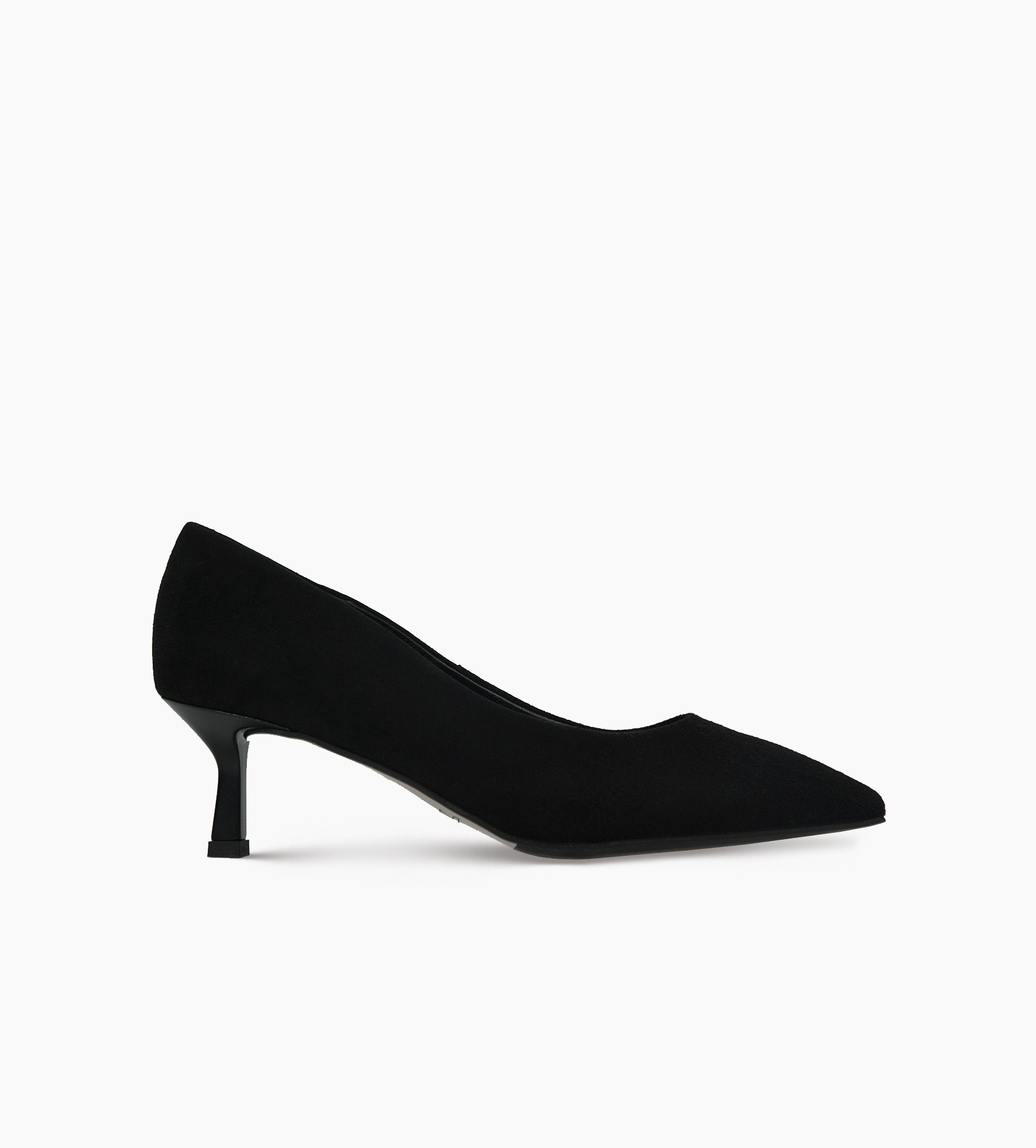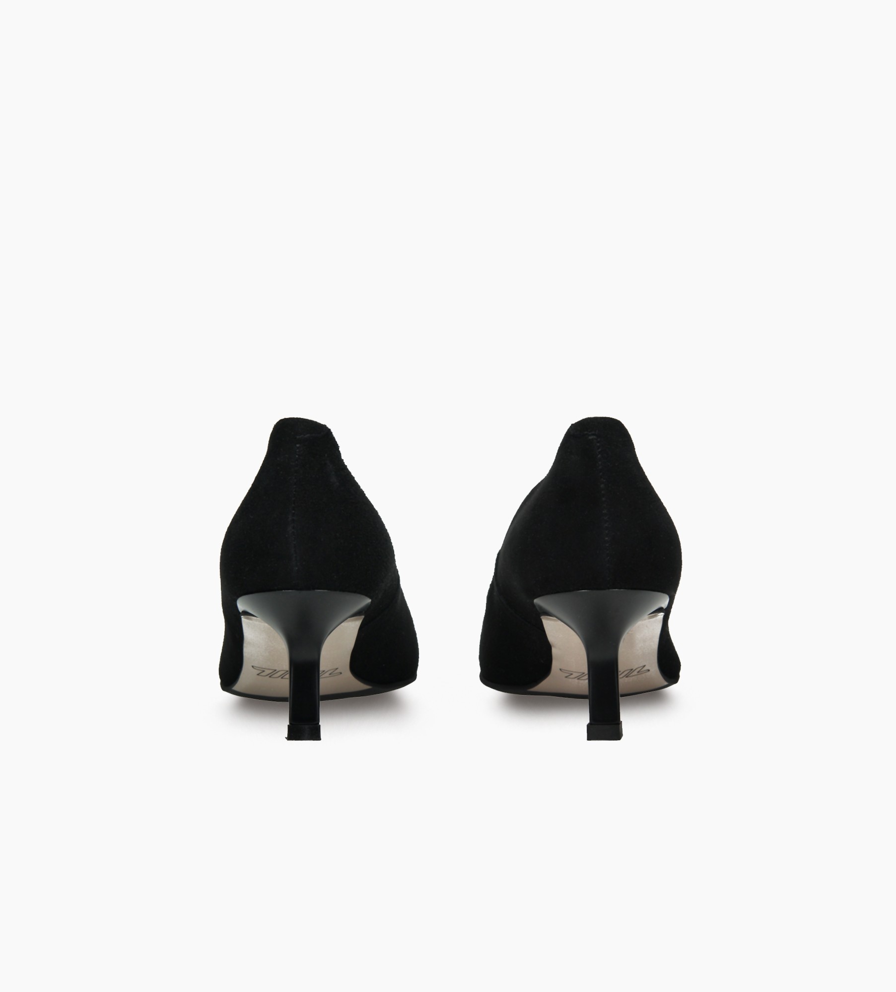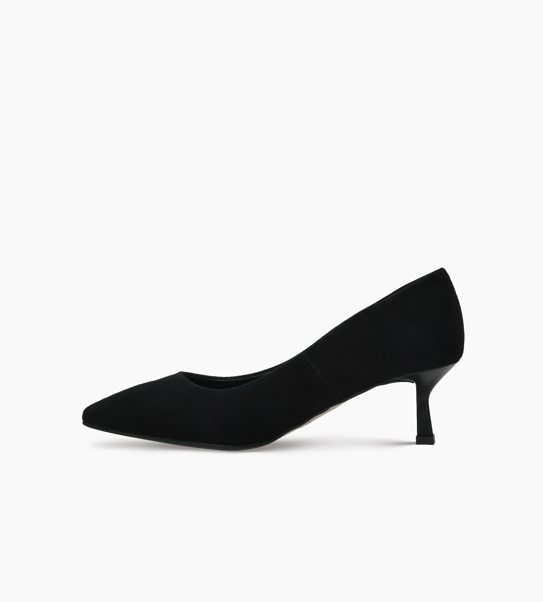 Klasyczne czarne czółenka wykonane z miękkiego zamszu to idealny wybór dla kobiet ceniących subtelność, uniwersalność i wygodę. Wnętrze butów wyściełane jest skórą jagnięcą, co zapewnia wyjątkowy komfort i uczucie miękkości przez cały dzień.Model osadzony został na niskim, nowoczesnym obcasie typu kitten heel, który wysmukla sylwetkę, a jednocześnie gwarantuje stabilność i wygodę – idealny zarówno na intensywny dzień w pracy, jak i wieczorne wyjście. Migdałowy nosek dodaje butom kobiecego wyrazu, zachowując przy tym minimalistyczny charakter.