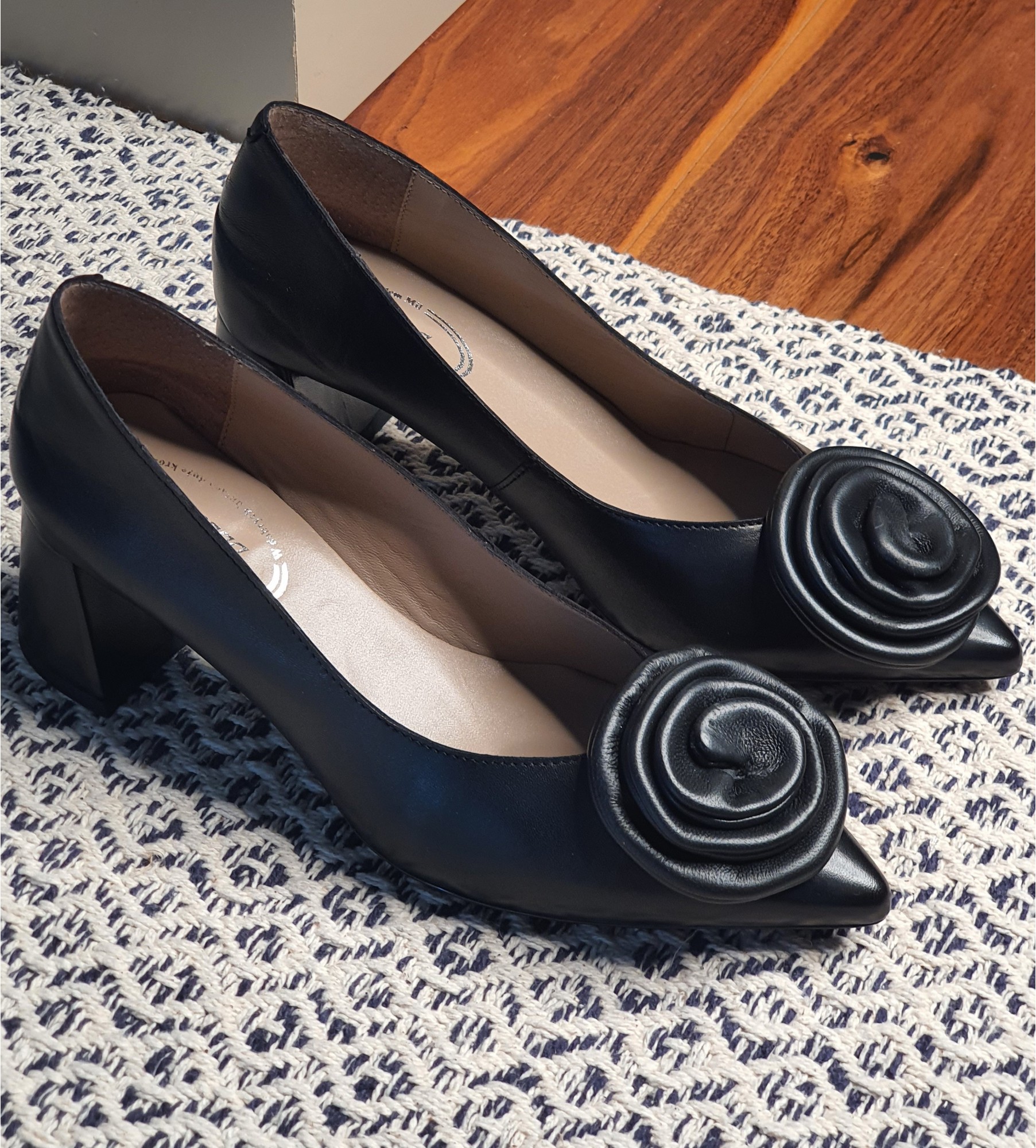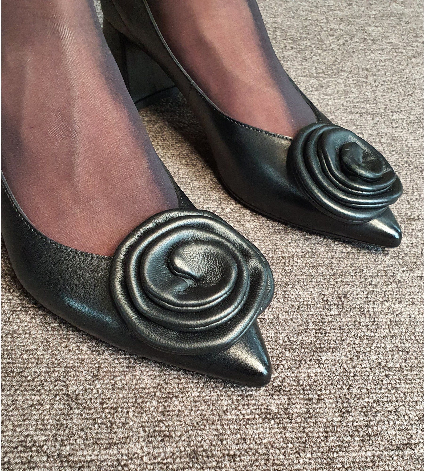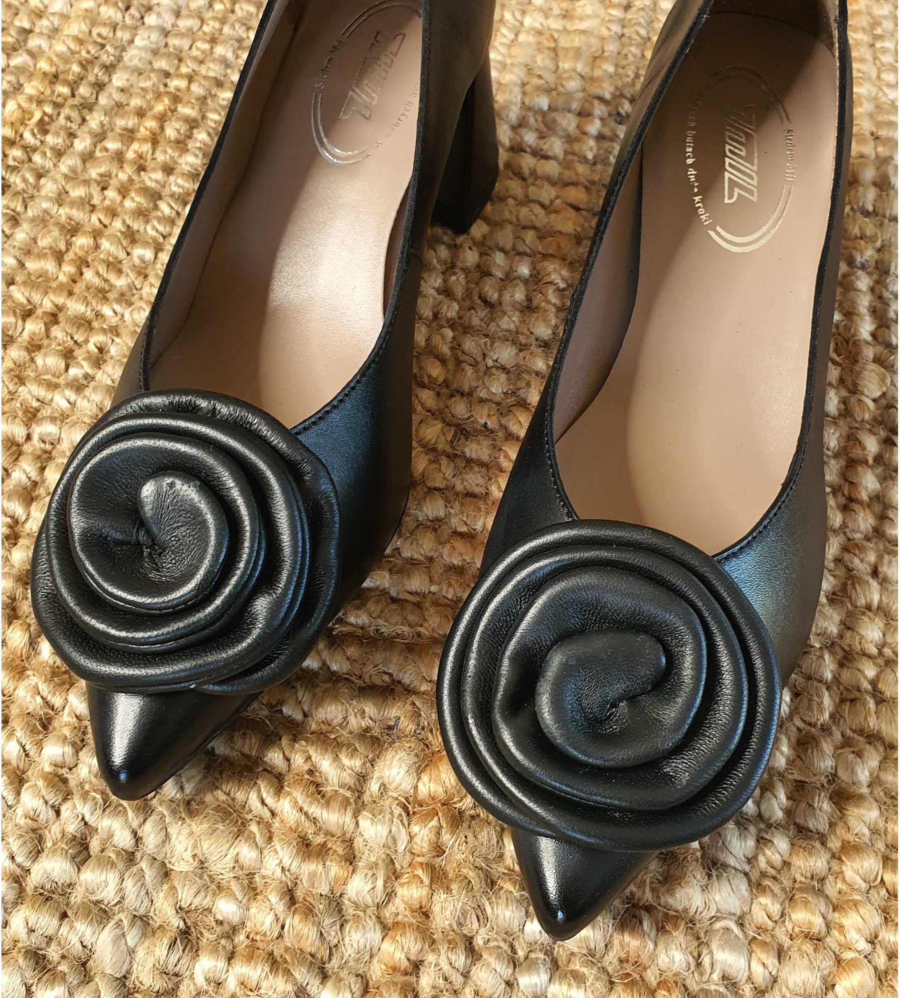 Czarne czółenka damskie wykonane ze skóry naturalnej o subtelnym połysku, z wnętrzem wyściełanym miękką, delikatną skórą jagnięcą dla maksymalnego komfortu noszenia. Model wyróżnia się nowoczesną sylwetką z elegancko wydłużonym noskiem w szpic oraz stabilnym, proporcjonalnym obcasem o wysokości ok. 6 cm, który zapewnia wysmuklenie sylwetki i wygodę przez cały dzień. Charakteru i unikalnego, modowego wyrazu dodaje ręcznie formowany kwiat ze skóry w tonacji buta, umieszczony na przodzie niczym biżuteryjny detal – subtelny, a zarazem wyrazisty akcent. To propozycja dla kobiet poszukujących obuwia łączącego klasykę z artystyczną nutą.