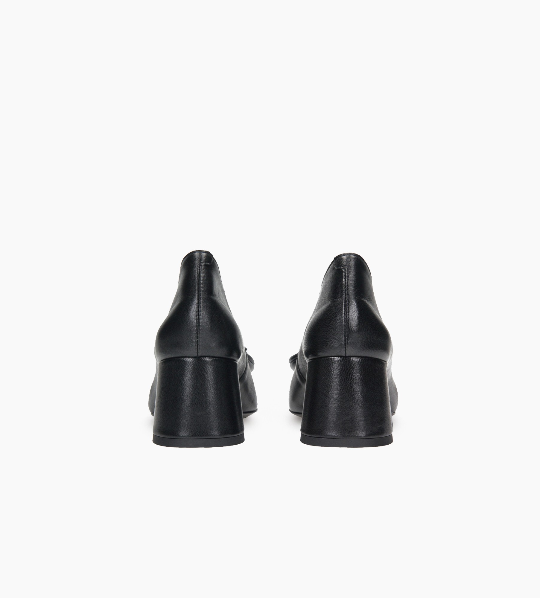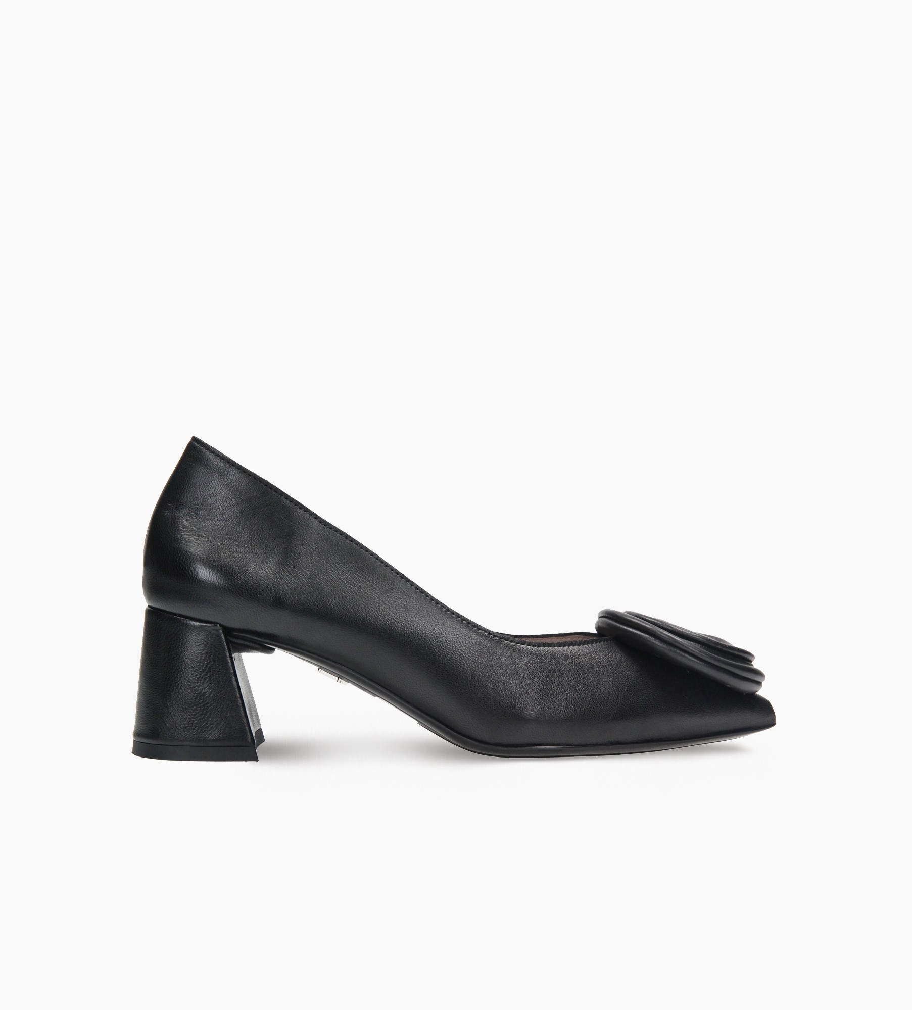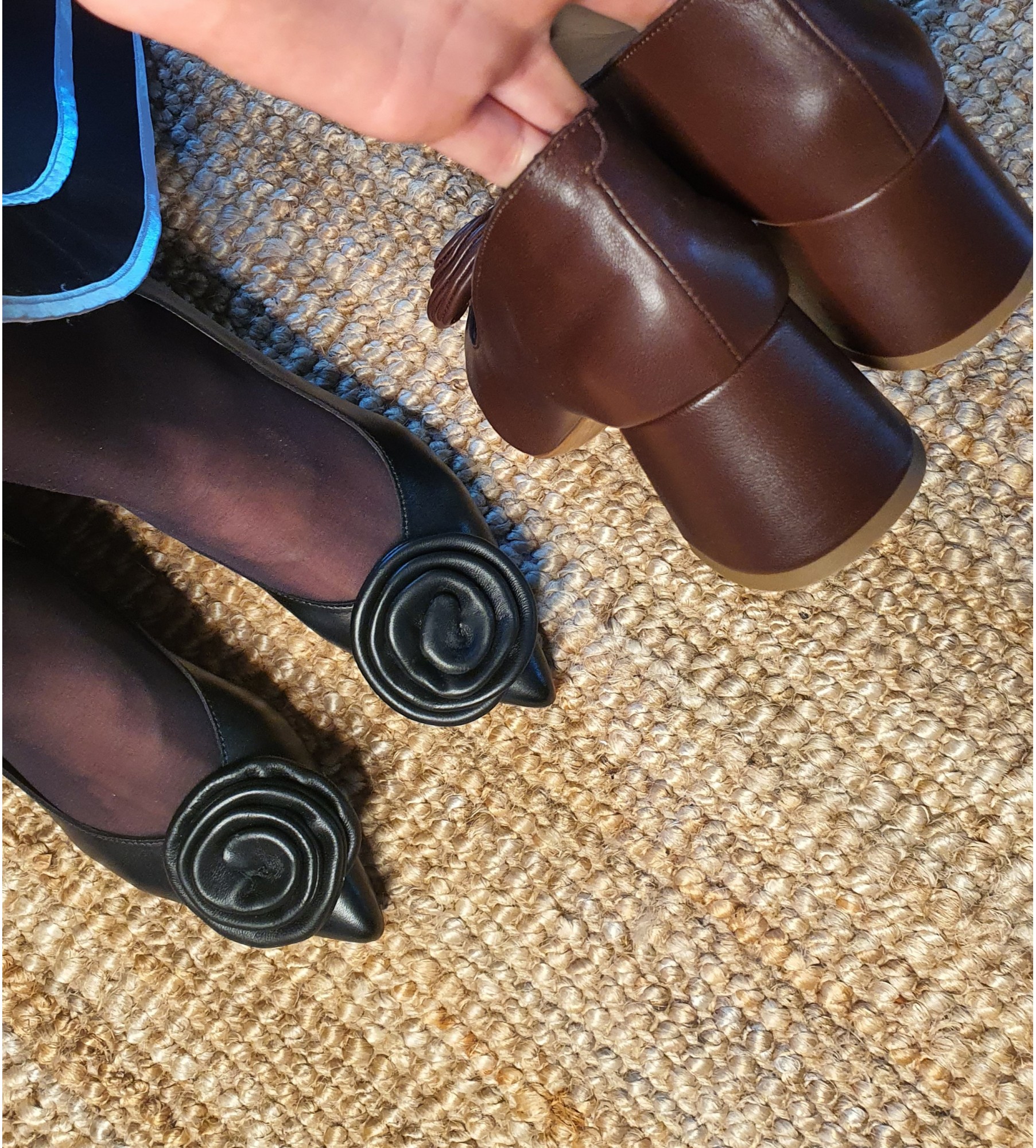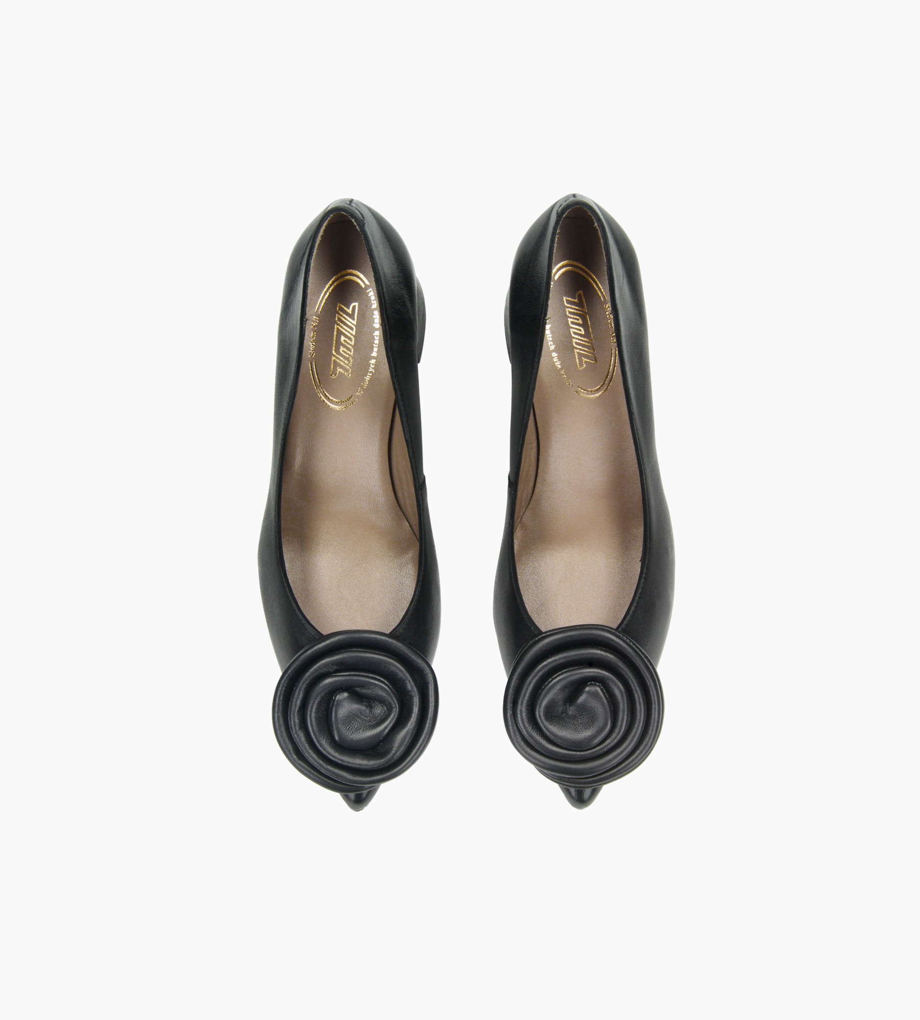 Czarne czółenka damskie wykonane ze skóry naturalnej o subtelnym połysku, z wnętrzem wyściełanym miękką, delikatną skórą jagnięcą dla maksymalnego komfortu noszenia. Model wyróżnia się nowoczesną sylwetką z elegancko wydłużonym noskiem w szpic oraz stabilnym, proporcjonalnym obcasem o wysokości ok. 6 cm, który zapewnia wysmuklenie sylwetki i wygodę przez cały dzień. Charakteru i unikalnego, modowego wyrazu dodaje ręcznie formowany kwiat ze skóry w tonacji buta, umieszczony na przodzie niczym biżuteryjny detal – subtelny, a zarazem wyrazisty akcent. To propozycja dla kobiet poszukujących obuwia łączącego klasykę z artystyczną nutą.