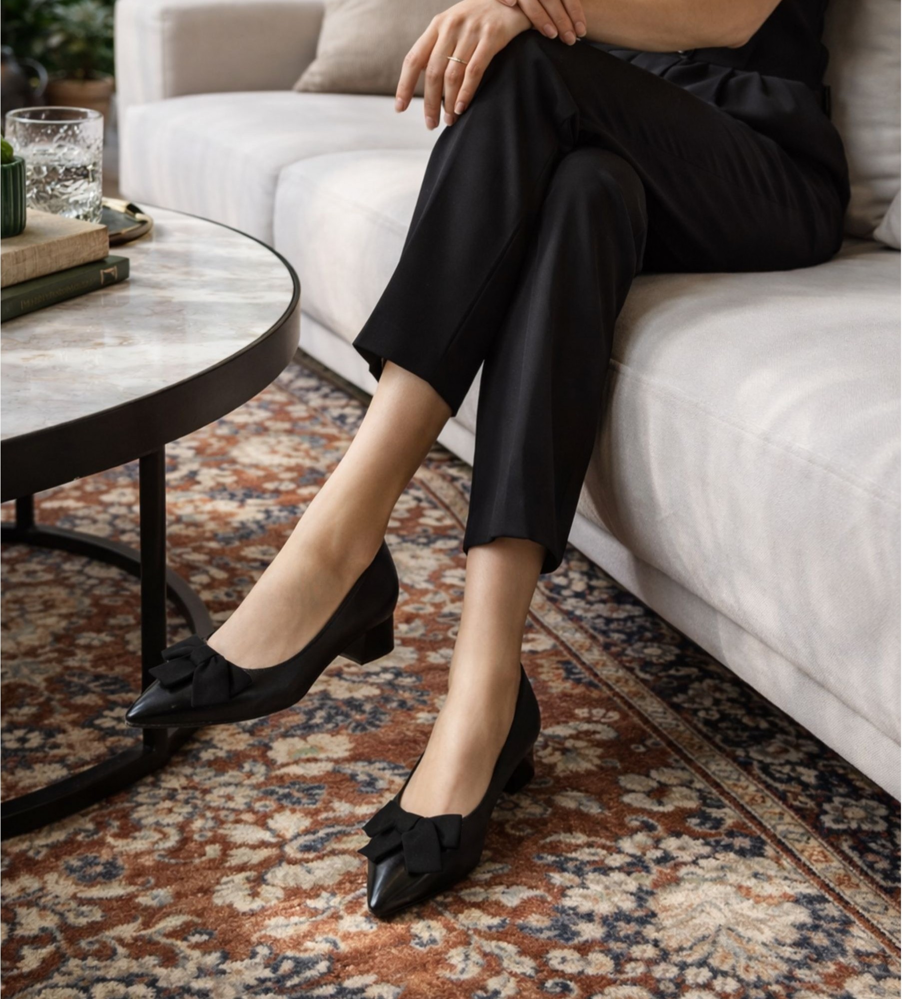 Czarne czółenka z kokardą doskonale dopełnią stylizację złożoną z dopasowanych cygaretek w kolorze grafitowym oraz jedwabnej koszuli w odcieniu kości słoniowej z delikatnym żabotem. Na wierzch załóż krótki, taliowany płaszcz z wełny w kolorze głębokiego granatu. Całość uzupełnij klasyczną torebką na ramię i złotymi kolczykami typu sztyfty. Subtelna kokarda przy butach wprowadza modowy akcent.