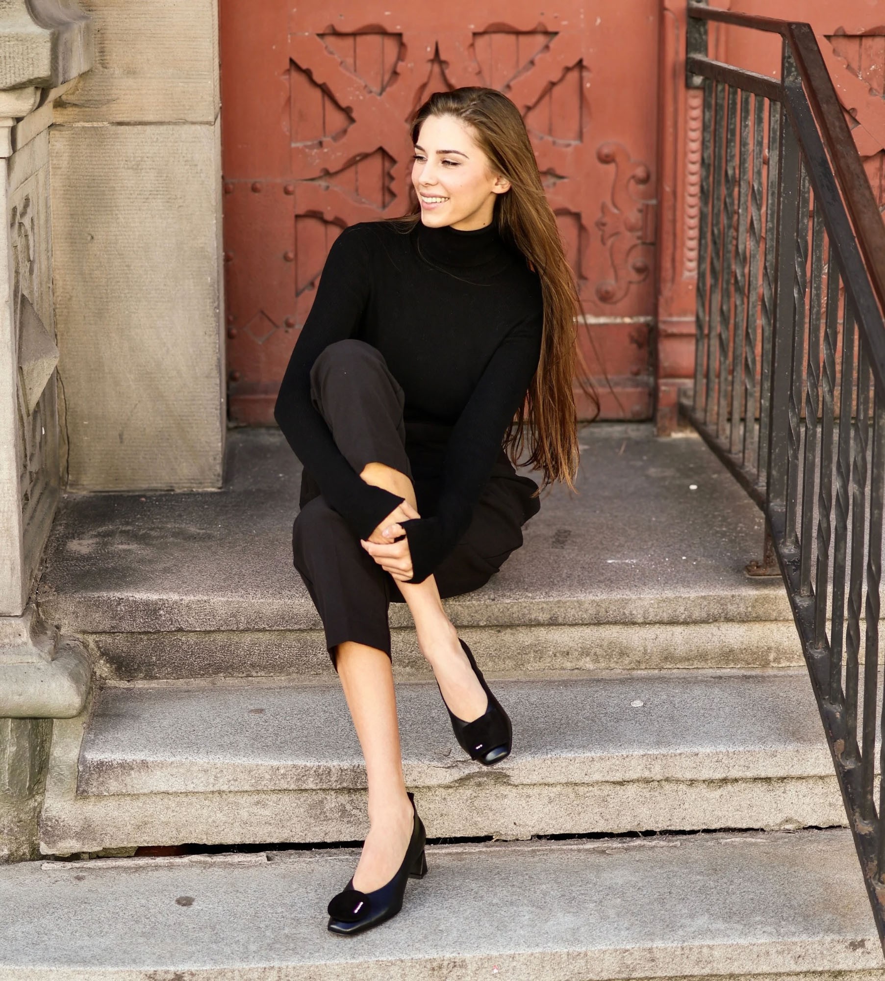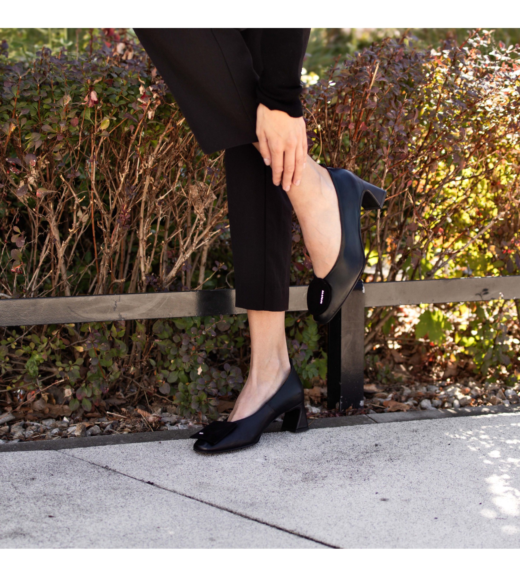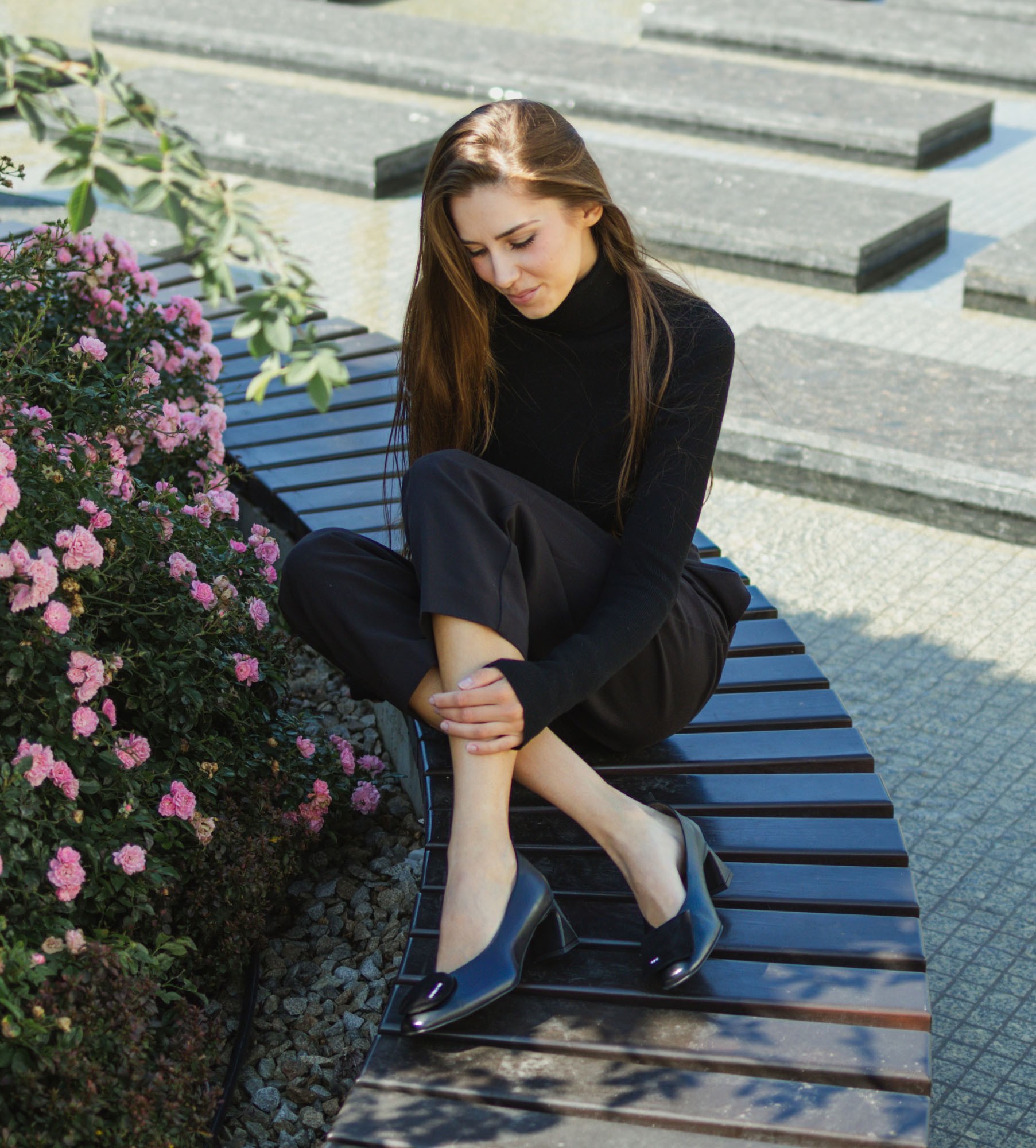 Czarne czółenka połącz z prostymi, wełnianymi spodniami w odcieniu grafitowym i jedwabną bluzką z delikatną stójką w kolorze kości słoniowej. Na ramiona zarzuć beżowy trencz i dodaj torebkę na łańcuszku w odcieniu czekoladowym. Stylizacja elegancka, minimalistyczna i ponadczasowa – idealna na jesienne spacery po mieście, spotkanie biznesowe lub kawę w ulubionej kawiarni.