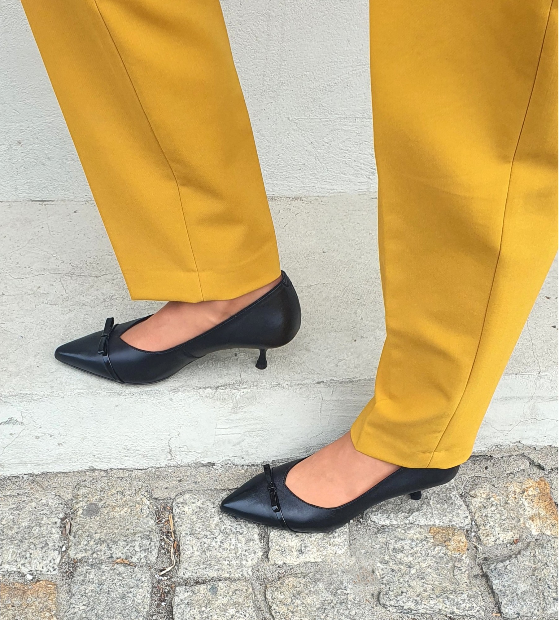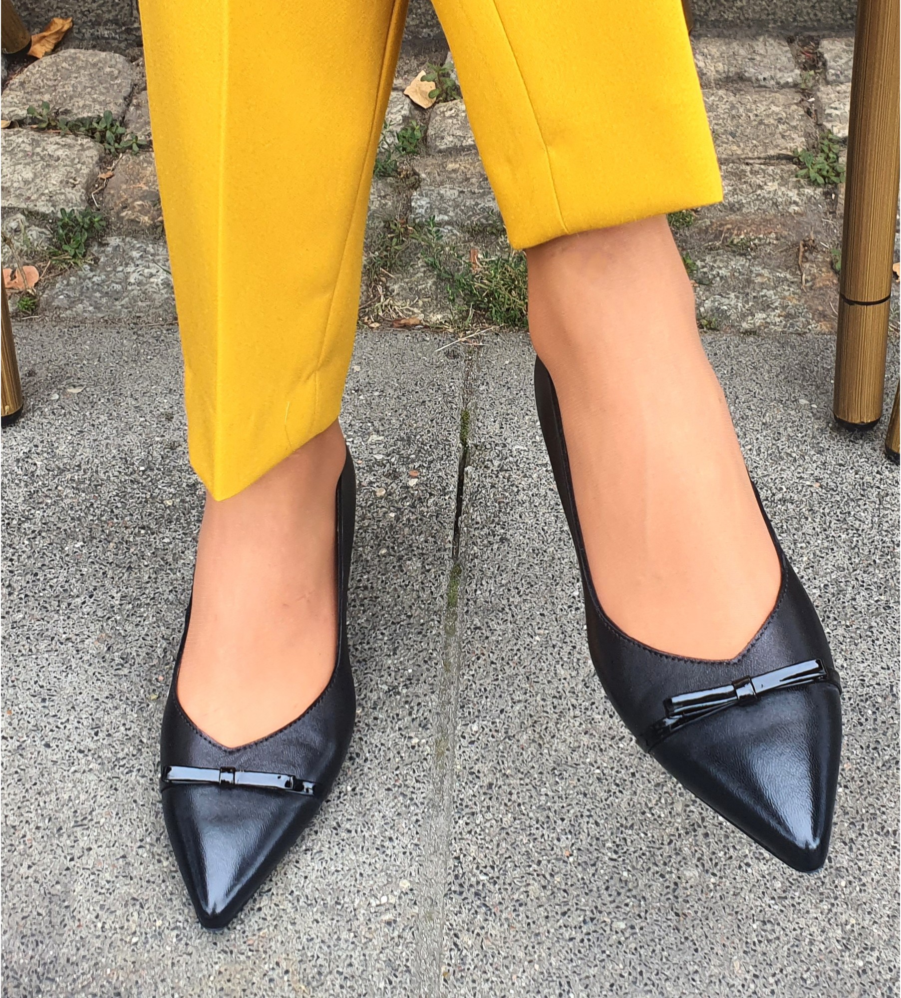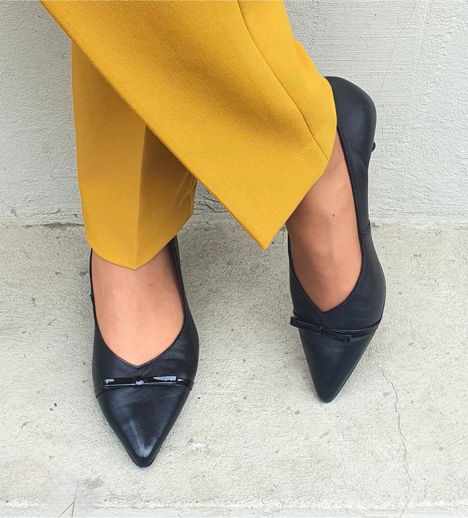 Te czółenka to kwintesencja kobiecego minimalizmu: wykonane z naturalnej skóry, zachwycają subtelnym luksusem i klasyczną formą. Smukły, wąski nosek w kształcie szpica nadaje sylwetce wysmuklający wydźwięk, zachowując jednocześnie harmonię proporcji. Delikatna kokardka z lakierowanej skóry, umieszczona przy linii palców, stanowi subtelny detal, który wzbogaca klasyczny design, nie zaburzając jego minimalistycznej harmonii. Wnętrze wyściełane miękką, naturalną skórą jagnięcą zapewnia komfort i przyjemne dopasowanie do stopy.