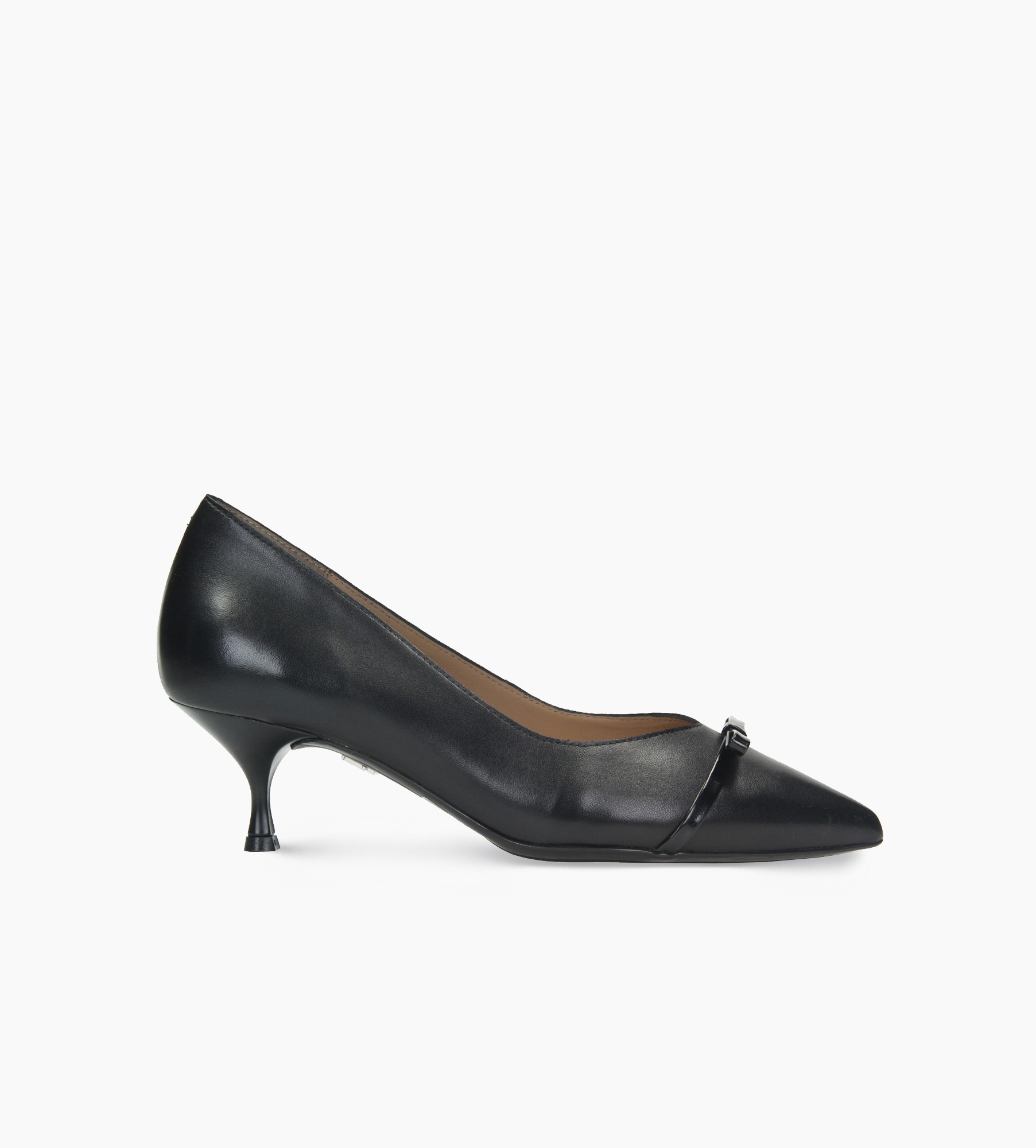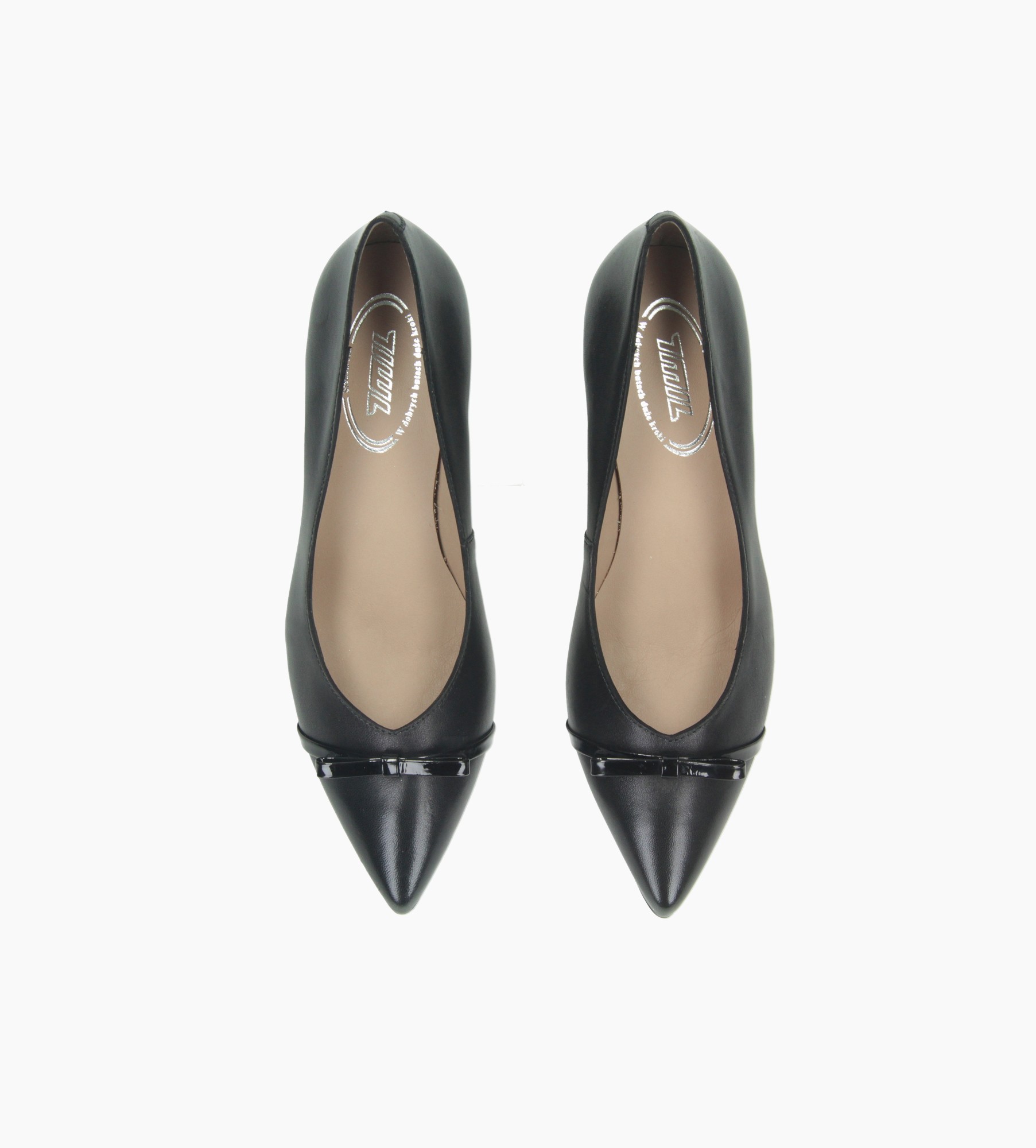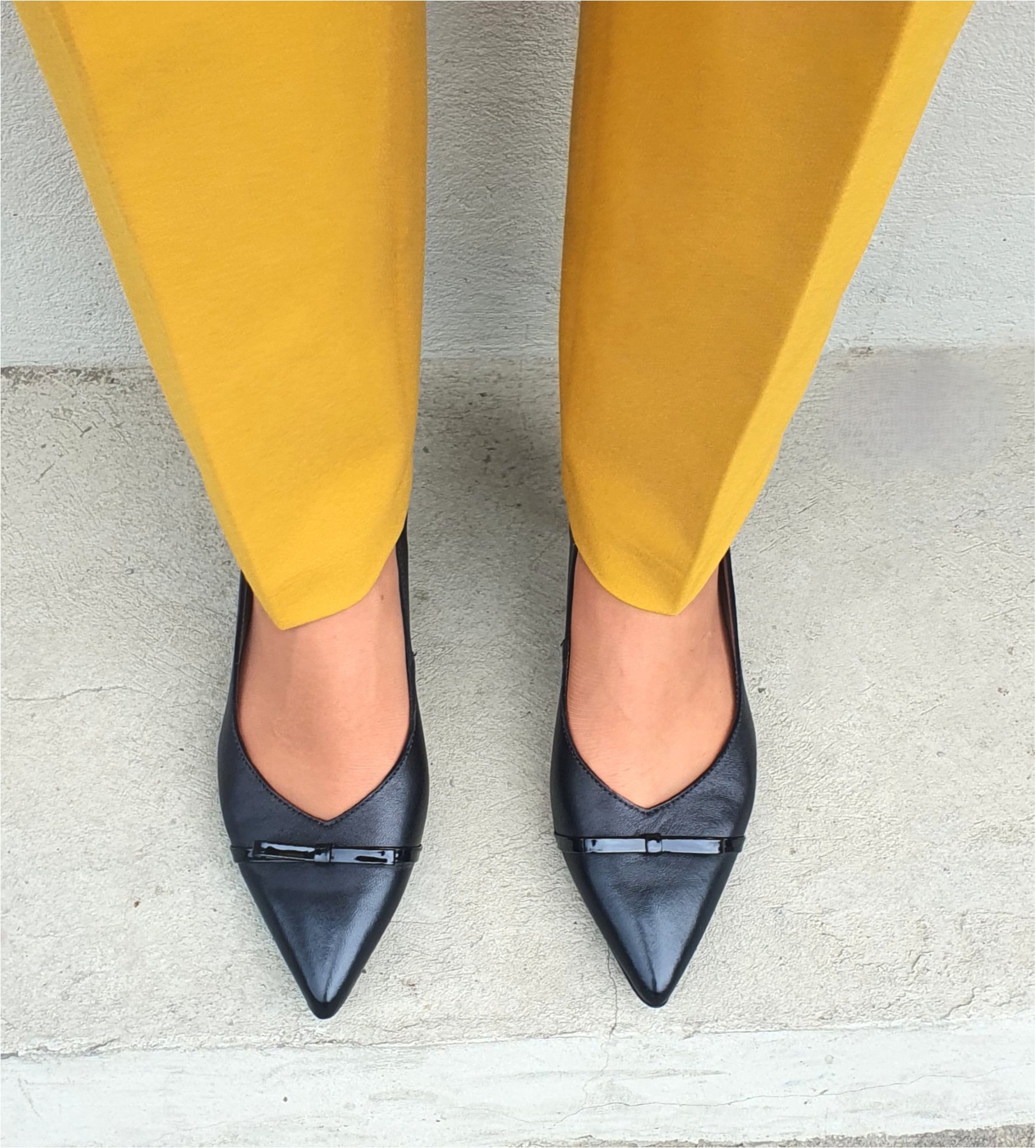 Te czółenka to kwintesencja kobiecego minimalizmu: wykonane z naturalnej skóry, zachwycają subtelnym luksusem i klasyczną formą. Smukły, wąski nosek w kształcie szpica nadaje sylwetce wysmuklający wydźwięk, zachowując jednocześnie harmonię proporcji. Delikatna kokardka z lakierowanej skóry, umieszczona przy linii palców, stanowi subtelny detal, który wzbogaca klasyczny design, nie zaburzając jego minimalistycznej harmonii. Wnętrze wyściełane miękką, naturalną skórą jagnięcą zapewnia komfort i przyjemne dopasowanie do stopy.