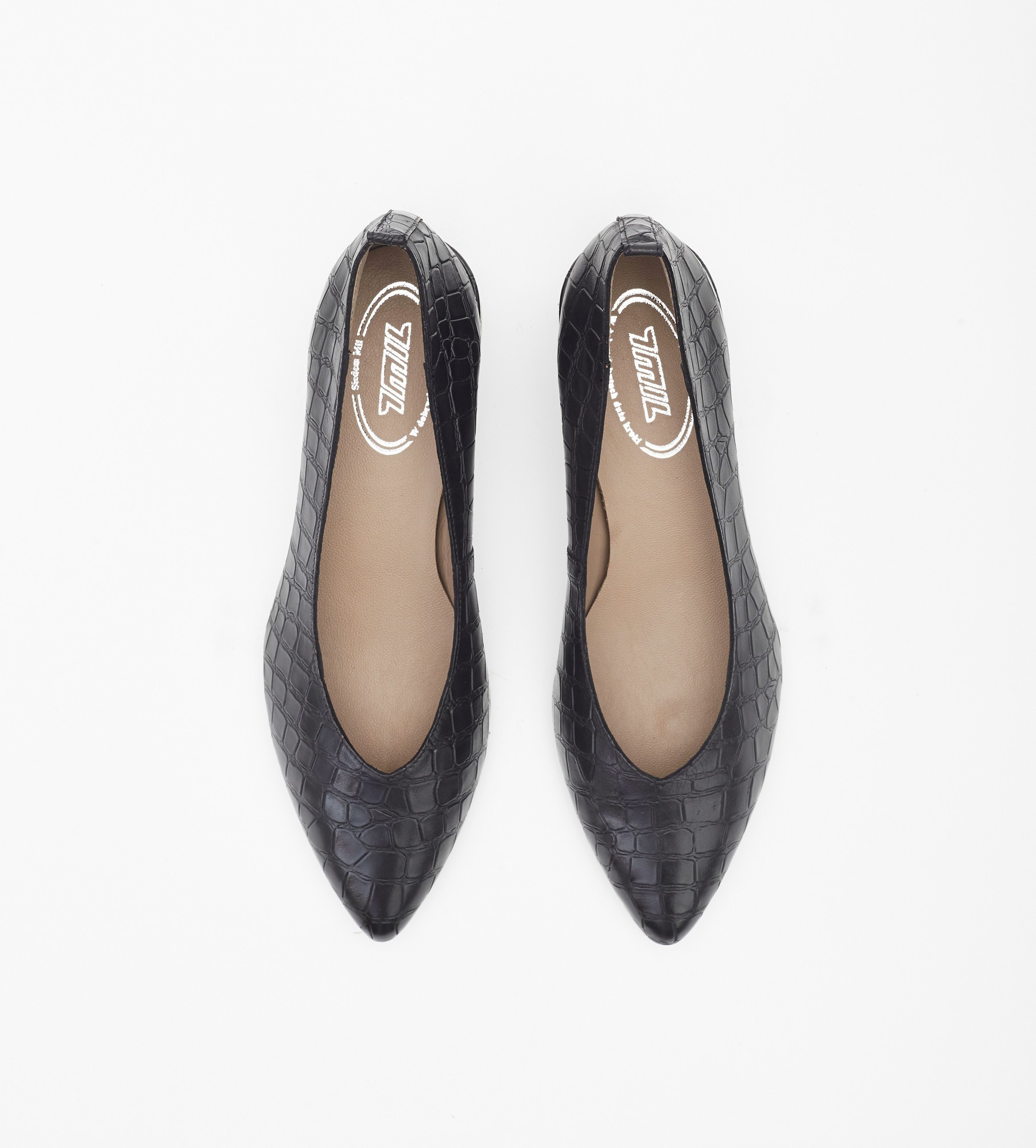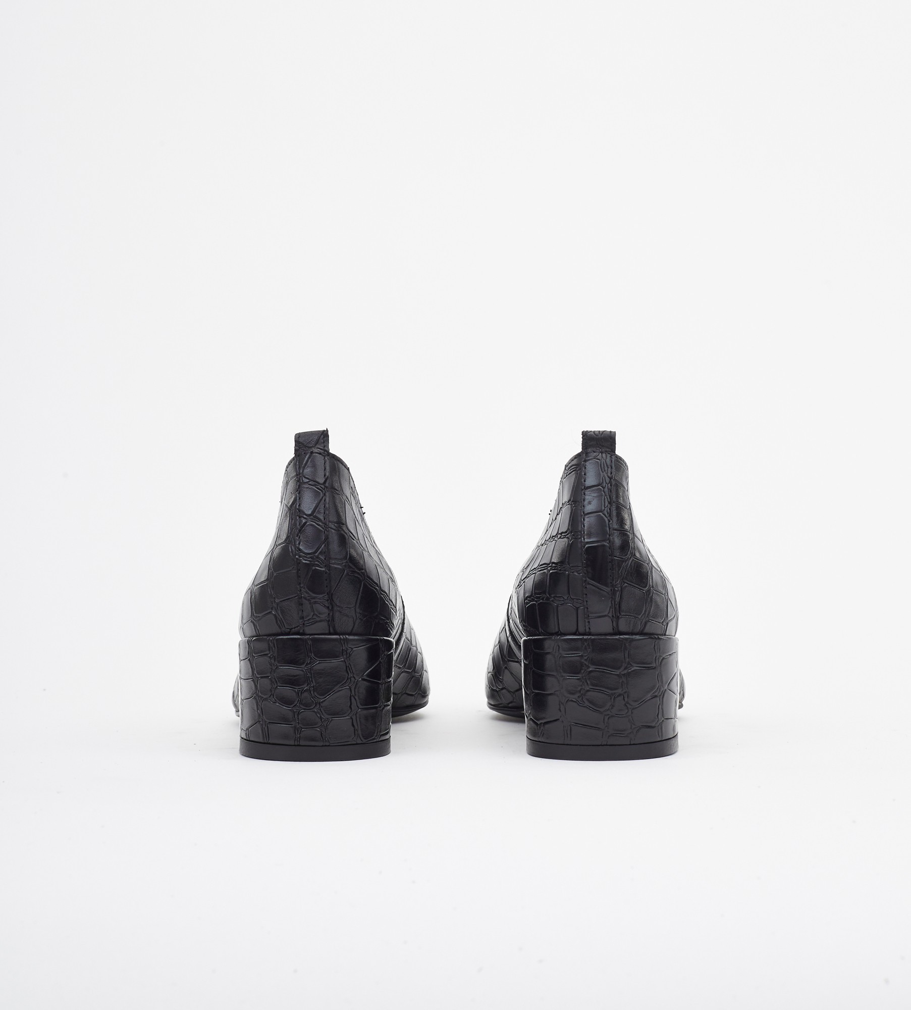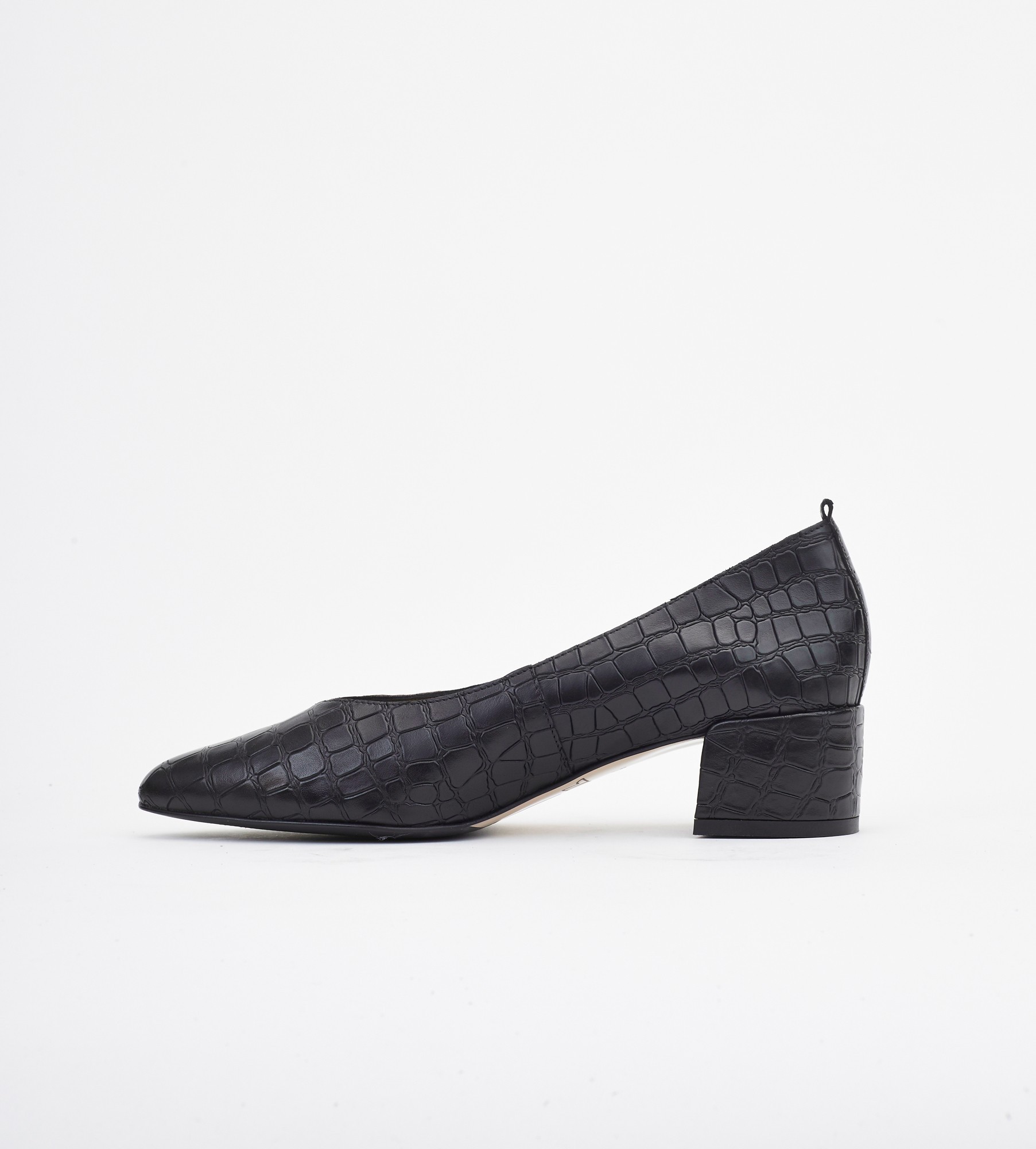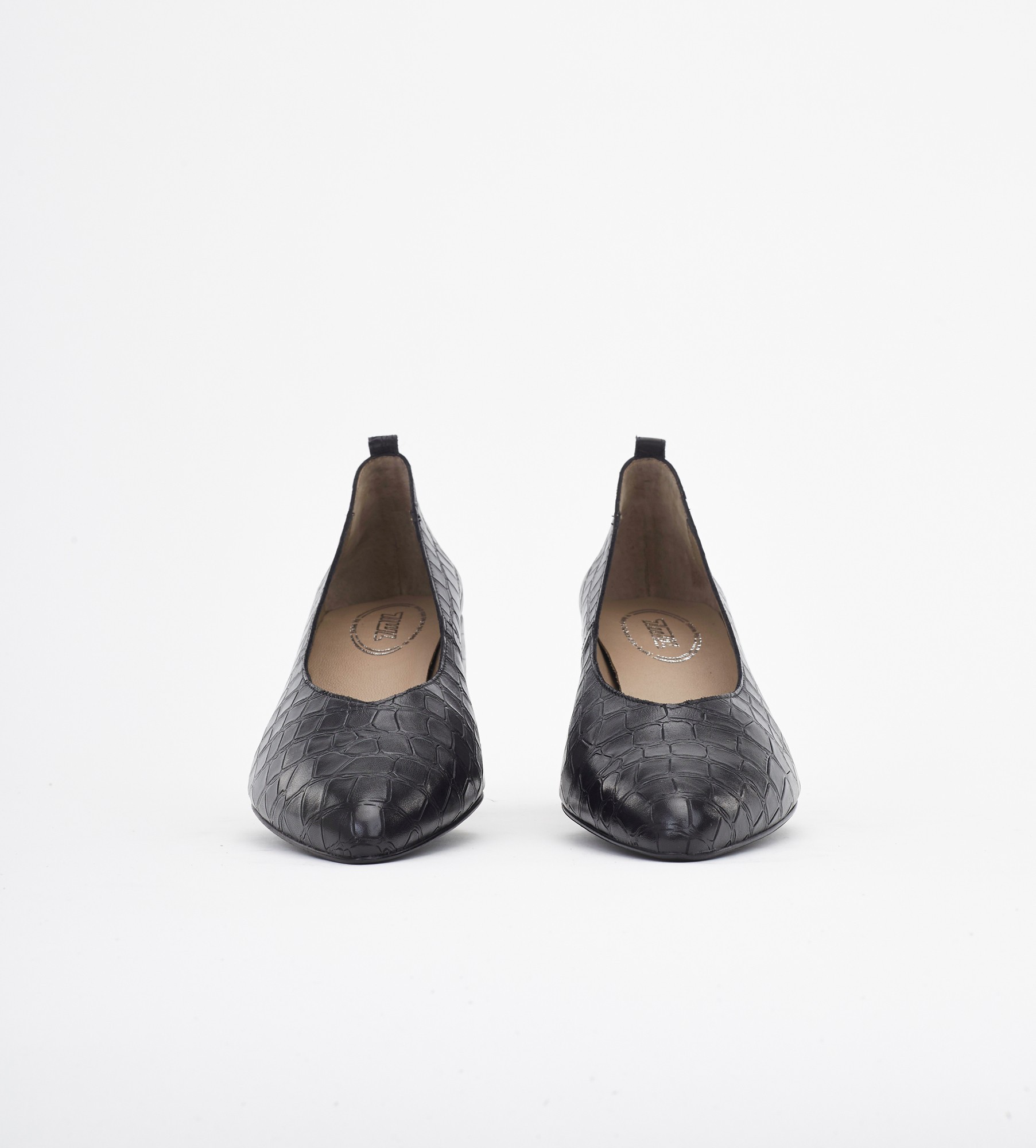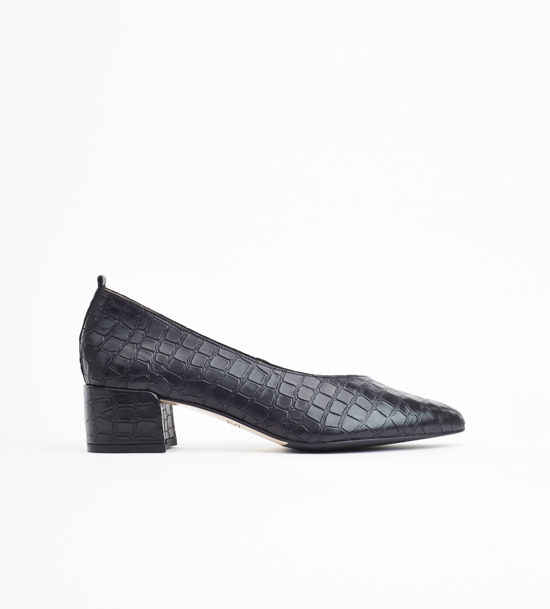 Czółenka damskie w kolorze czarnym z naturalnej skóry cielęcej imitującej delikatny wzór krokodyla i kobiecym wycięciem, wyróżniają się elegancją i wysoką jakością wykonania. Wnętrze buta wyścielono delikatną, naturalną skórą jagnięcą, która nie tylko jest przyjemna w dotyku, ale również zapewnia komfort użytkowania przez cały dzień. Miękka, skórzana wkładka dopasowuje się do kształtu stopy, gwarantując idealne dopasowanie. Czółenka posiadają wygodny stabilny obcas o wysokości 5 cm. Klasyka , którą każda kobieta powinna mieć w swoej szafie, dodając szyku i profesjonalizmu każdej stylizacji