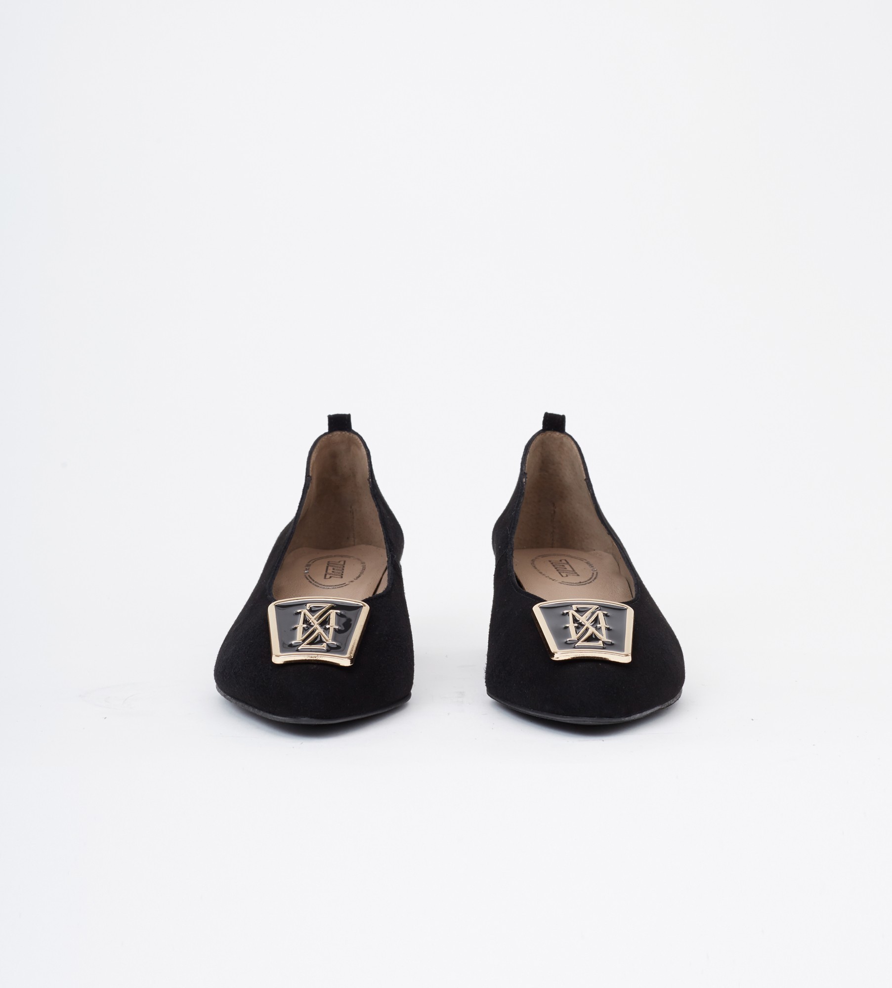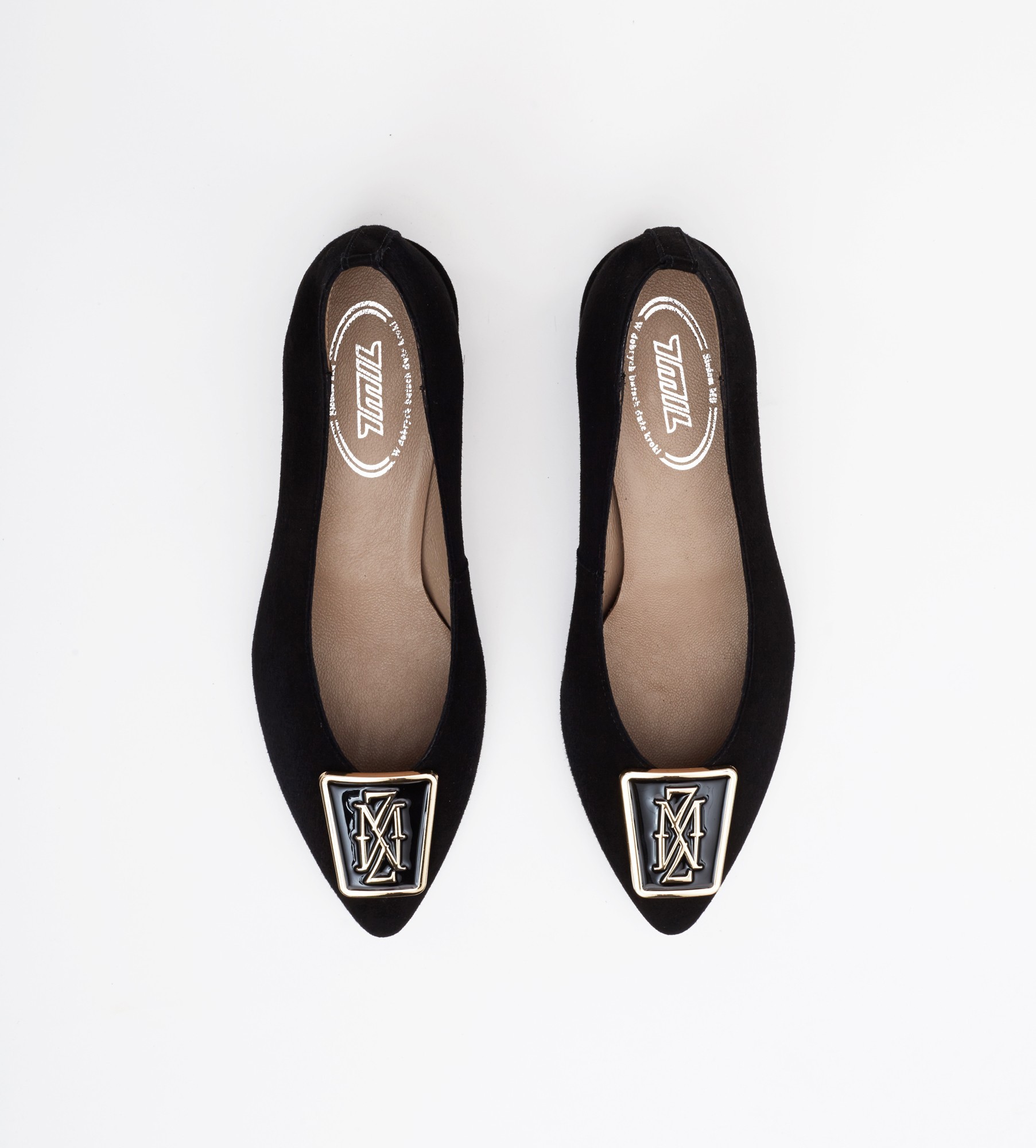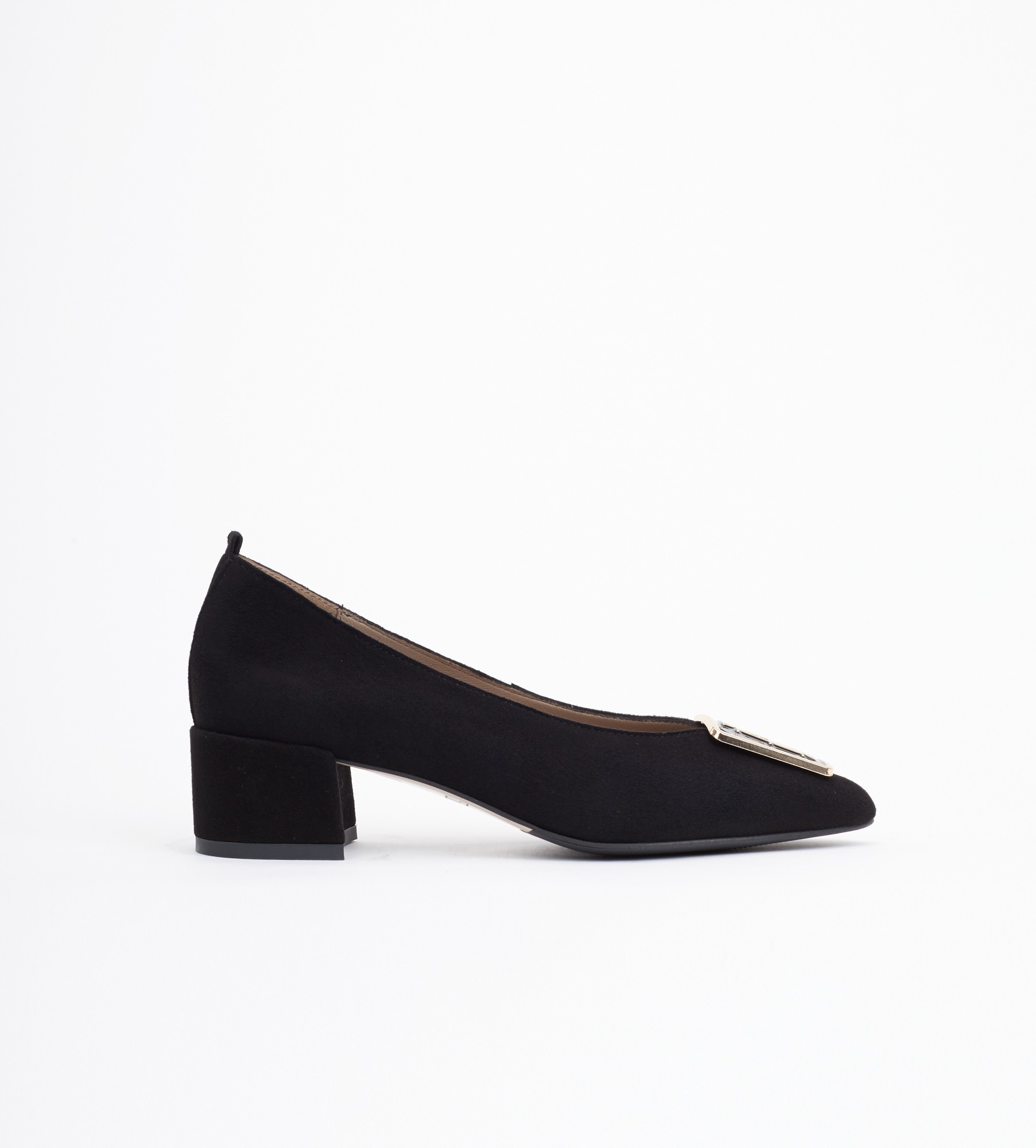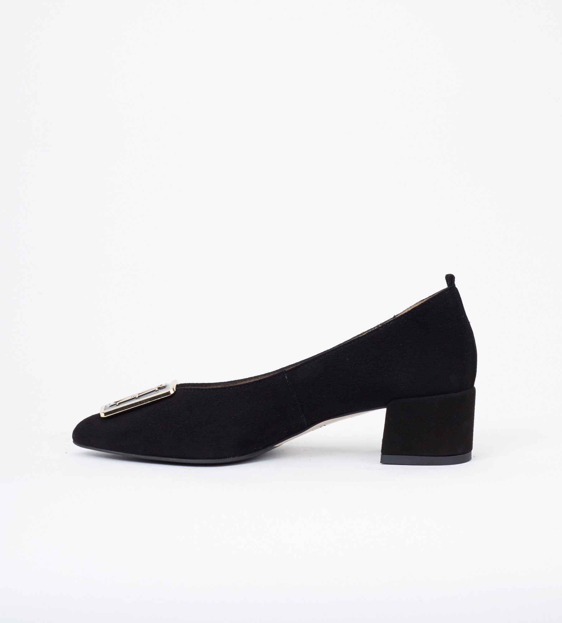 Eleleganckie czółenka damskie z naturalnej skóry zamszowej, idealne na każdą okazję. Te klasyczne buty w czarnym kolorze charakteryzują się cholewką wykonaną z naturalnej, jagnięcej skóry, która gwarantuje wygodę i komfort w codziennym użytkowaniu. Wnętrze buta oraz wkładka są wykonane z miękkiej skóry jagnięcej, zapewniając komfort noszenia przez cały dzień. Stabilny obcas o wysokości 5 cm oraz złoto-czarna ozdoba dodają elegancji i szyku. Czółenka to połączenie klasyki z nowoczesnym stylem.