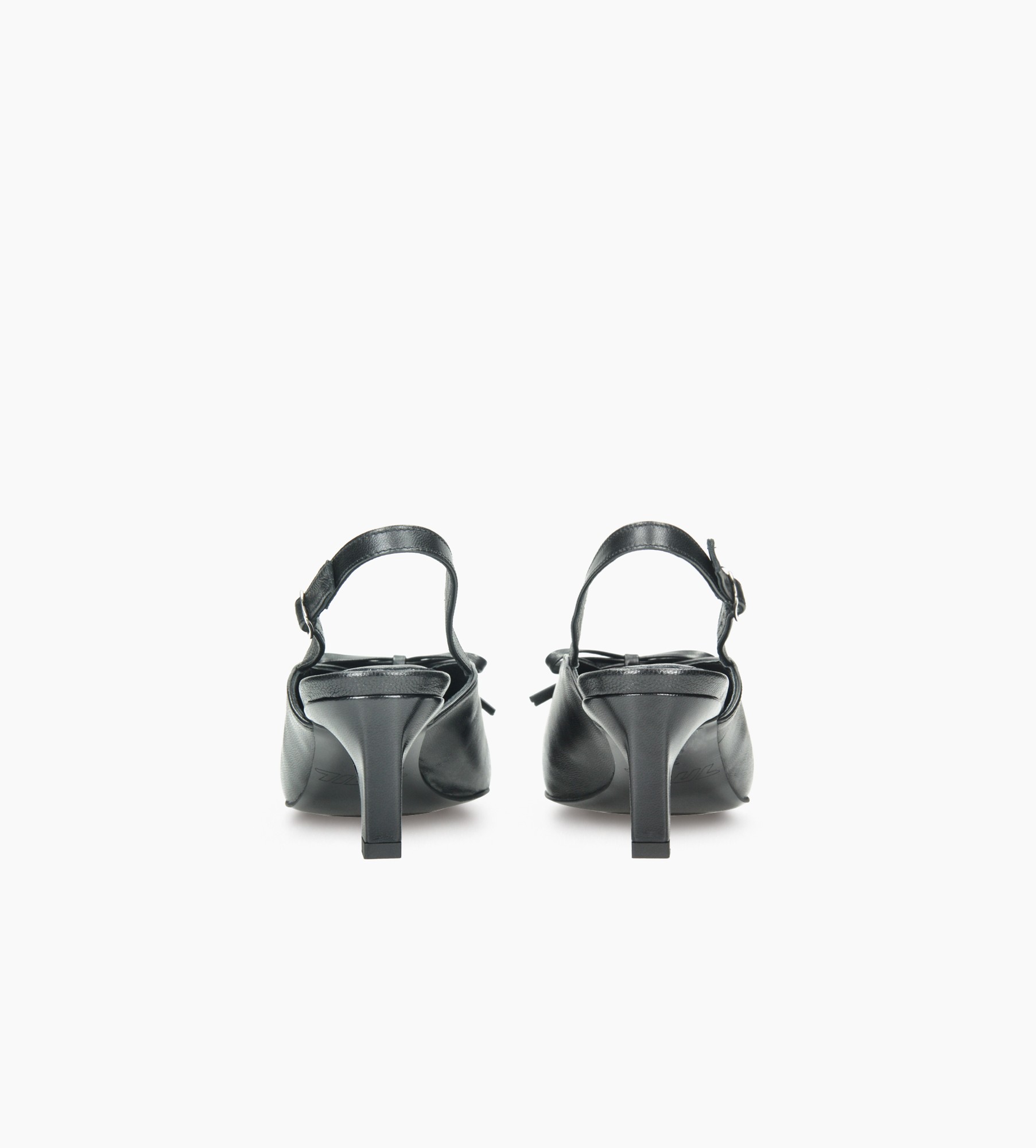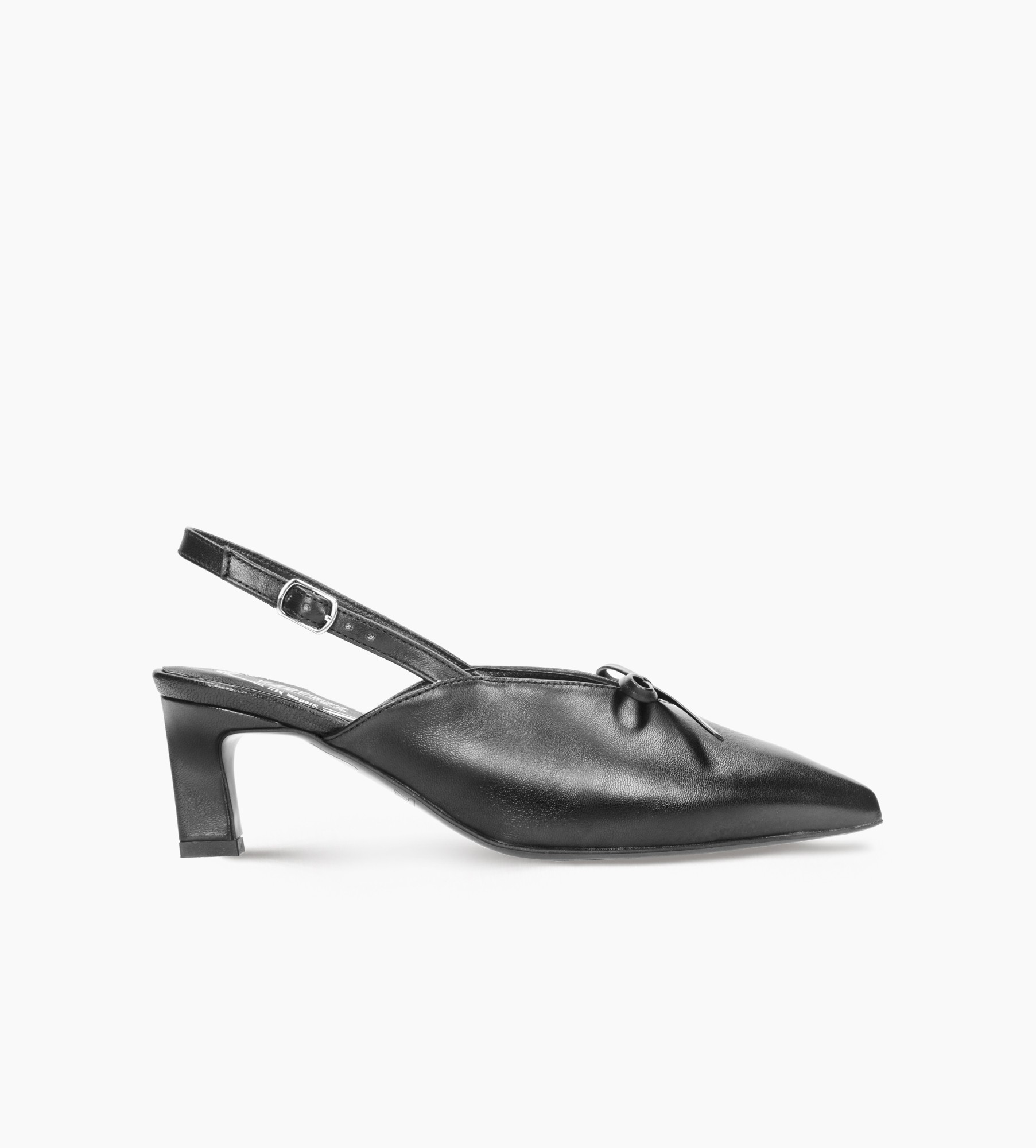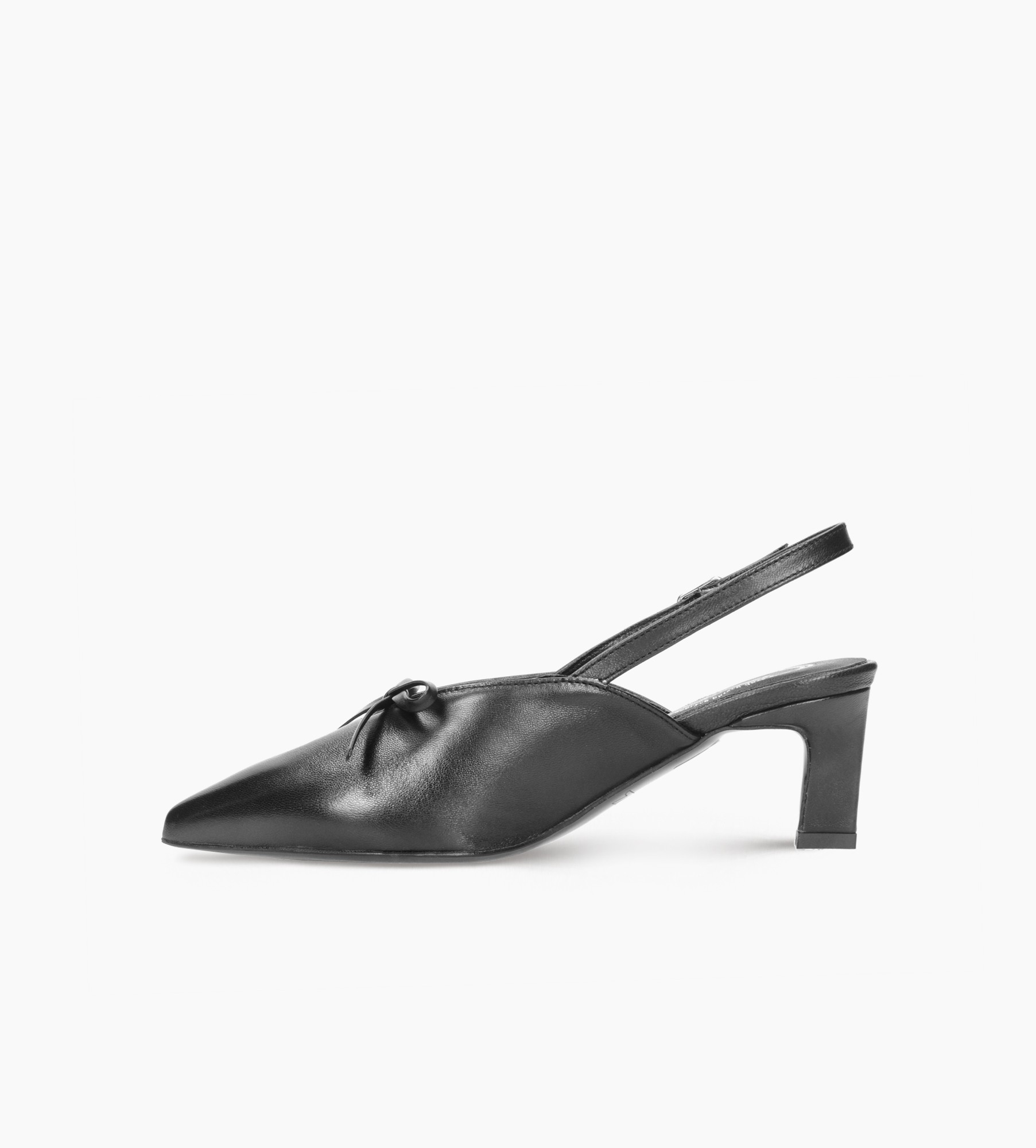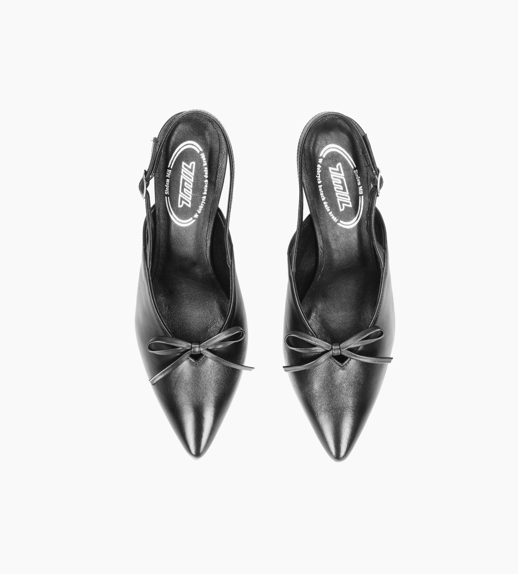 Czółenko to elegancki i ponadczasowy model, wykonany z naturalnej, gładkiej skóry w klasycznym odcieniu głębokiej czerni. But posiada wydłużony nosek w delikatny szpic, który subtelnie wysmukla stopę i dodaje sylwetce lekkości. Model osadzony jest na stabilnym, średniej wysokości obcasie typu słupek, zapewniającym komfort noszenia przez cały dzień. Regulowany pasek na pięcie gwarantuje dobre dopasowanie i trzymanie stopy, a niewielka, kobieca kokardka na przodzie dodaje czółenku uroku i subtelnej lekkości.