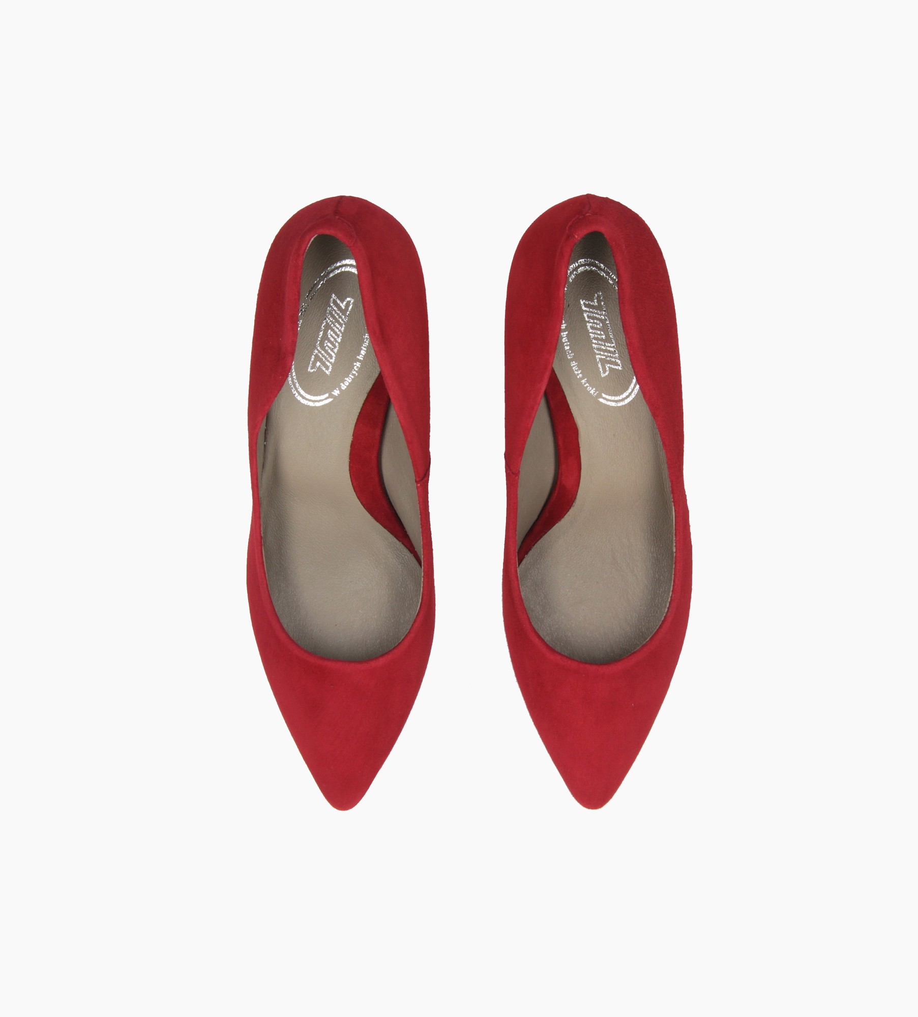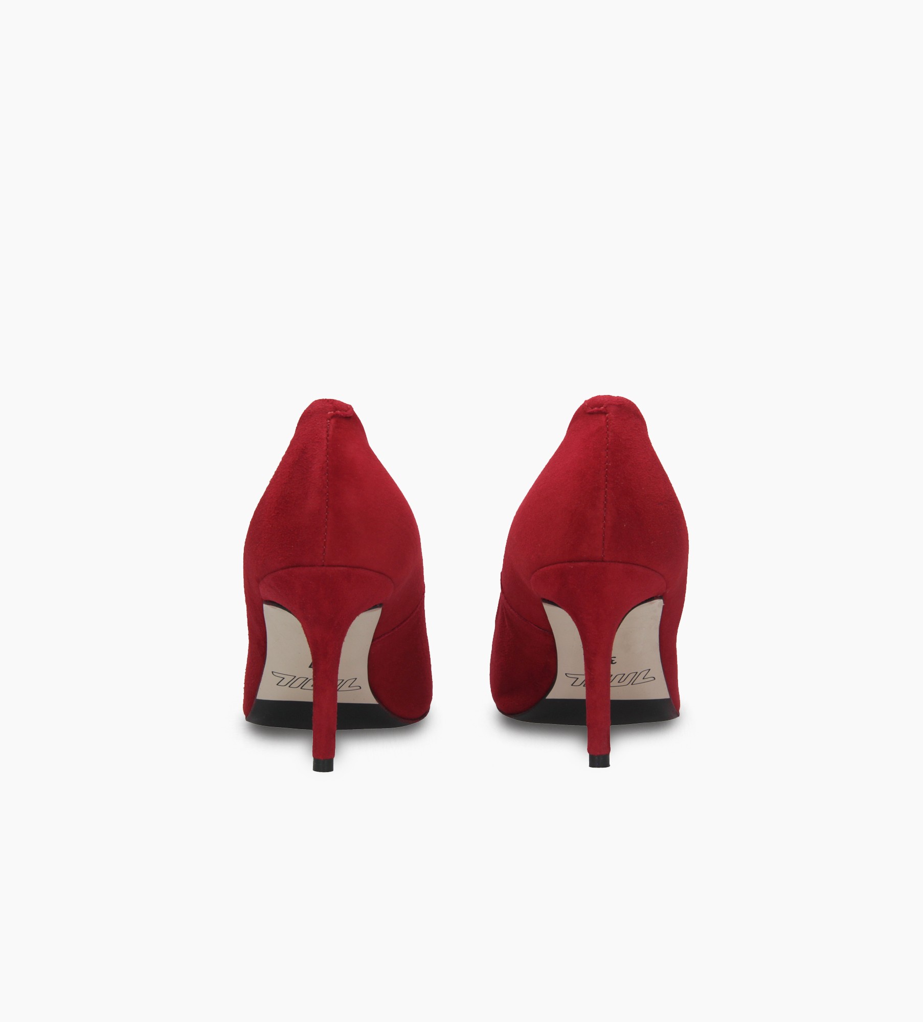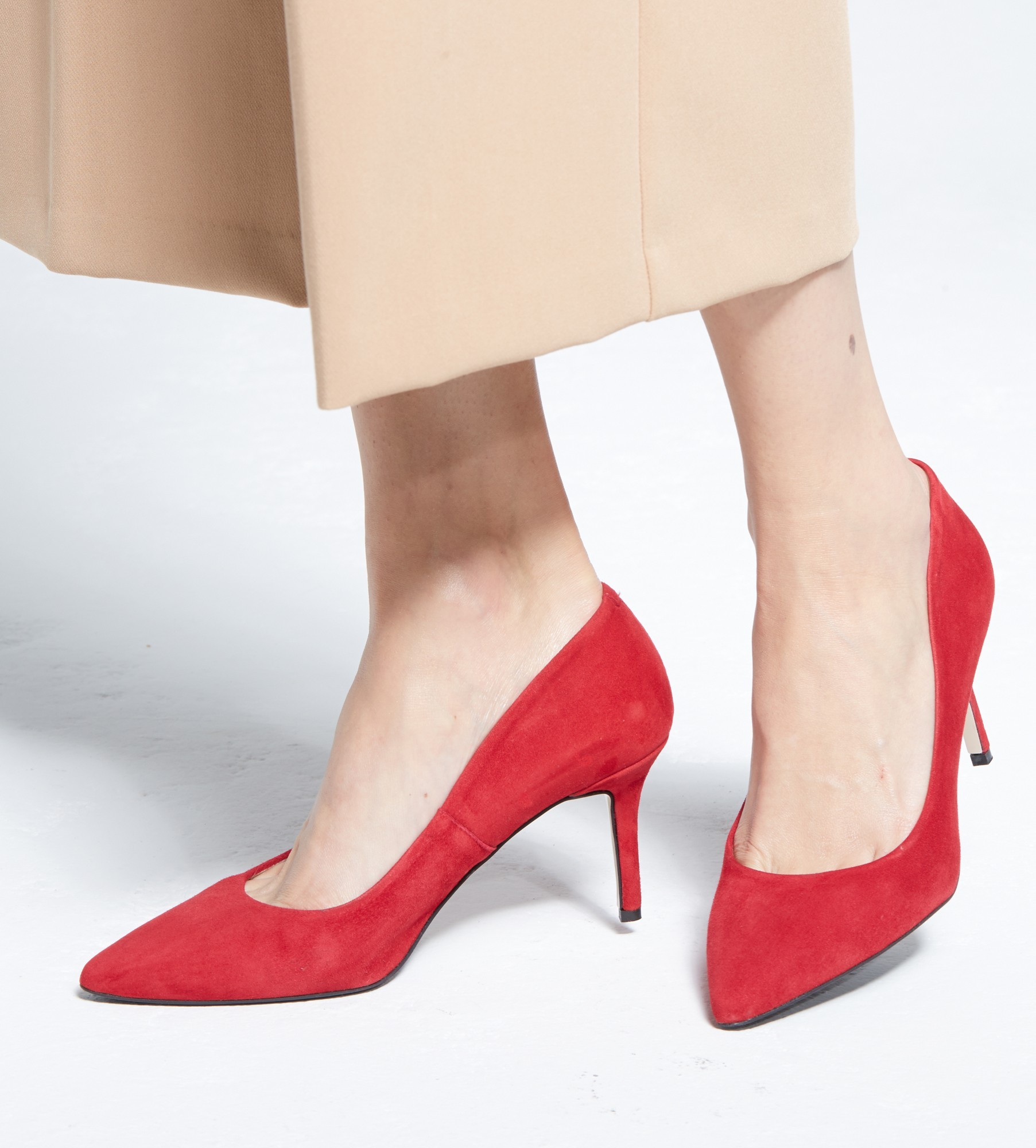 Klasyczne czółenka na szpilce w intensywnym, uwodzicielskim czerwonym kolorze. Ich cholewka z miękkiej naturalnej, zamszowej skóry emanuje subtelnością, podkreślając jednocześnie Twój wyjątkowy gust. Wnętrze butów wyściełane jest naturalną skórą jagnięcą, która otacza stopę delikatnością i zapewnia niezrównany komfort przez cały dzień. Szpilka o wysokości 8 centymetrów nie tylko dodaje butom elegancji, ale również subtelnie wydłuża sylwetkę.