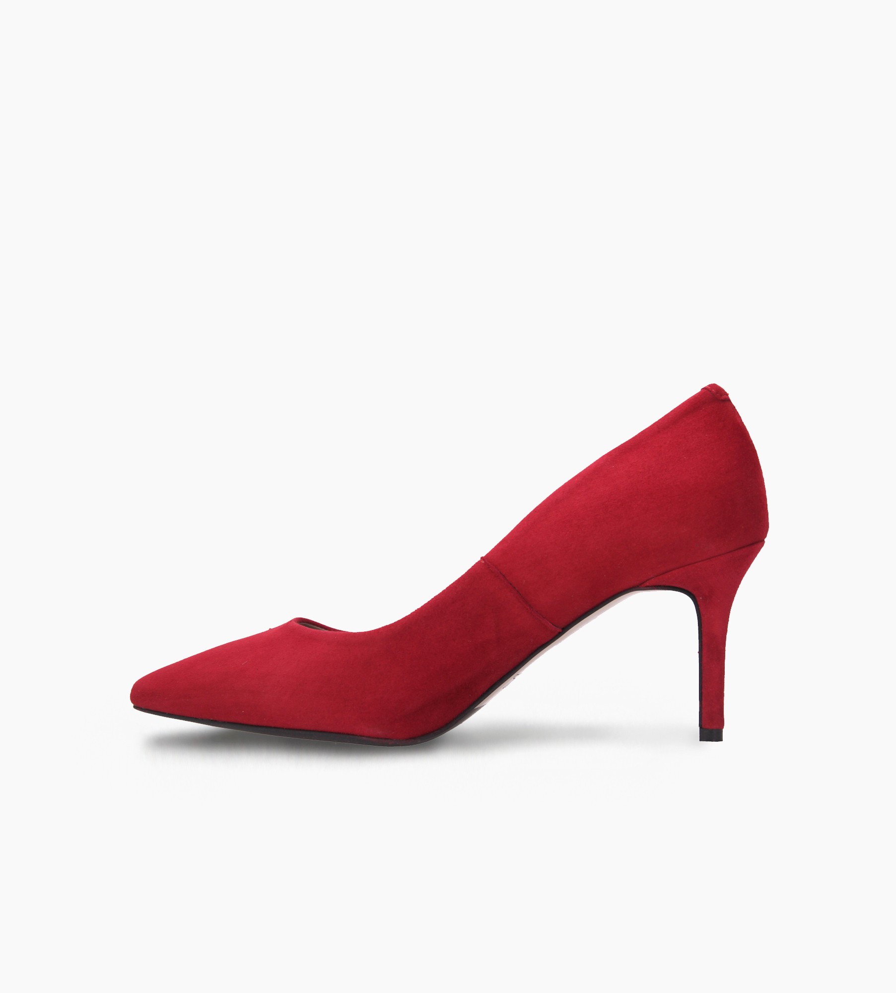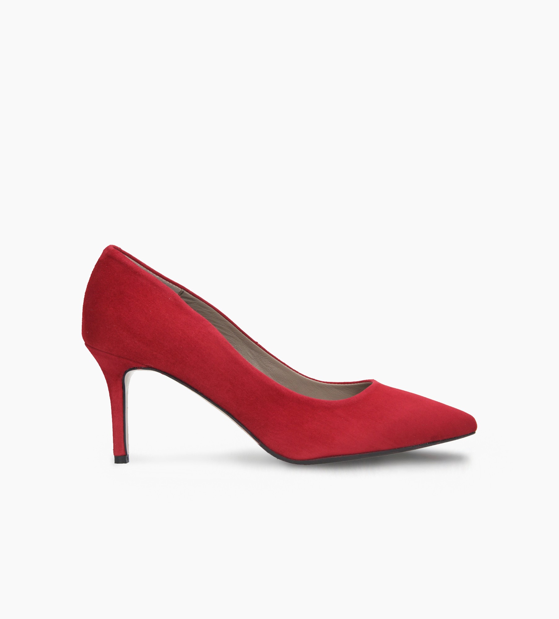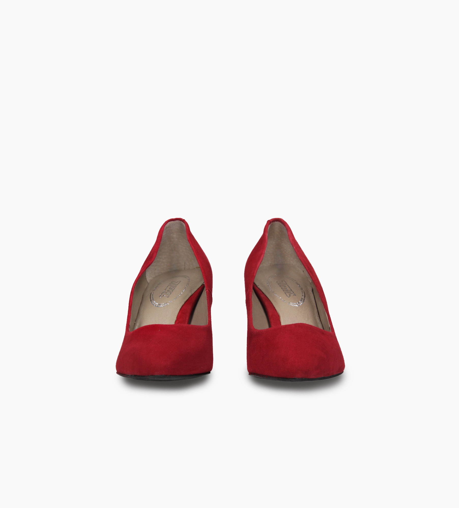 Klasyczne czółenka na szpilce w intensywnym, uwodzicielskim czerwonym kolorze. Ich cholewka z miękkiej naturalnej, zamszowej skóry emanuje subtelnością, podkreślając jednocześnie Twój wyjątkowy gust. Wnętrze butów wyściełane jest naturalną skórą jagnięcą, która otacza stopę delikatnością i zapewnia niezrównany komfort przez cały dzień. Szpilka o wysokości 8 centymetrów nie tylko dodaje butom elegancji, ale również subtelnie wydłuża sylwetkę.