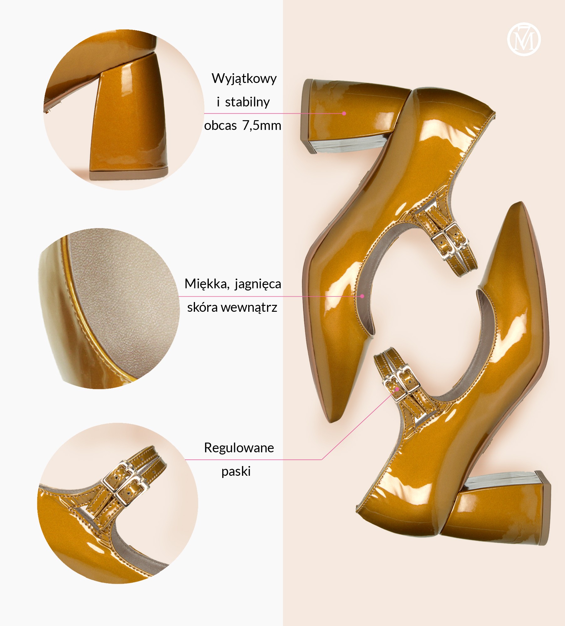 Złote czółenka damskie to wyjątkowy wybór dla kobiet, które pragną dodać swoim stylizacjom blasku i elegancji. Wykonane z najwyższej jakości naturalnej skóry lakierowanej, charakteryzują się lśniącym, metalicznym wykończeniem, które przyciąga wzrok i dodaje każdemu strojowi luksusowego akcentu. Smukły, stabilny obcas nie tylko podkreśla sylwetkę, ale także zapewnia komfort noszenia przez cały dzień. Te czółenka są idealnym wyborem na wyjątkowe okazje, takie jak wieczorne wyjścia czy uroczystości, gdzie liczy się efektowny wygląd.
