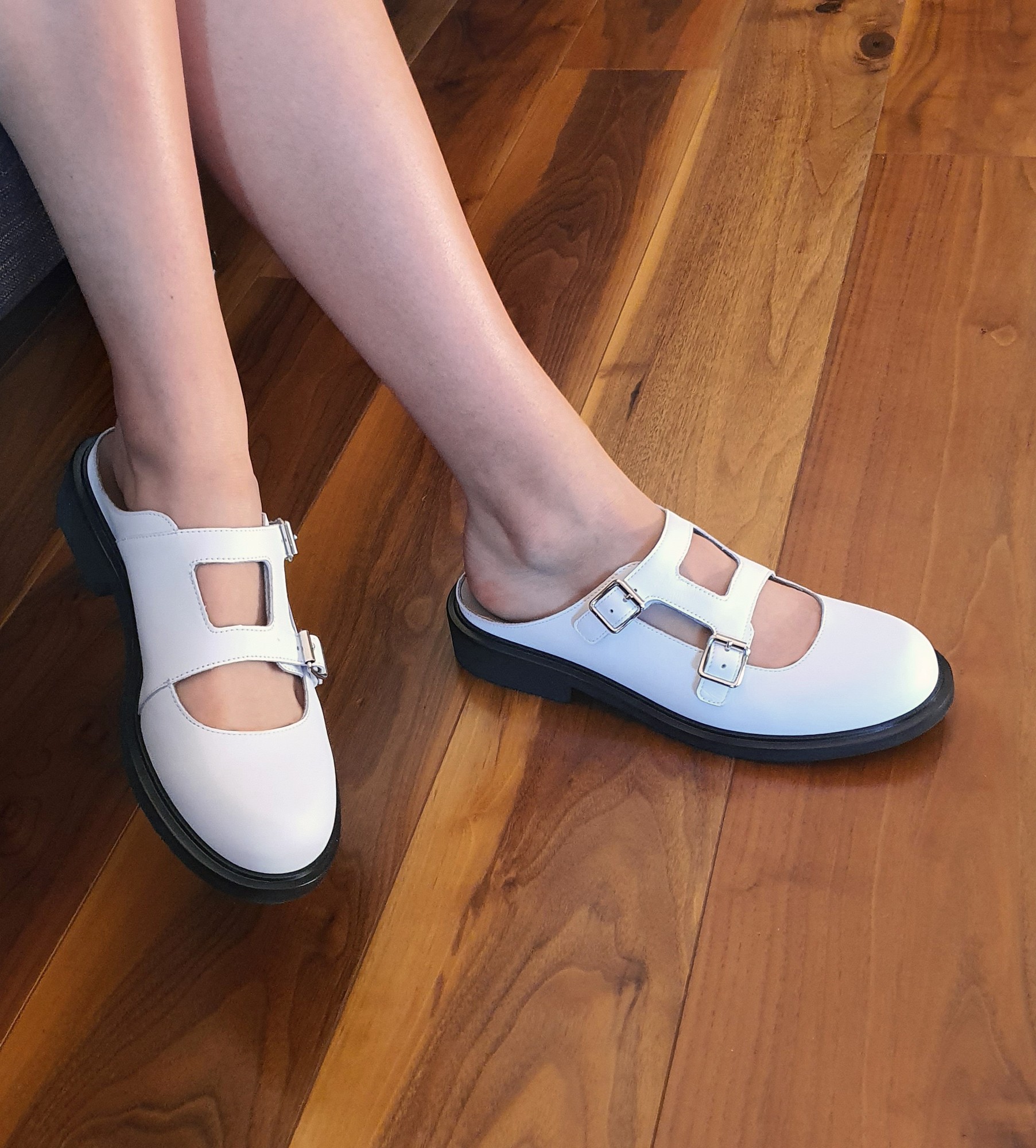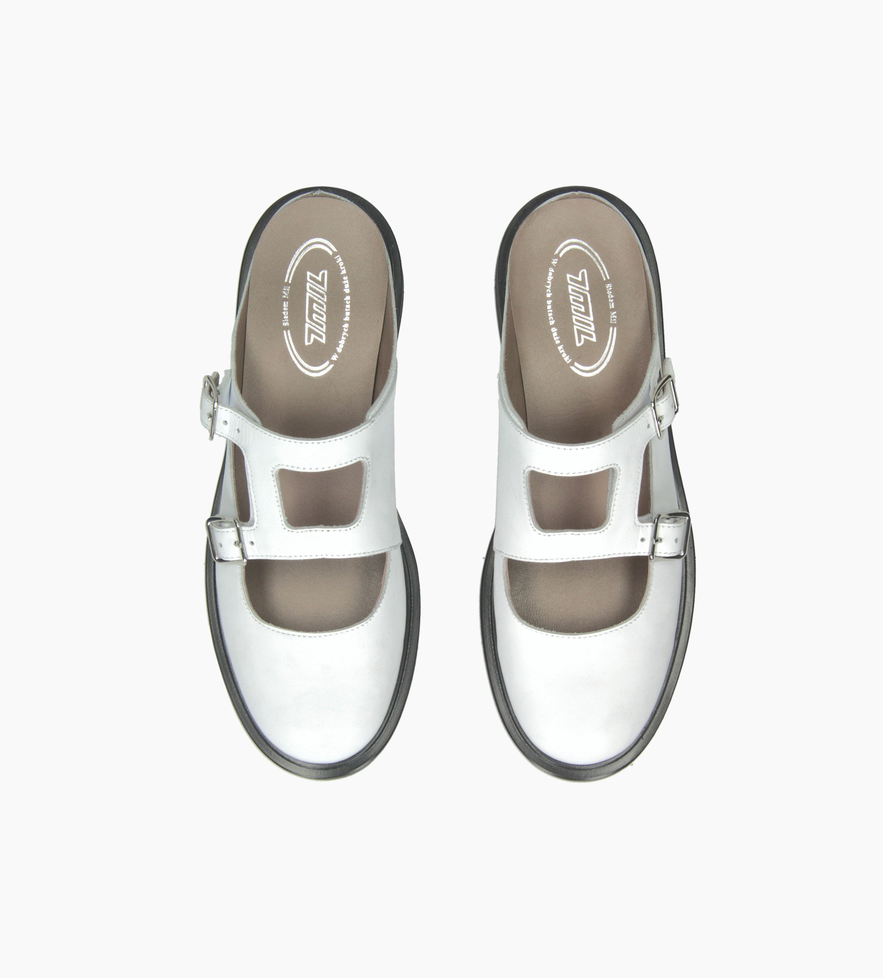 Białe klapki damskie wyróżniają się unikatowym, nieco retro designem inspirowanym klasycznymi mary janes, jednak w nowoczesnym, letnim wydaniu. Wykonane zostały z naturalnej skóry licowej, która prezentuje się elegancko, a zarazem zapewnia trwałość i odporność na codzienne użytkowanie. Wnętrze wyściełane jest miękką skórą jagnięcą, co gwarantuje wyjątkowy komfort oraz przewiewność – idealne na cieplejsze dni. Model posiada dwie charakterystyczne klamry z możliwością regulacji, które nie tylko dodają charakteru, ale również pozwalają dopasować buty do stopy. Otwarte pięty zapewniają swobodę i lekkość, a wycięcia na podbiciu nadają butom nowoczesnej lekkości.