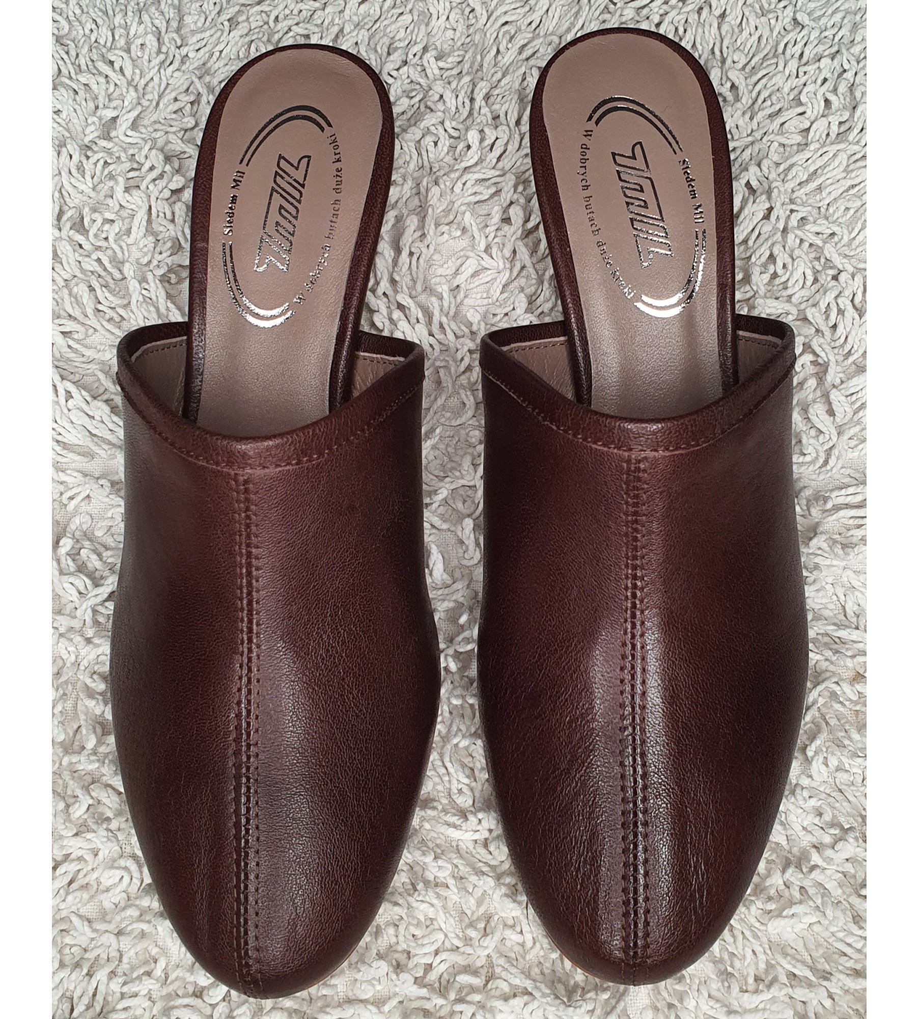 Wnętrze butów wyściełane jest miękką skórą jagnięcą, która zapewnia komfort przez cały dzień. Klapki osadzone są na nowoczesnym, niskim obcasie typu „kitten heel”, który nie tylko dodaje sylwetce lekkości, ale też gwarantuje stabilność i wygodę kroku.Delikatne przeszycie wzdłuż cholewki wprowadza nutę eleganckiego minimalizmu, czyniąc ten model idealnym uzupełnieniem stylizacji biurowych, miejskich i półformalnych.