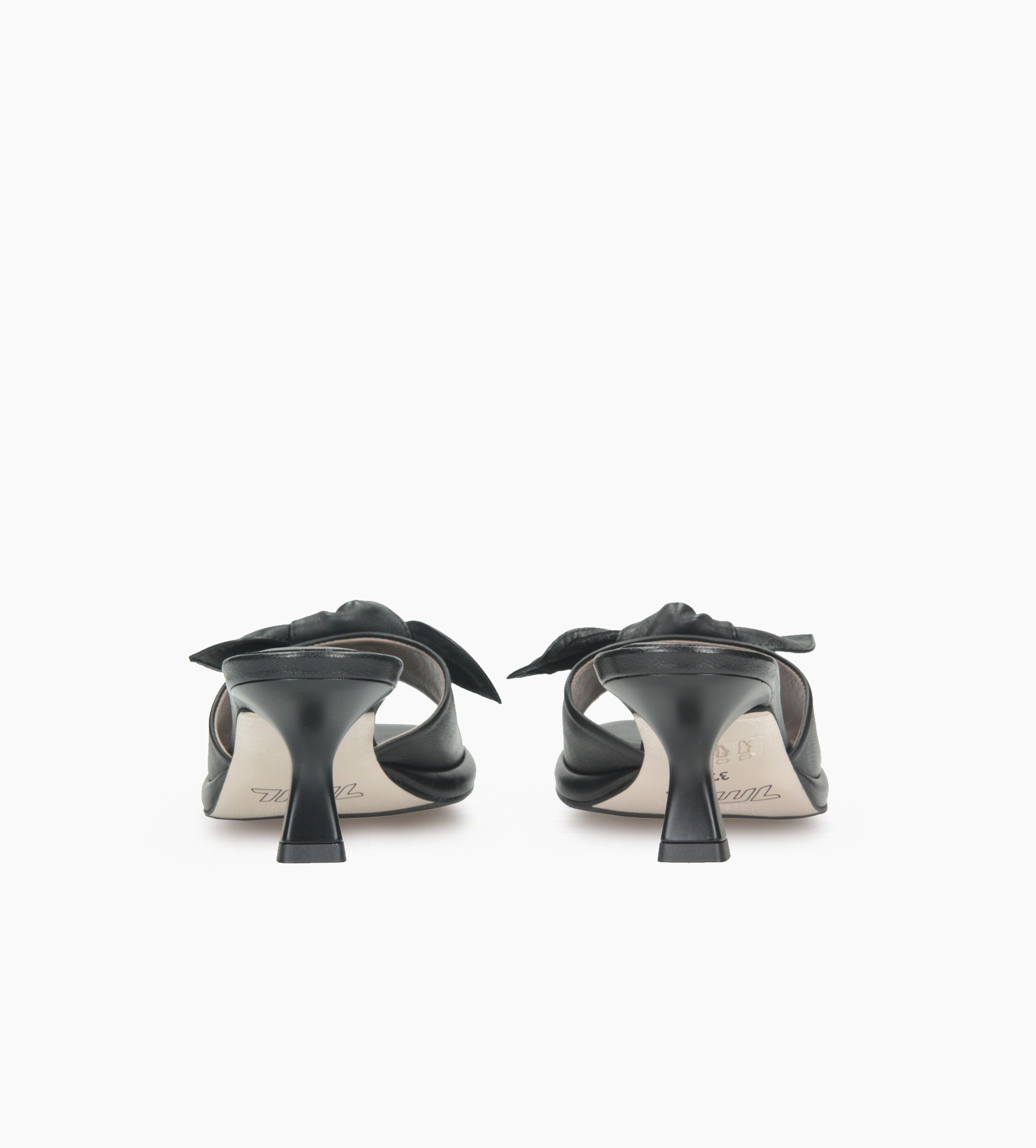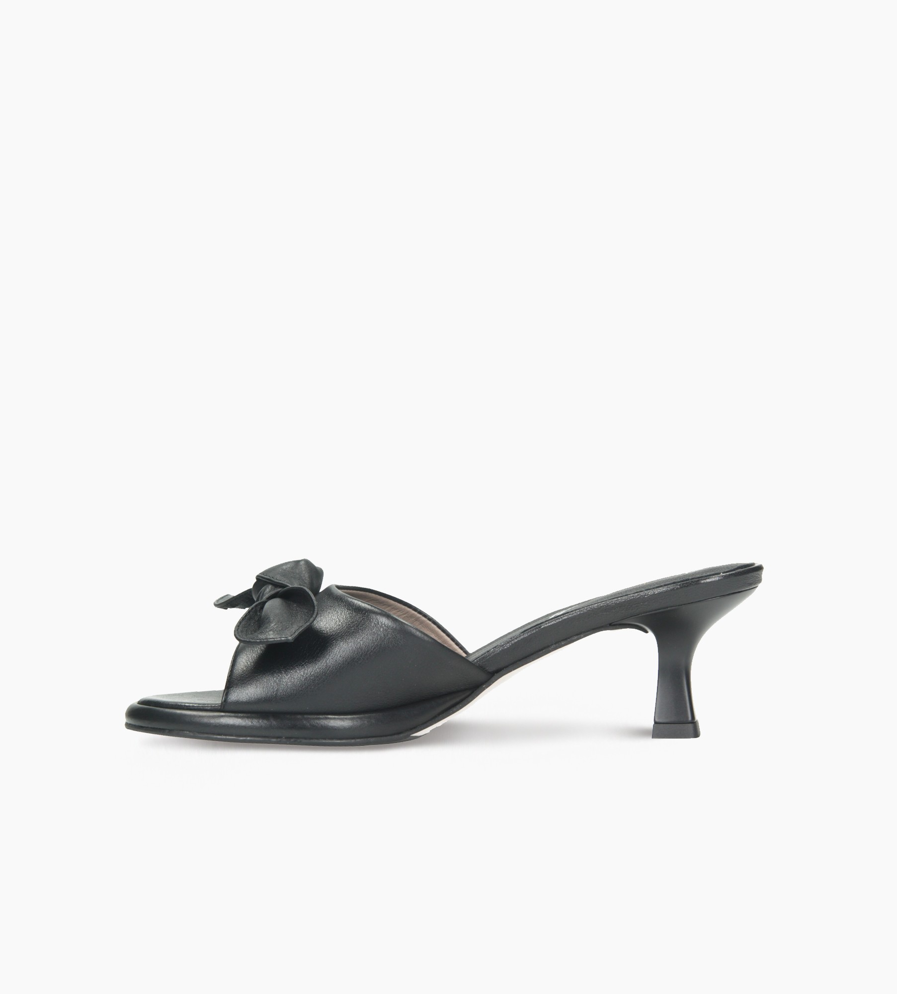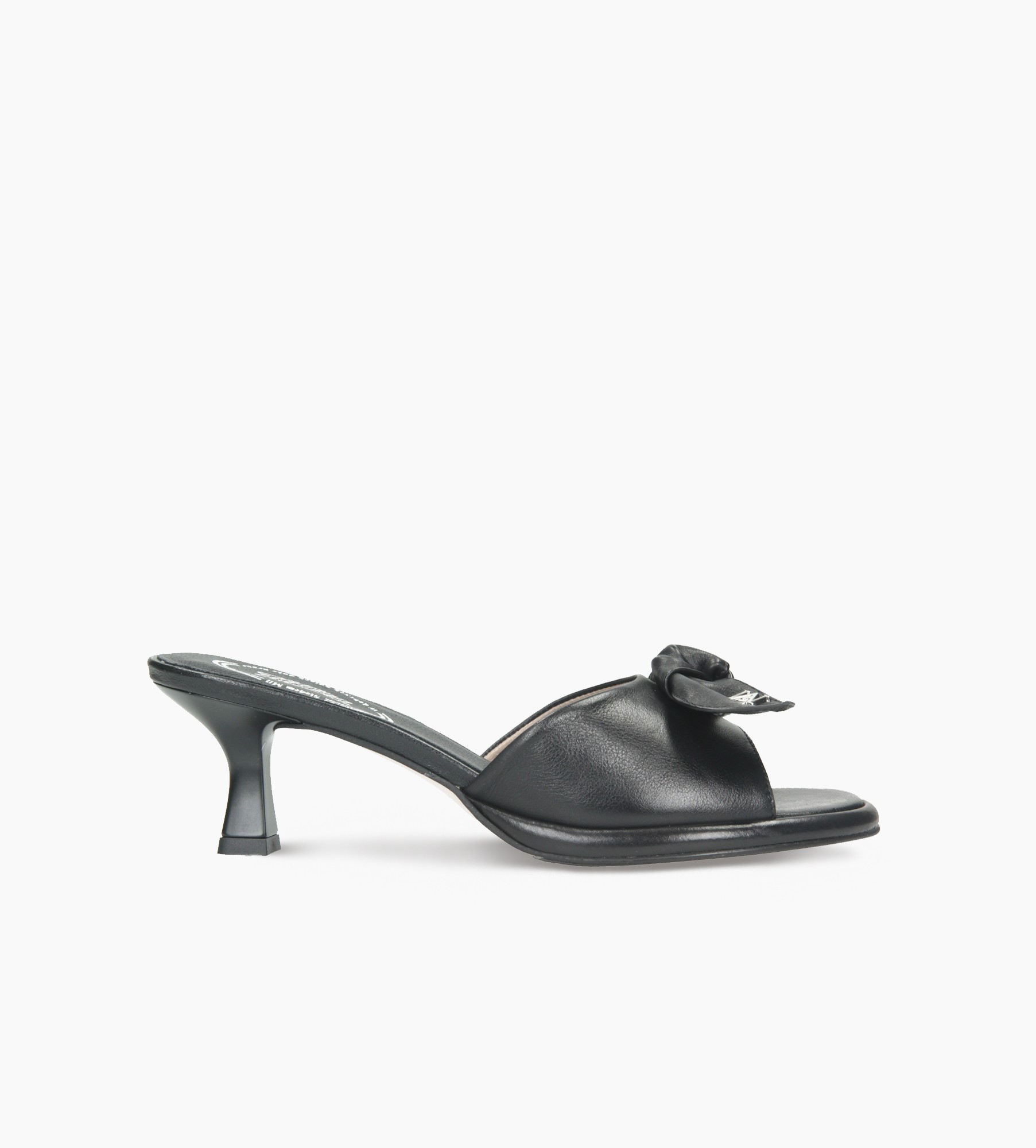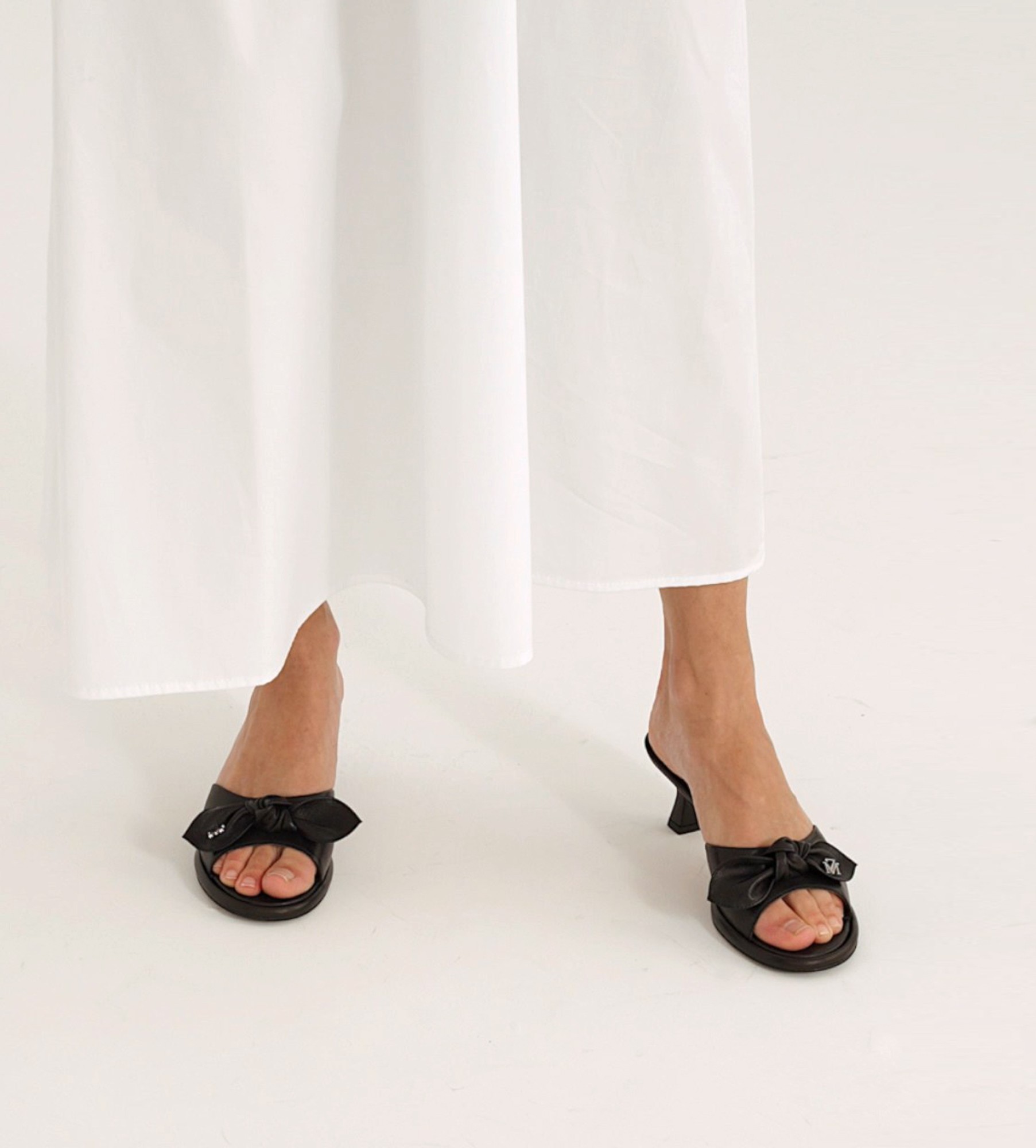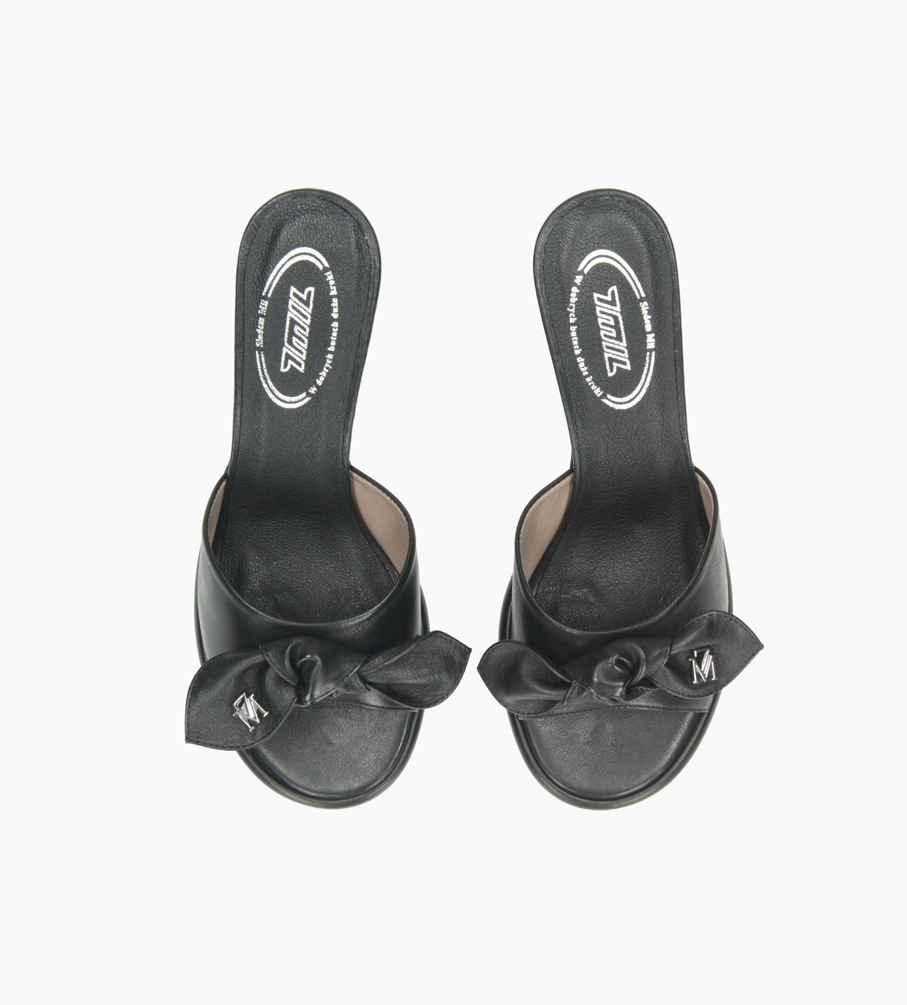 Czarne klapki to klasyczna elegancja z nutą romantycznego wdzięku. Wykonane z najwyższej jakości naturalnej skóry cielęcej, zachwycają swoją miękkością, perfekcyjnym wyprofilowaniem i wyjątkowym komfortem noszenia. Smukły, 6-centymetrowy obcas subtelnie podkreśla sylwetkę, dodając jej lekkości i elegancji, a jednocześnie zapewnia wygodę nawet przy dłuższym użytkowaniu. Najbardziej efektownym detalem jest urocza, skórzana kokarda umieszczona na nosku, która nadaje modelowi wyjątkowego uroku i kobiecej finezji.