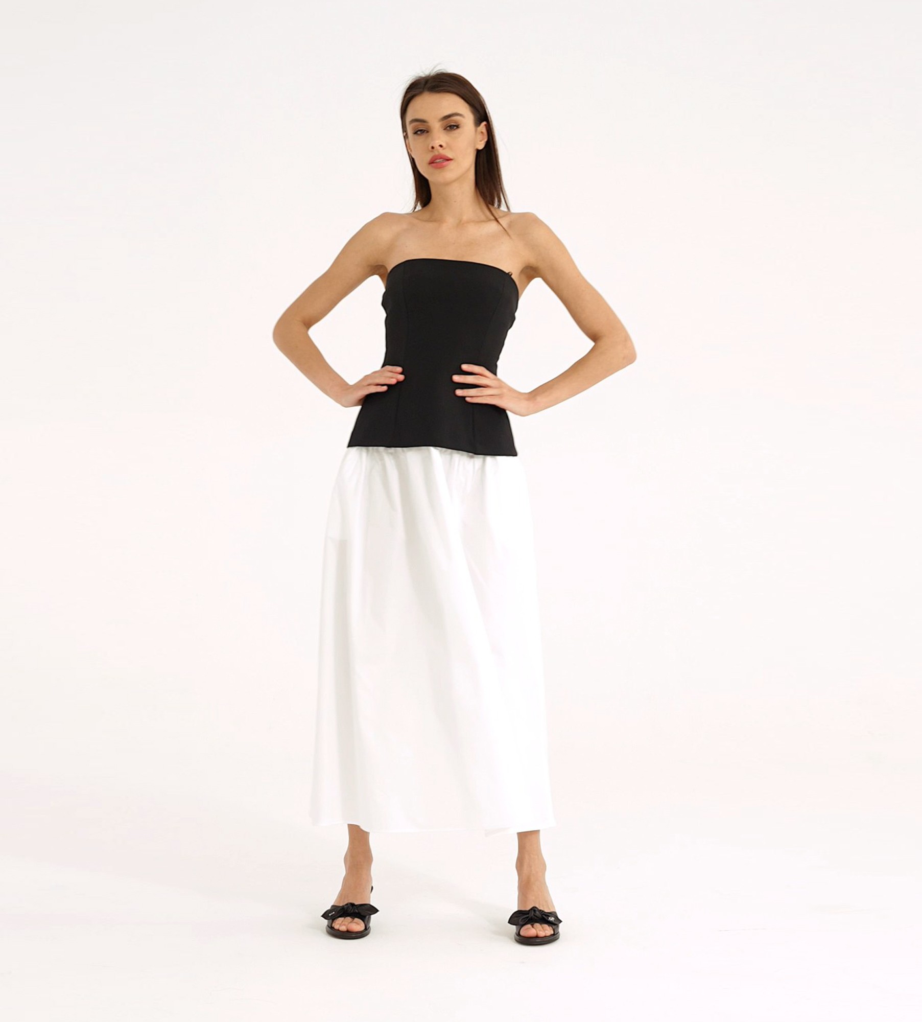 Postaw na klasyczne i szykowne połączenie sandałów z czarną, zwiewną spódnicą midi z delikatnym plisowaniem. Do tego wybierz dopasowany top na ramiączkach lub jedwabną bluzkę w kolorze écru, która doda całości lekkości i elegancji. Na chłodniejsze dni zarzuć beżowy trencz lub krótką, strukturalną marynarkę. Stylizację uzupełnij skórzaną kopertówką i subtelną biżuterią, np. złotymi kolczykami kółkami.