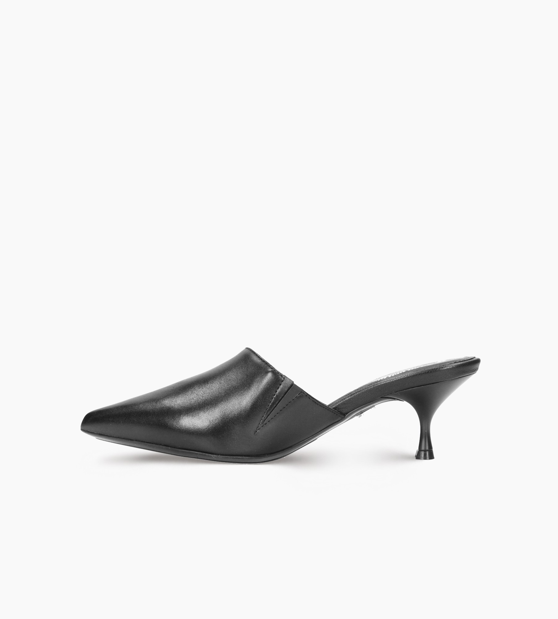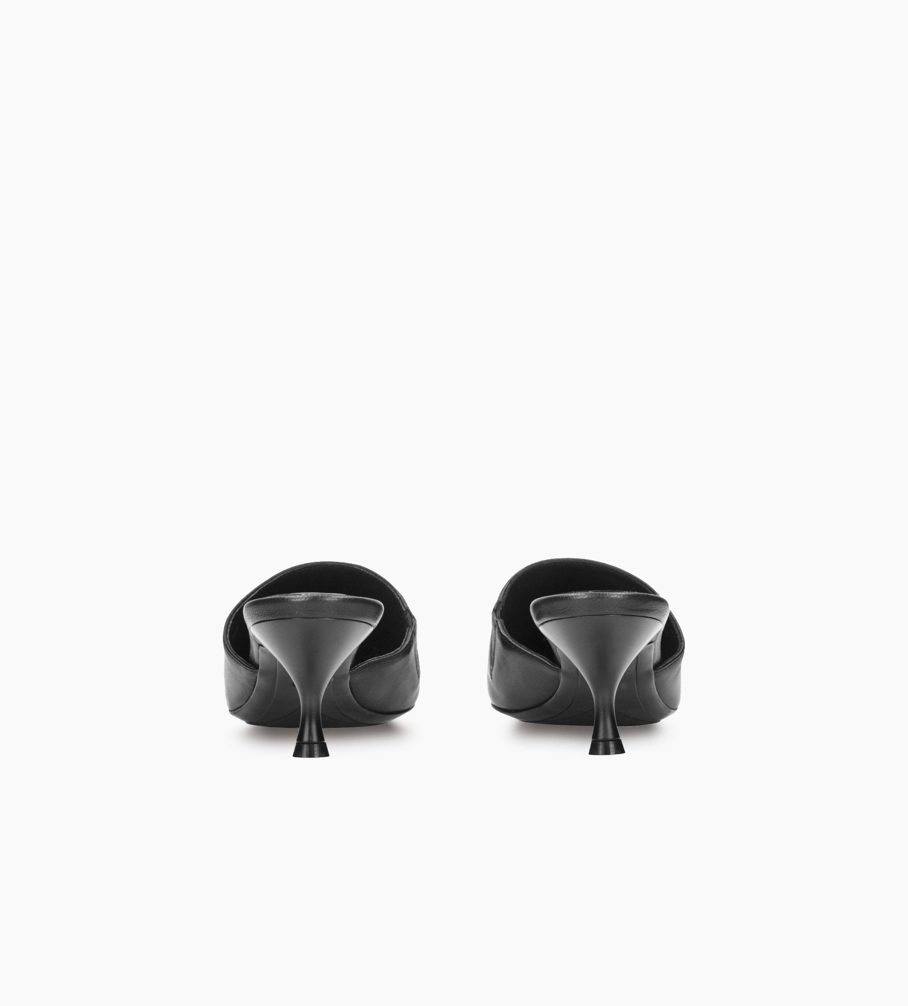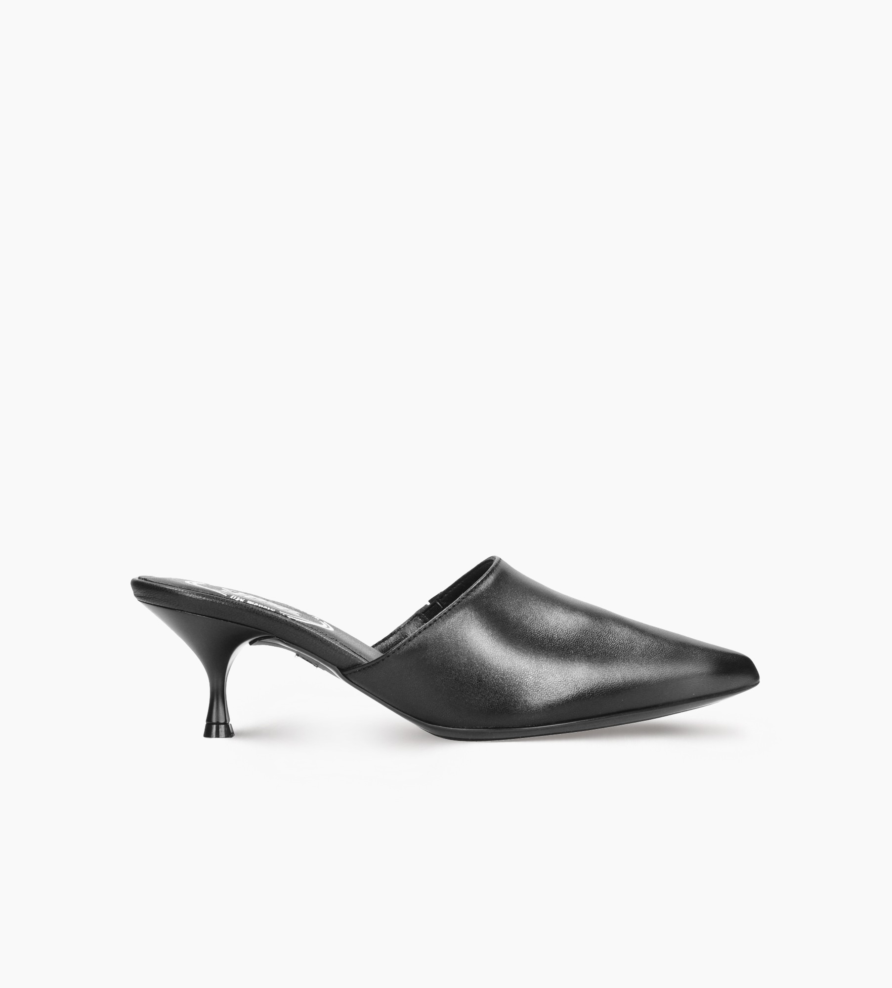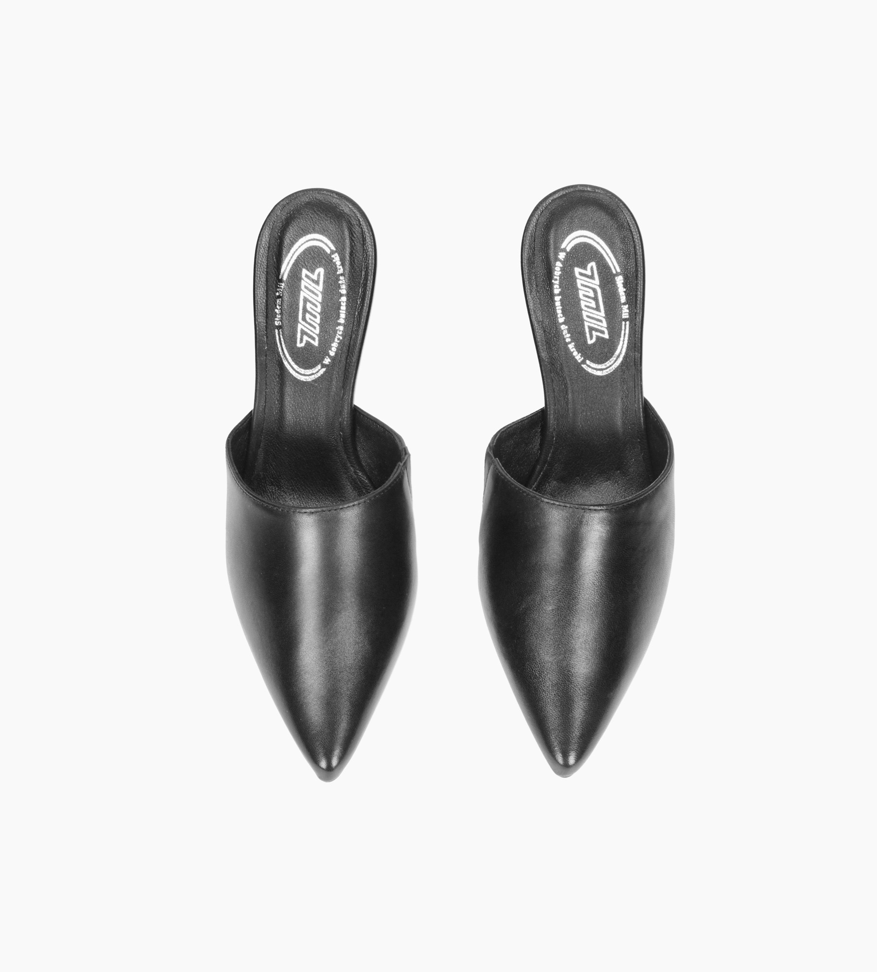 Prezentowane klapki to synonim ponadczasowej elegancji i nowoczesnego minimalizmu. Wykonane z wysokiej jakości naturalnej skóry licowej w klasycznej czerni. Ich wnętrze wyściełane jest delikatną skórą jagnięcą, znaną z wyjątkowej miękkości i oddychalności – zapewnia to komfort nawet podczas długiego noszenia. Model wyróżnia się noskiem w szpic, który optycznie wysmukla stopę, oraz subtelnym, niskim obcasem typu „kitten heel”, który dodaje lekkości sylwetce, nie odbierając stabilności. Zabudowana cholewka pięknie układa się na stopie, a otwarta pięta nadaje klapkom lekkości i sezonowego charakteru.