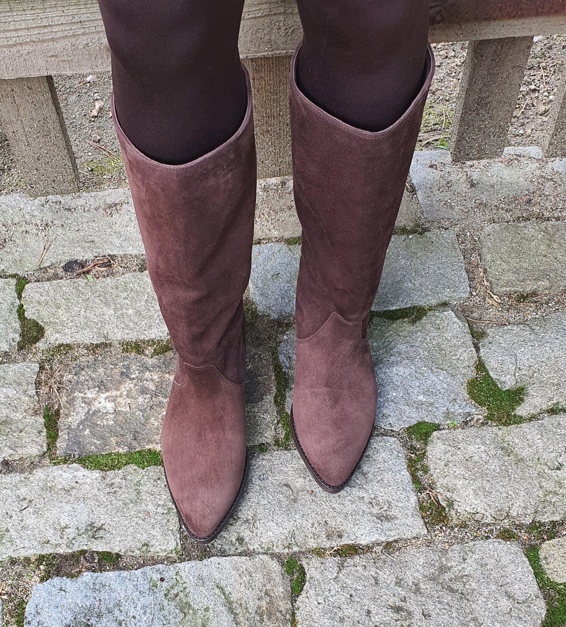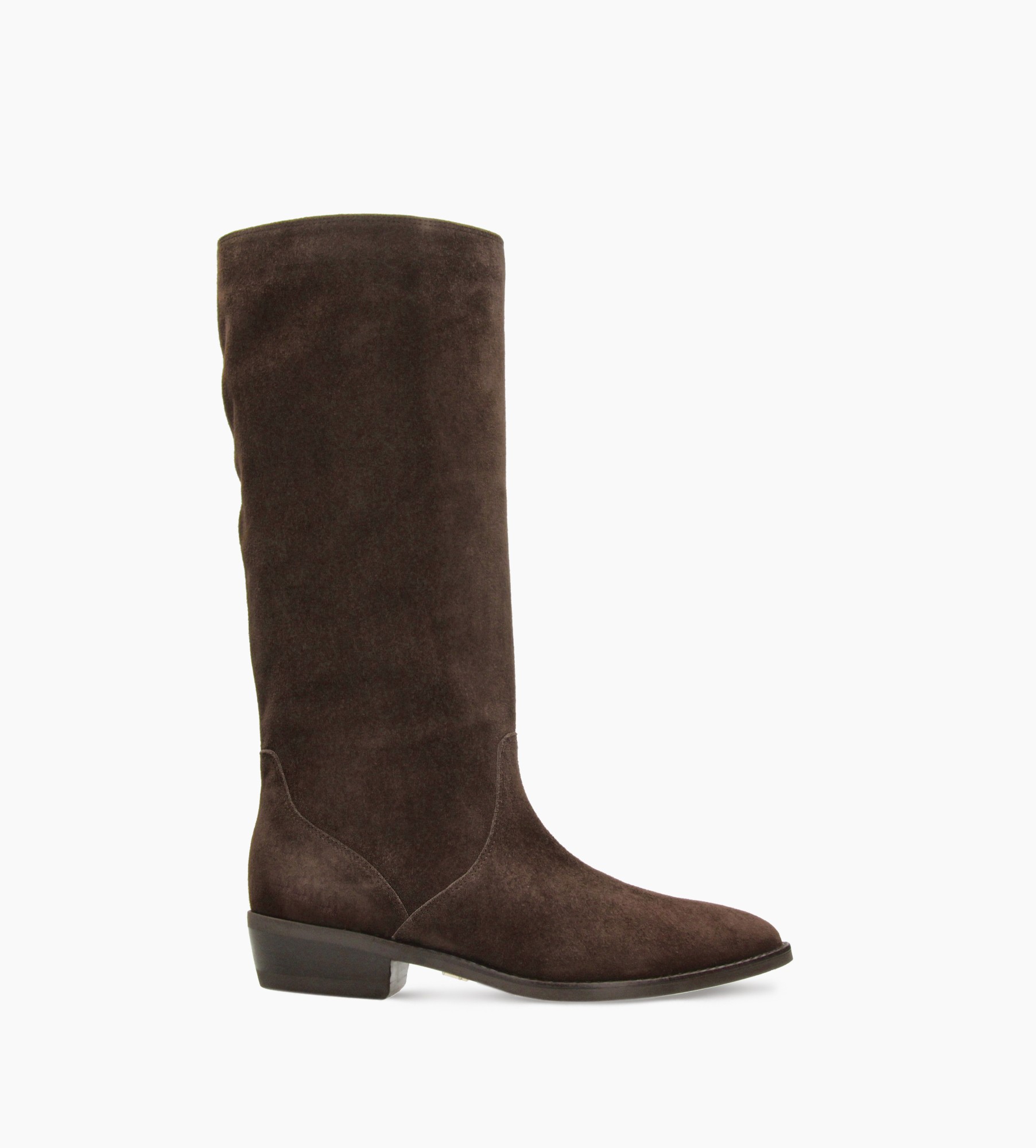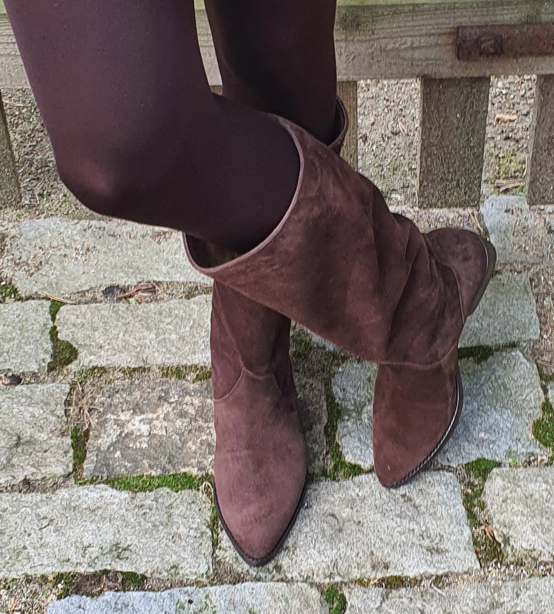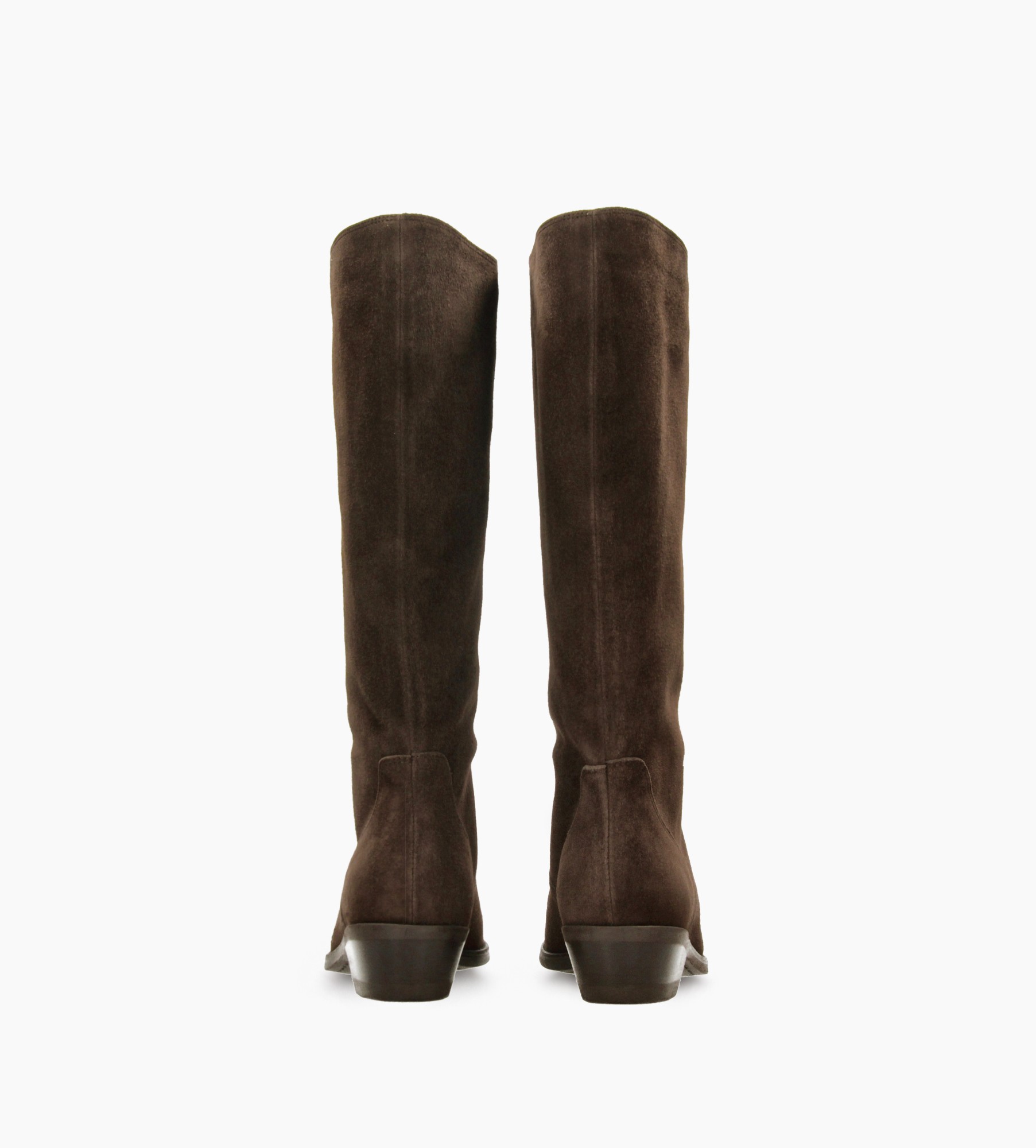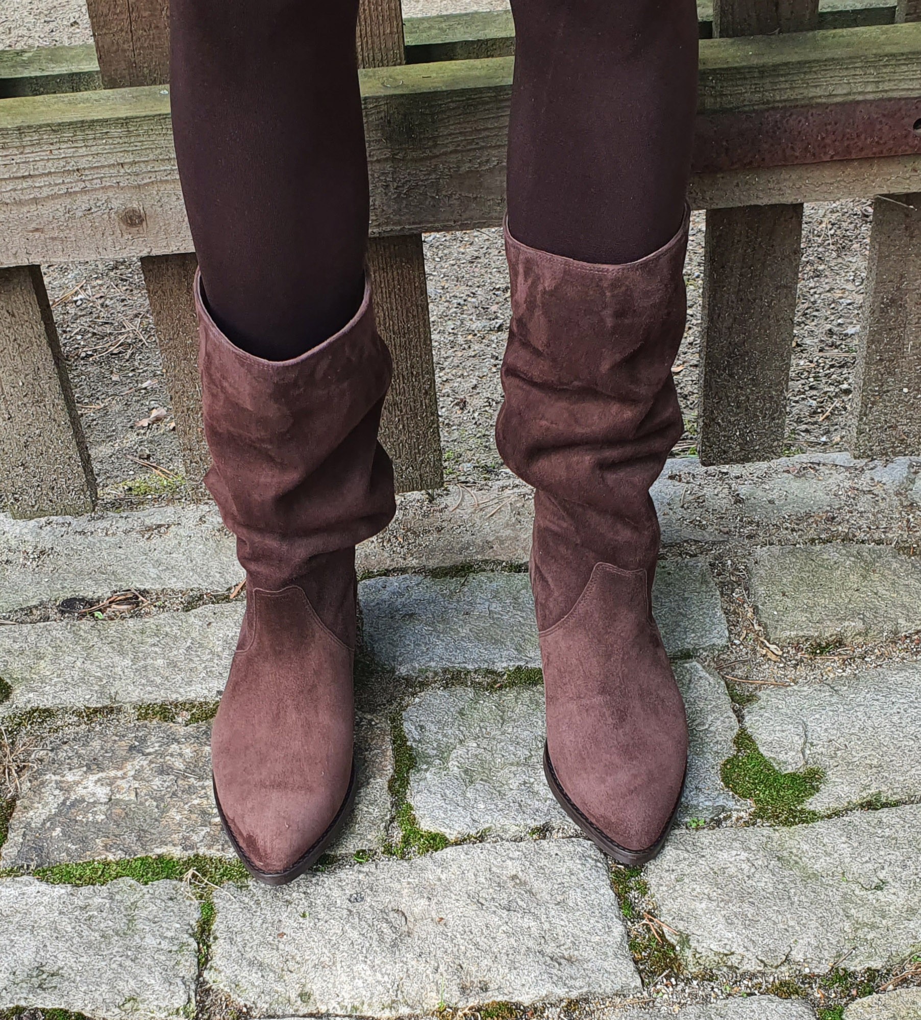 Klasyczne brązowe kozaki wykonane zostały z zamszu ze skóry naturalnej, który zachwyca miękkością i głębią koloru. Wsuwana konstrukcja oraz szersza cholewka zapewniają swobodę zakładania i doskonałe dopasowanie do różnych typów sylwetki. Wnętrze buta wyściełane jest przyjemnym w dotyku, ciepłym kocykiem, który otula stopę, gwarantując komfort w chłodne dni. Model idealnie balansuje pomiędzy subtelnym stylem western a ponadczasową klasyką, dzięki czemu z łatwością dopasuje się do zarówno codziennych, jak i bardziej eleganckich stylizacji. Niski, stabilny obcas zapewnia wygodę przez cały dzień, a uniwersalny odcień czekoladowego brązu pięknie komponuje się z jesienno-zimową paletą barw.