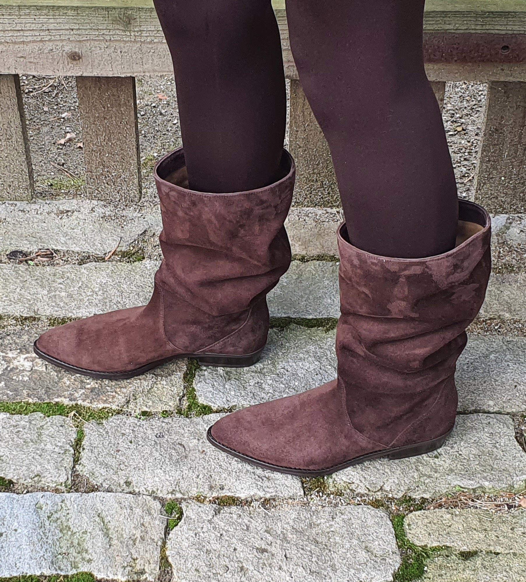 Kozaki zamszowe w kolorze czekoladowym zestawiamy z dzianinową sukienką midi o dopasowanym kroju w kolorze taupe lub ciepłego beżu. Do tego długi wełniany płaszcz w odcieniu camelowym z paskiem w talii, który podkreśli sylwetkę. Całość dopełnia zamszowa torebka na ramię w kolorze zbliżonym do butów oraz złota biżuteria w postaci delikatnych kolczyków i pierścionków. Stylizacja idealna na jesienne spacery po mieście, wizytę w galerii czy spotkanie przy kawie.