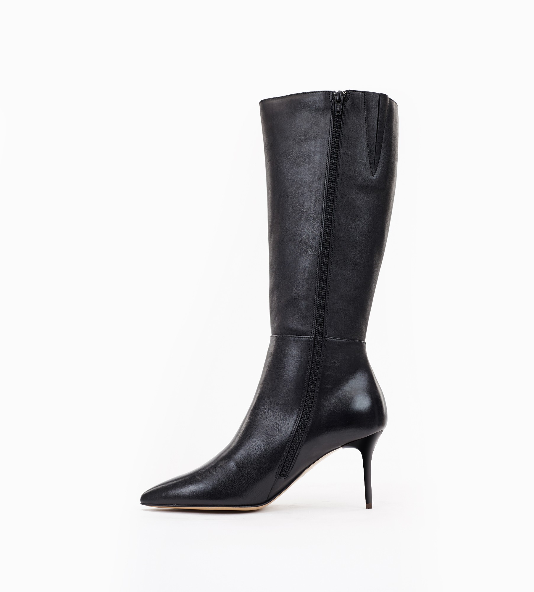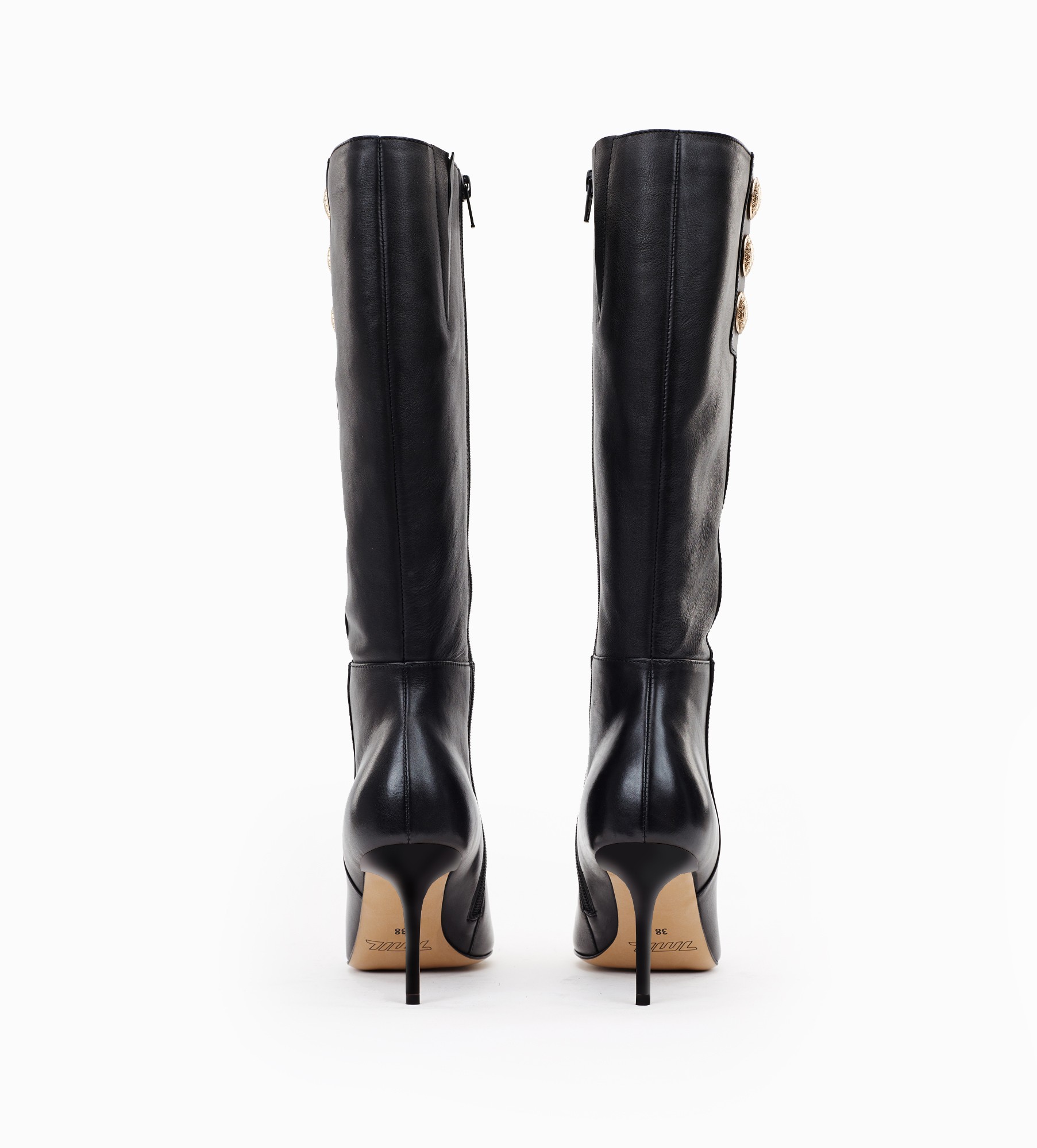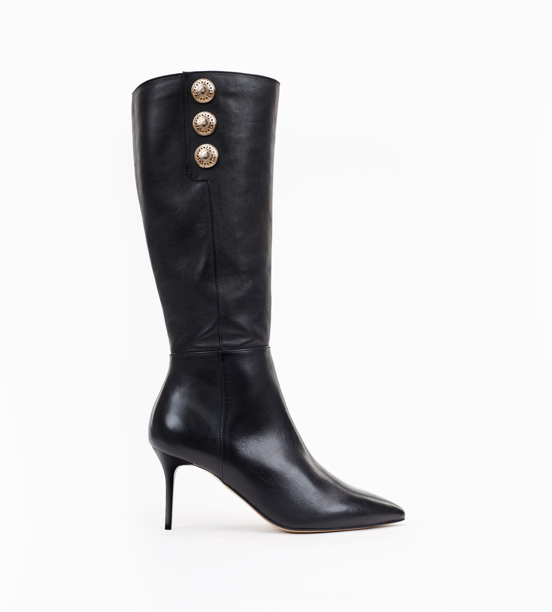Kobiece czarne kozaki damskie z to eleganckie buty wykonane z wysokiej jakości naturalnej skóry jagnięcej. Wnętrze i wkładka są wyściełane ociepleniem kocykiem o grubości 1,5 mm, co zapewnia komfort i ciepło. Cholewka zdobiona jest subtelnymi złotymi dekoracyjnymi guzikami, dodającymi szyku i elegancji. Kozaki mają wysoki obcas o wysokości 8 cm, co sprawia, że są idealne na chłodniejsze dni, łącząc w sobie styl i funkcjonalność.