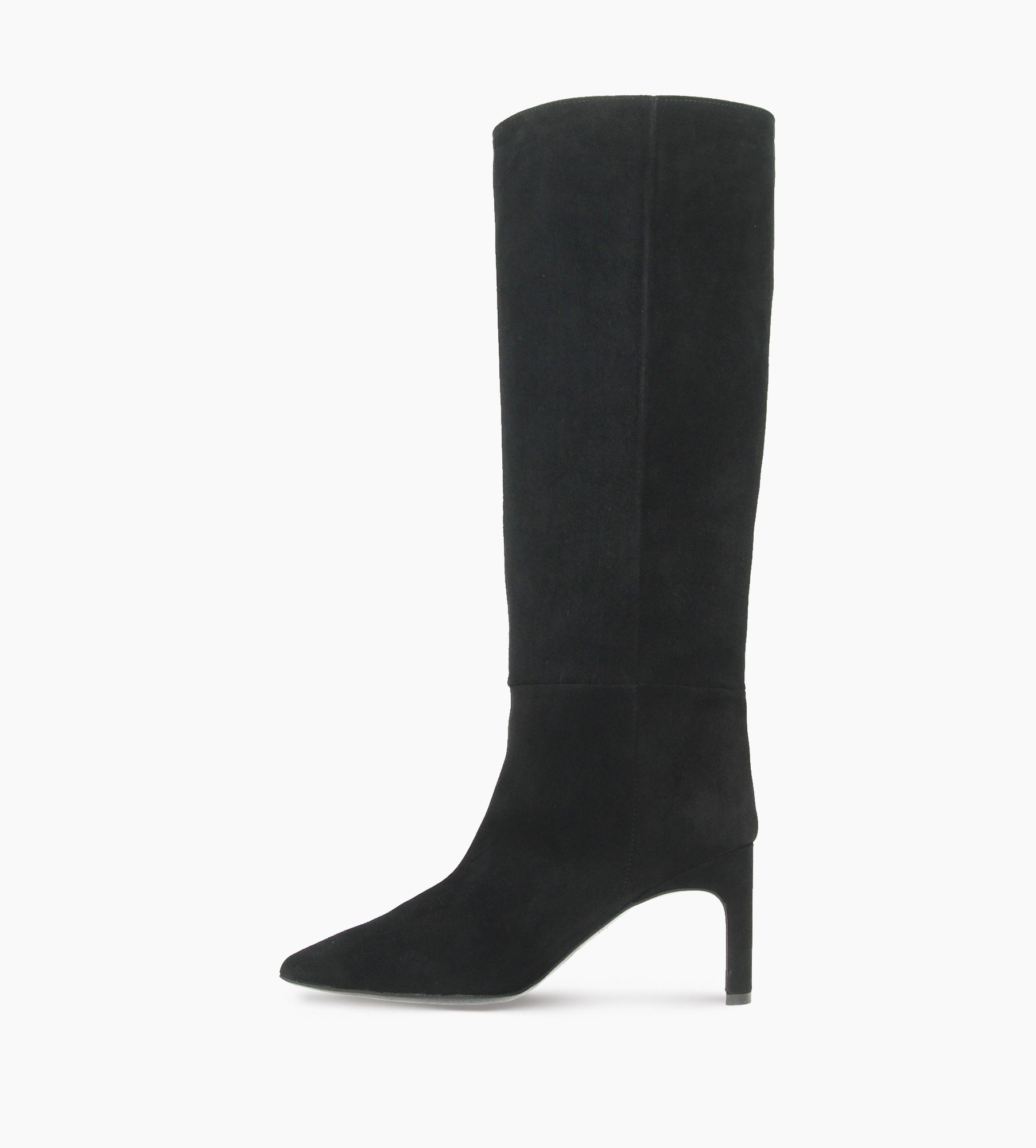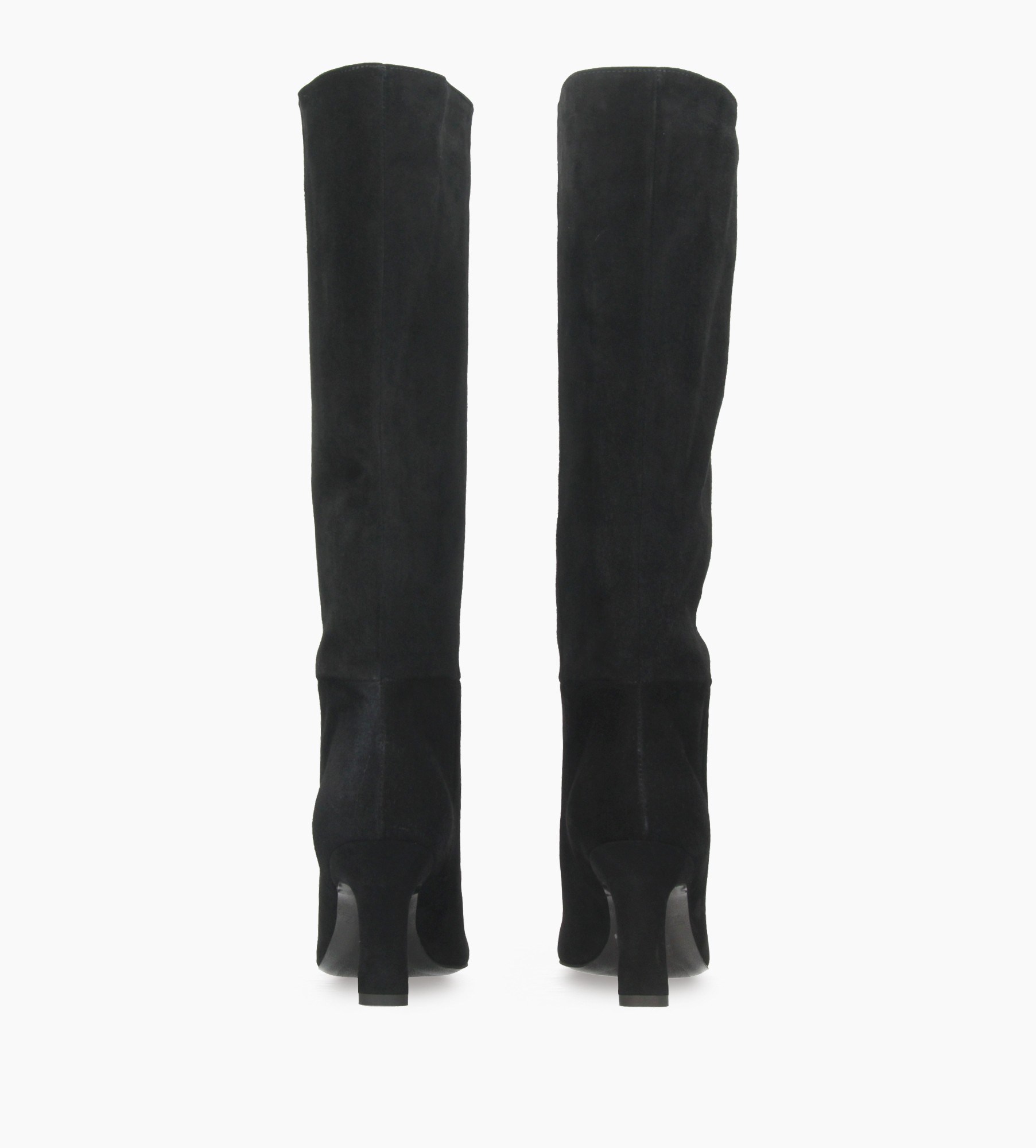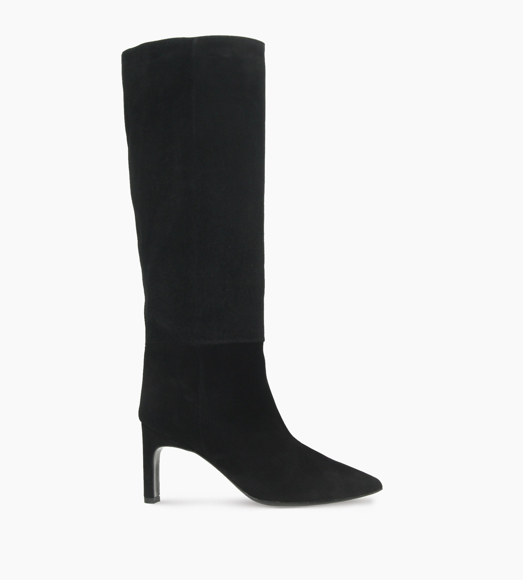 Czarne zamszowe kozaki damskie wsuwane z szerszą cholewką to eleganckie i wszechstronne obuwie, które doskonale łączy styl z wygodą. Wykonane z wysokiej jakości zamszu, prezentują się wyjątkowo szykownie i miękko. Szersza cholewka, którą można dowolnie marszczyć, pozwala na regulowanie wysokości kozaków oraz nadawanie im różnorodnych stylizacji – od bardziej swobodnych po eleganckie. Smukły, spiczasty nosek nadaje butom kobiecego charakteru, podkreślając subtelnie sylwetkę, a wygodny obcas zapewnia komfort podczas długiego noszenia. Te wsuwane kozaki to idealny wybór na jesienno-zimowe dni, łączący modę z funkcjonalnością.