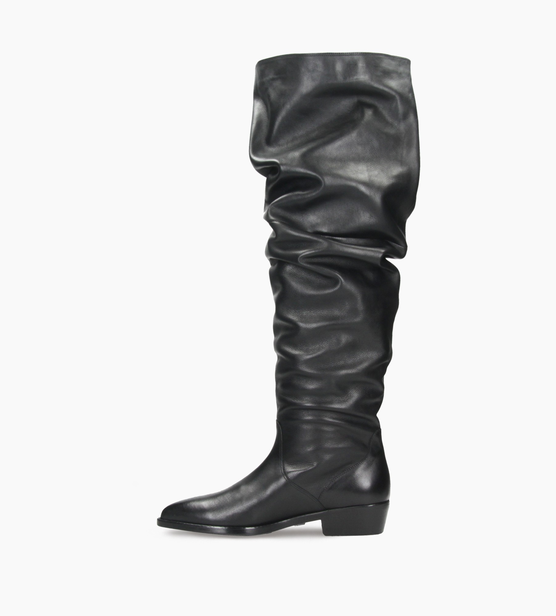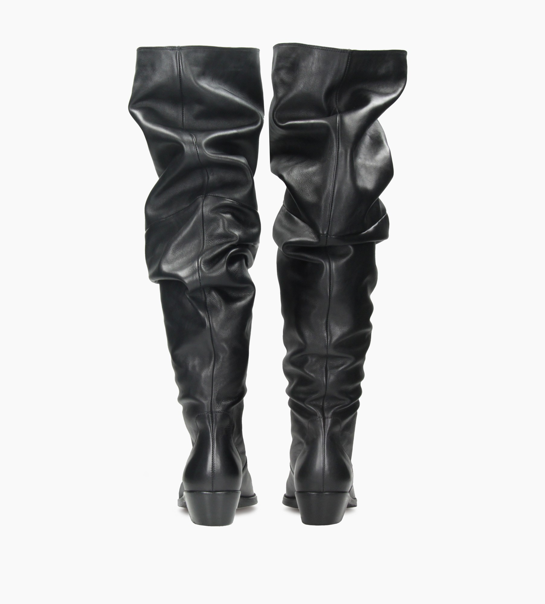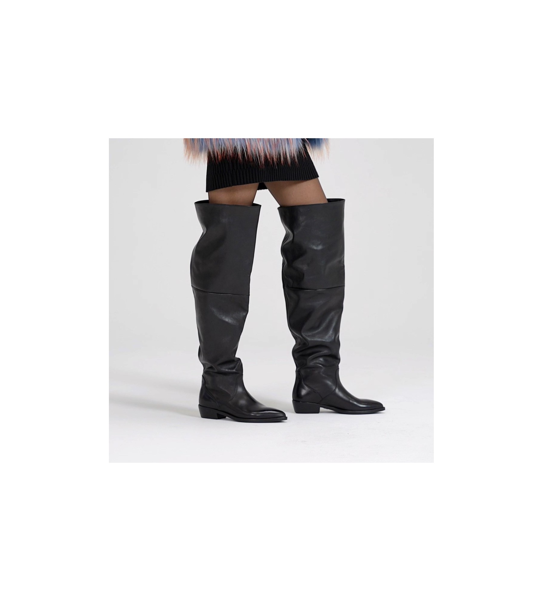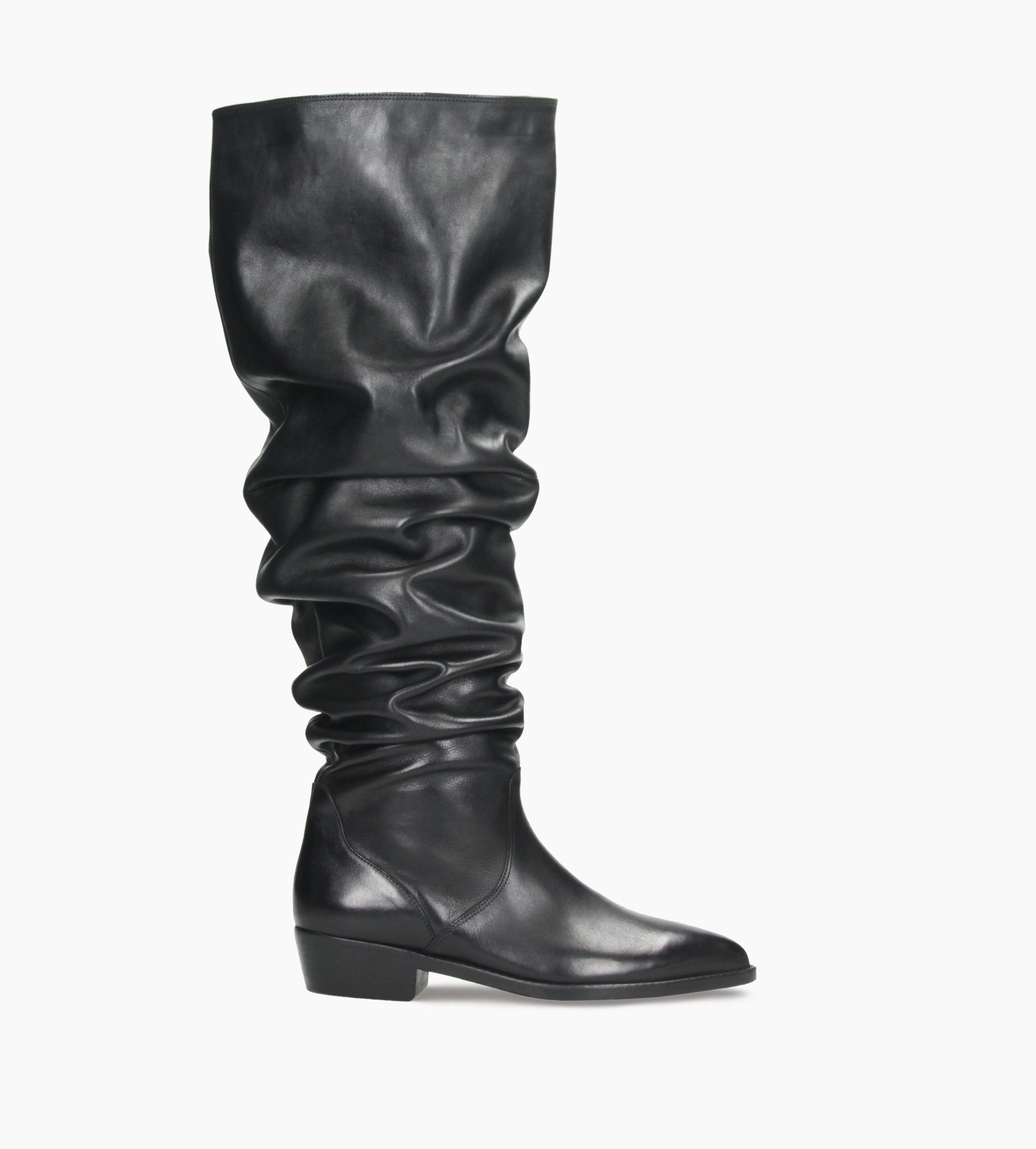 Czarne kozaki damskie wykonane z naturalnej skóry cielęcej to klasyczne muszkieterki o wyrafinowanym, eleganckim wyglądzie. Model jest wsuwany, co zapewnia wygodę, a szeroka, marszczona cholewka nadaje im modny, swobodny charakter. Kozaki mają ocieplenie z miękkiego weluru, co zapewnia komfort i ciepło w chłodniejsze dni. Idealne do różnorodnych stylizacji, dodają elegancji i smukłości każdemu zestawowi.