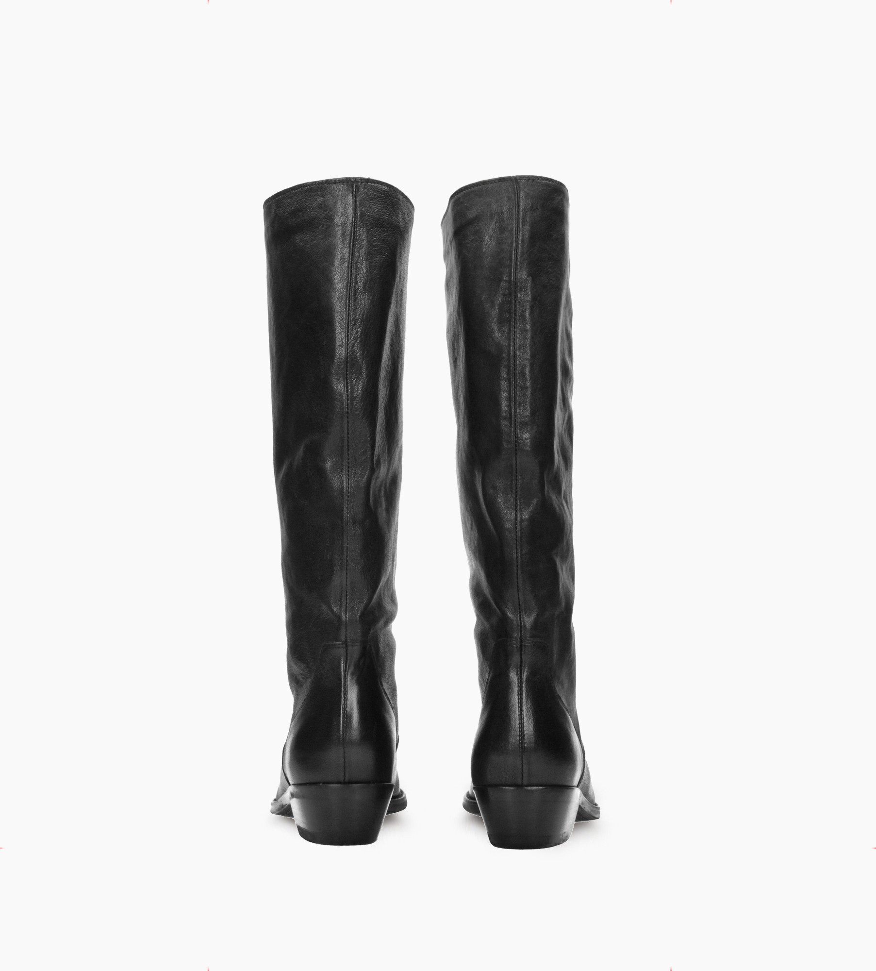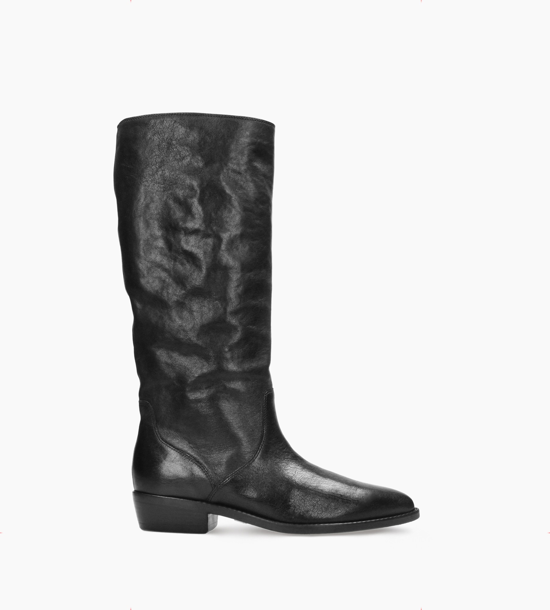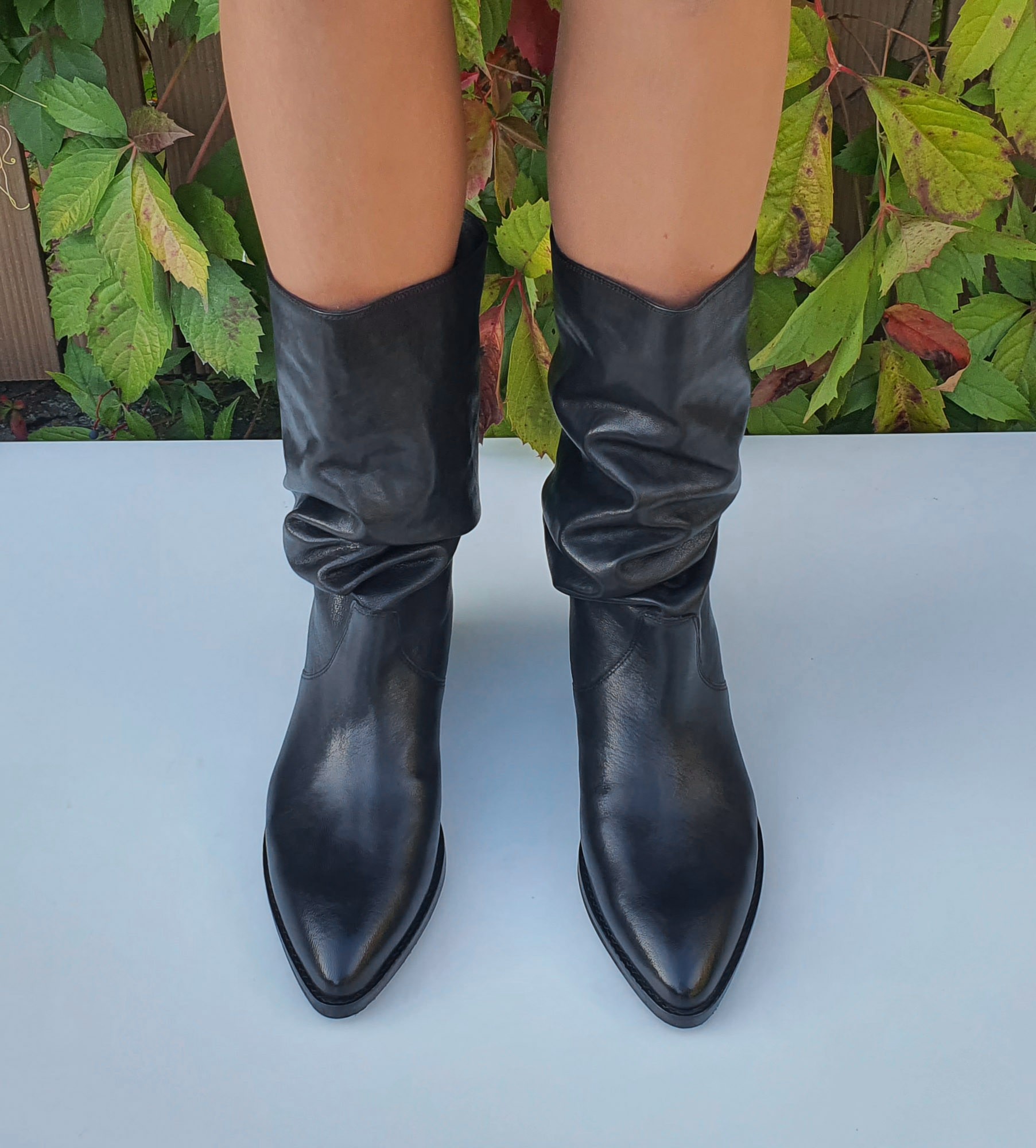Wprowadź do swojej jesienno-zimowej garderoby powiew miejskiego luzu z czarnymi kozakami inspirowanymi stylem western. Wykonane z miękkiej skóry naturalnej, zachwycają swobodnie marszczoną cholewką i luźniejszym fasonem, który doskonale wpisuje się w aktualne trendy. Kozaki są wsuwane – bez suwaka, co nadaje im minimalistycznego charakteru i zapewnia szybkie zakładanie. Wnętrze wyściełane zostało przyjemnym, miękkim „kocykiem”, który otuli stopy ciepłem nawet w chłodne dni. Niski, stabilny obcas gwarantuje wygodę na co dzień, a zarazem dodaje sylwetce lekkości.