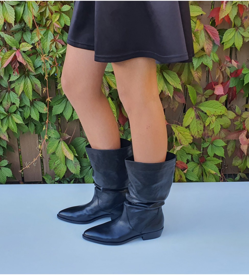 Wprowadź do swojej jesienno-zimowej garderoby powiew miejskiego luzu z czarnymi kozakami inspirowanymi stylem western. Wykonane z miękkiej skóry naturalnej, zachwycają swobodnie marszczoną cholewką i luźniejszym fasonem, który doskonale wpisuje się w aktualne trendy. Kozaki są wsuwane – bez suwaka, co nadaje im minimalistycznego charakteru i zapewnia szybkie zakładanie. Wnętrze wyściełane zostało przyjemnym, miękkim „kocykiem”, który otuli stopy ciepłem nawet w chłodne dni. Niski, stabilny obcas gwarantuje wygodę na co dzień, a zarazem dodaje sylwetce lekkości.