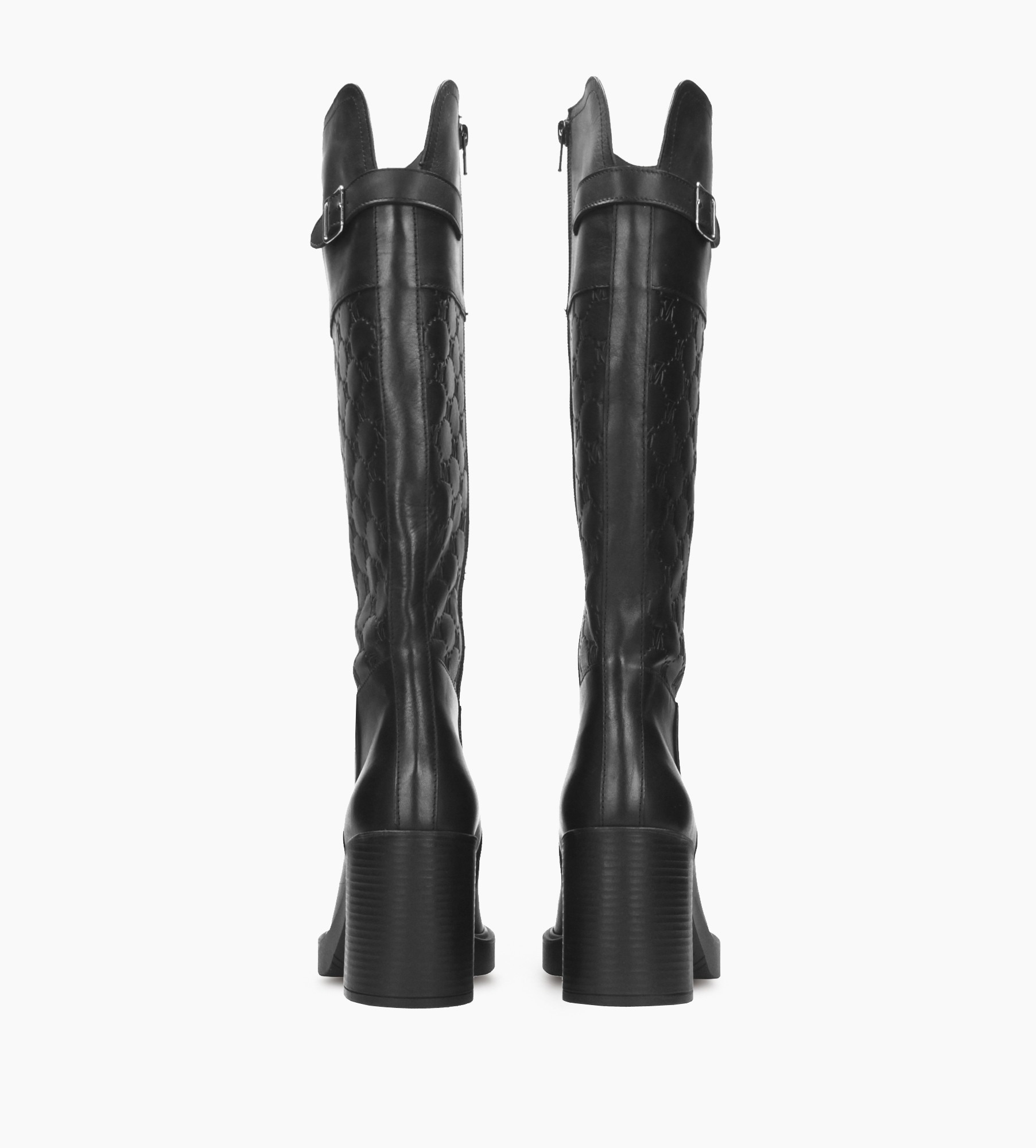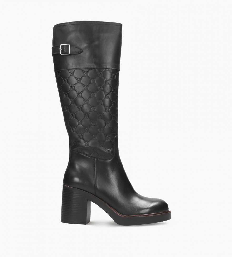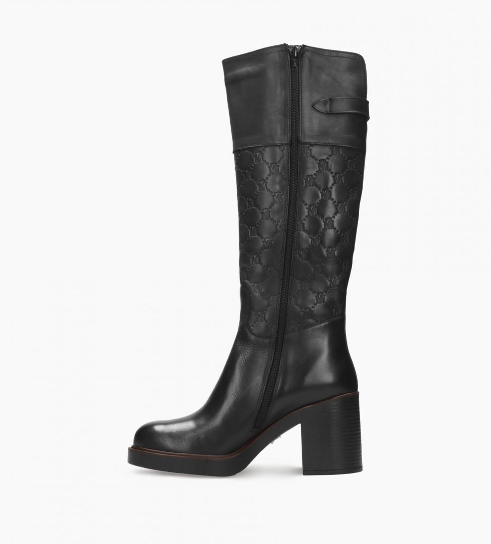Eleganckie, czarne kozaki damskie wykonane są z naturalnej skóry cielęcej, która zapewnia trwałość i szlachetny wygląd. Wnętrze wykończono miękką skórą jagnięcą, gwarantującą komfort i przyjemność noszenia nawet przez cały dzień.Modny, szeroki obcas w formie stabilnego klocka subtelnie wydłuża sylwetkę, nie rezygnując przy tym z wygody. Wyróżniającym elementem jest skórzana cholewka ozdobiona tłoczonym monogramem marki, nadająca kozakom unikalnego, luksusowego charakteru. Boczne zapięcie na zamek ułatwia zakładanie, a regulowany pasek z klamerką dodaje im stylowego wykończenia.