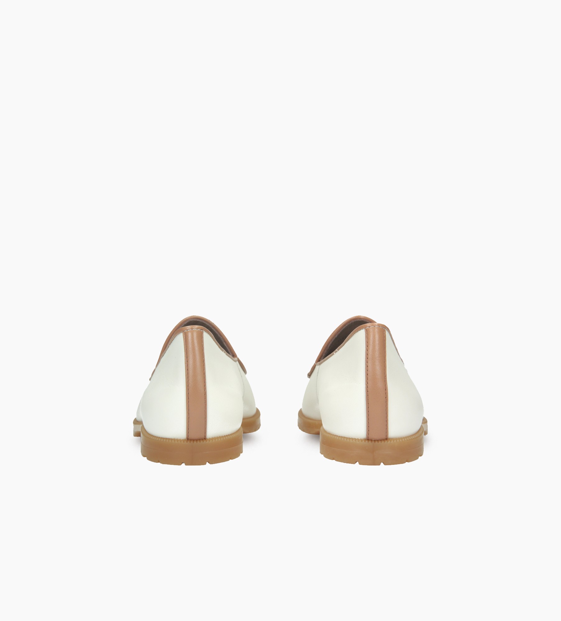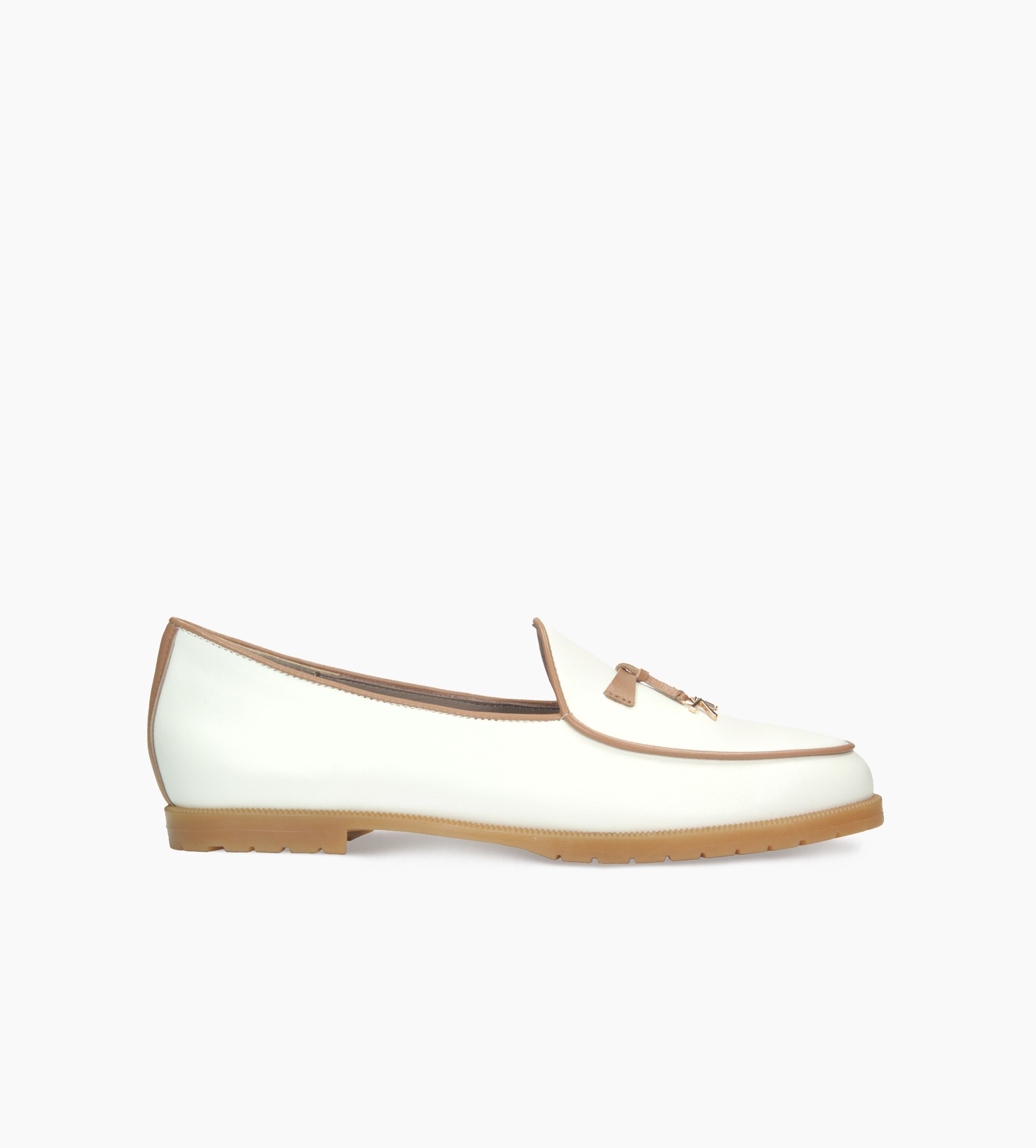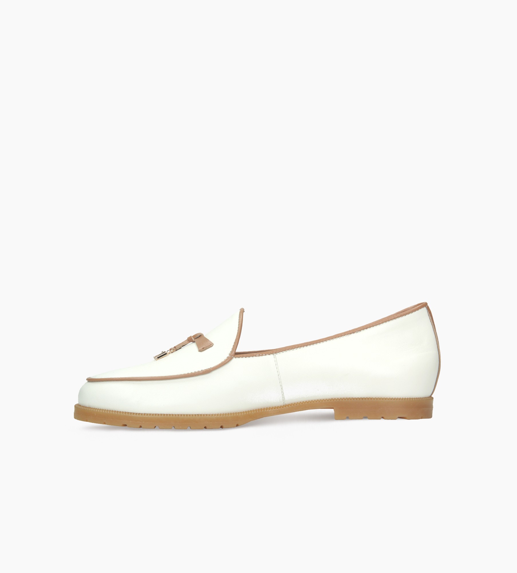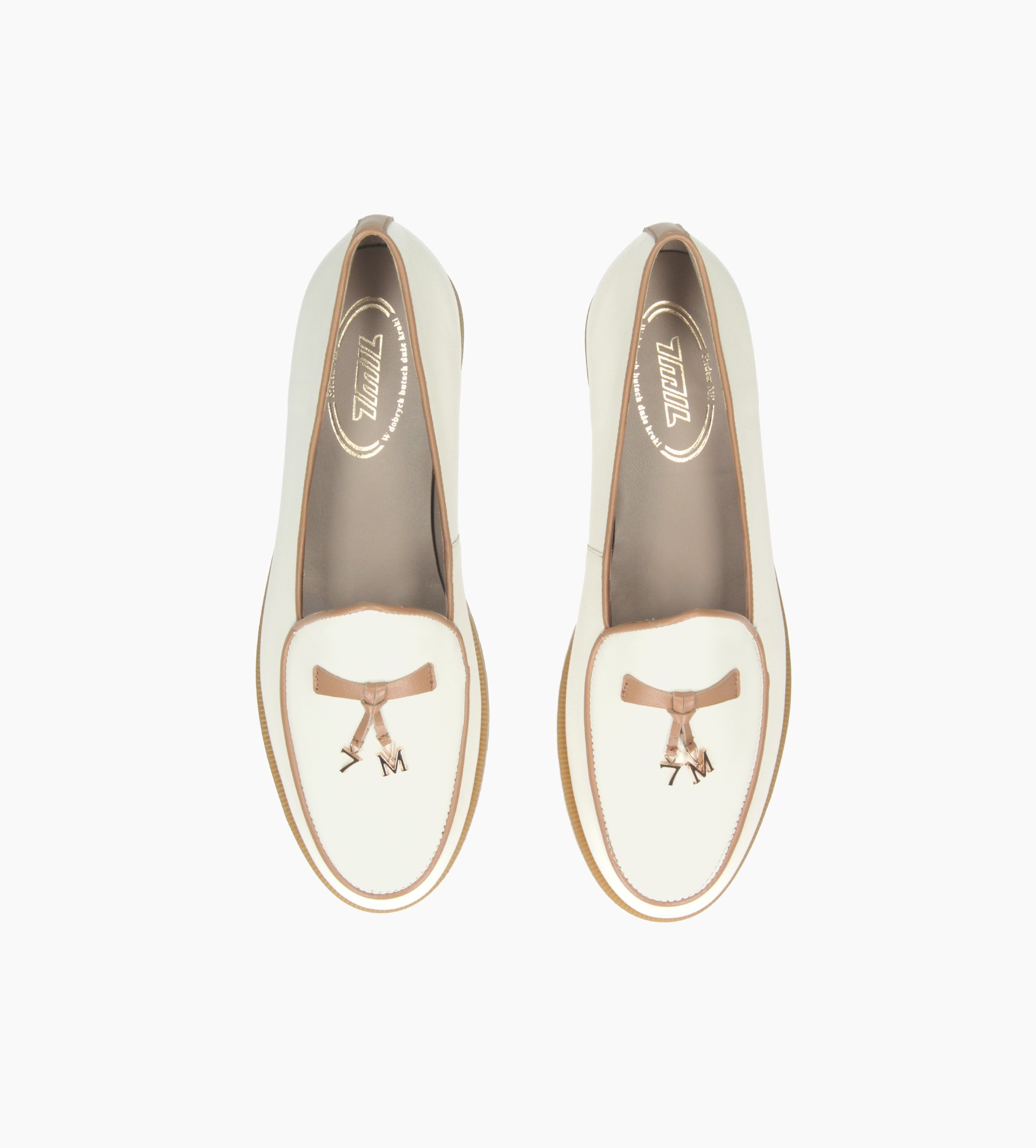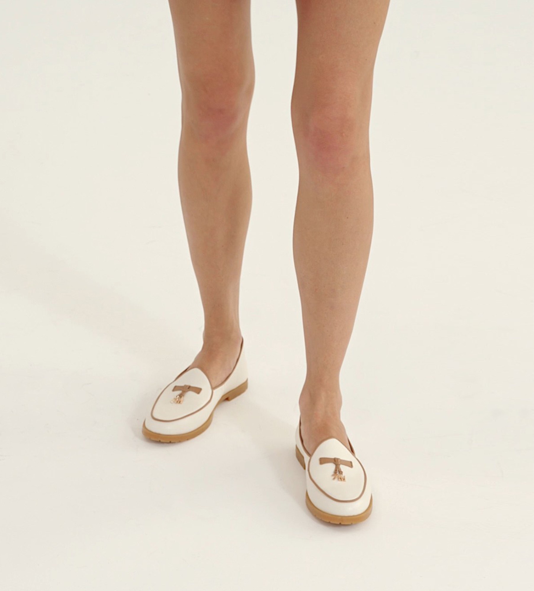 Białe mokasyny damskie wykonane z najwyższej jakości naturalnej skóry wyróżniają się klasycznym, eleganckim designem. Ich wnętrze wyściełane jest miękką skórą jagnięcą, zapewniając komfort i idealne dopasowanie do stopy. Kontrastowe, beżowe wykończenie dodaje butom charakteru, podkreślając ich unikalny styl. Na cholewce umieszczono delikatną dekorację w formie subtelnych zawieszek z logo firmy, które dodają modelowi ekskluzywnego akcentu. Mokasyny doskonale sprawdzą się zarówno w codziennych stylizacjach, jak i eleganckich zestawieniach na wiosenne dni.