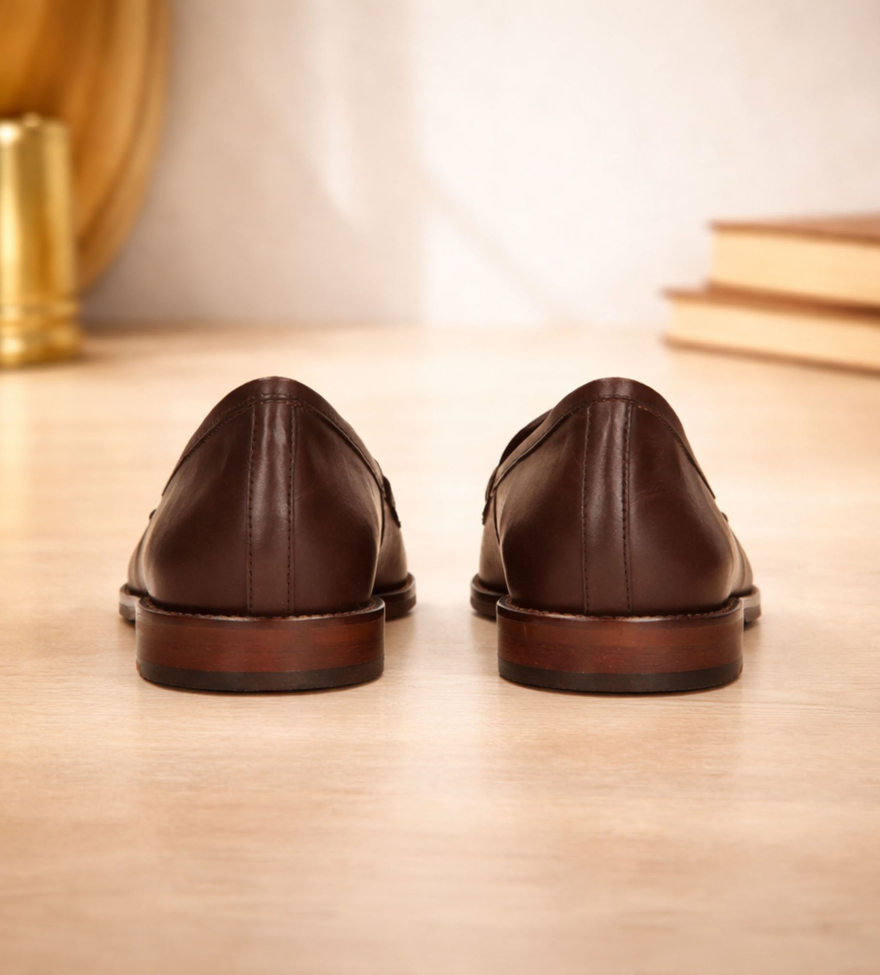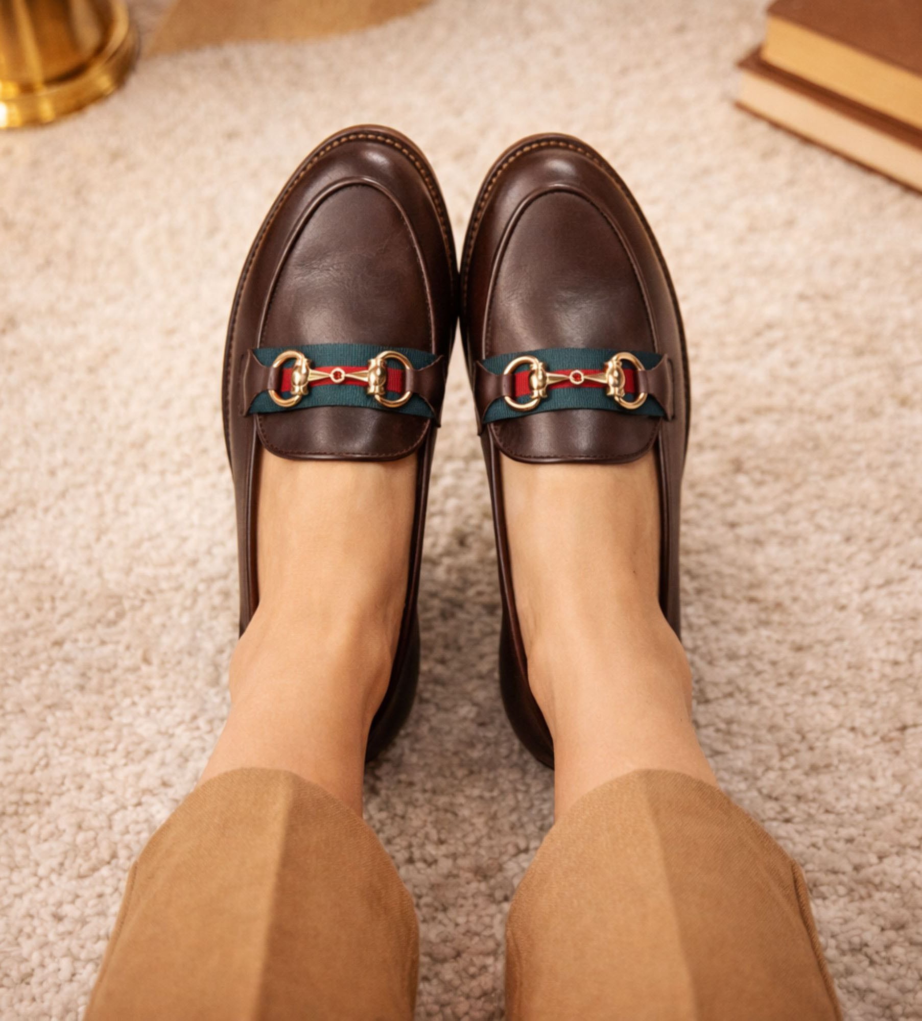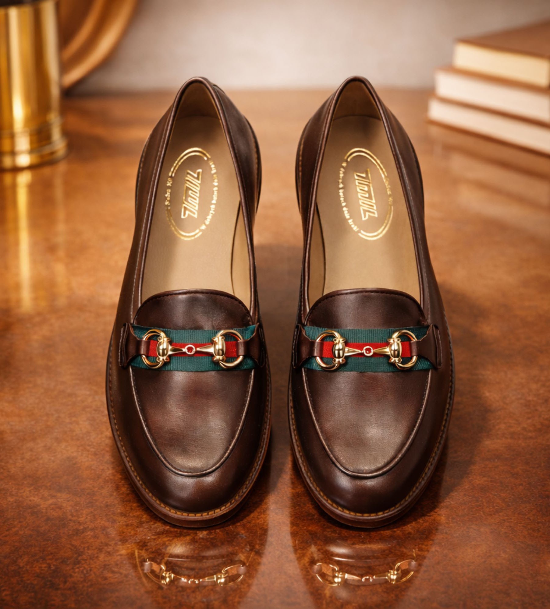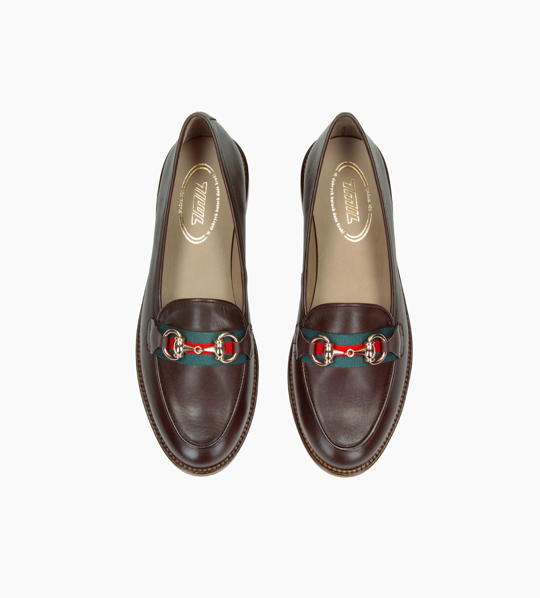 Eleganckie mokasyny damskie wykonane z wysokogatunkowej skóry cielęcej w głębokim odcieniu czekoladowego brązu to kwintesencja klasyki z subtelnym, nowoczesnym twistem. Ich wnętrze wyściełane jest miękką skórą jagnięcą, która zapewnia wyjątkowy komfort użytkowania. Charakterystyczna dla tego modelu ozdoba w postaci metalowej klamry i dekoracyjnej wstążki w kolorach butelkowej zieleni i czerwieni przywodzi na myśl włoską elegancję i modowe dziedzictwo stylu.