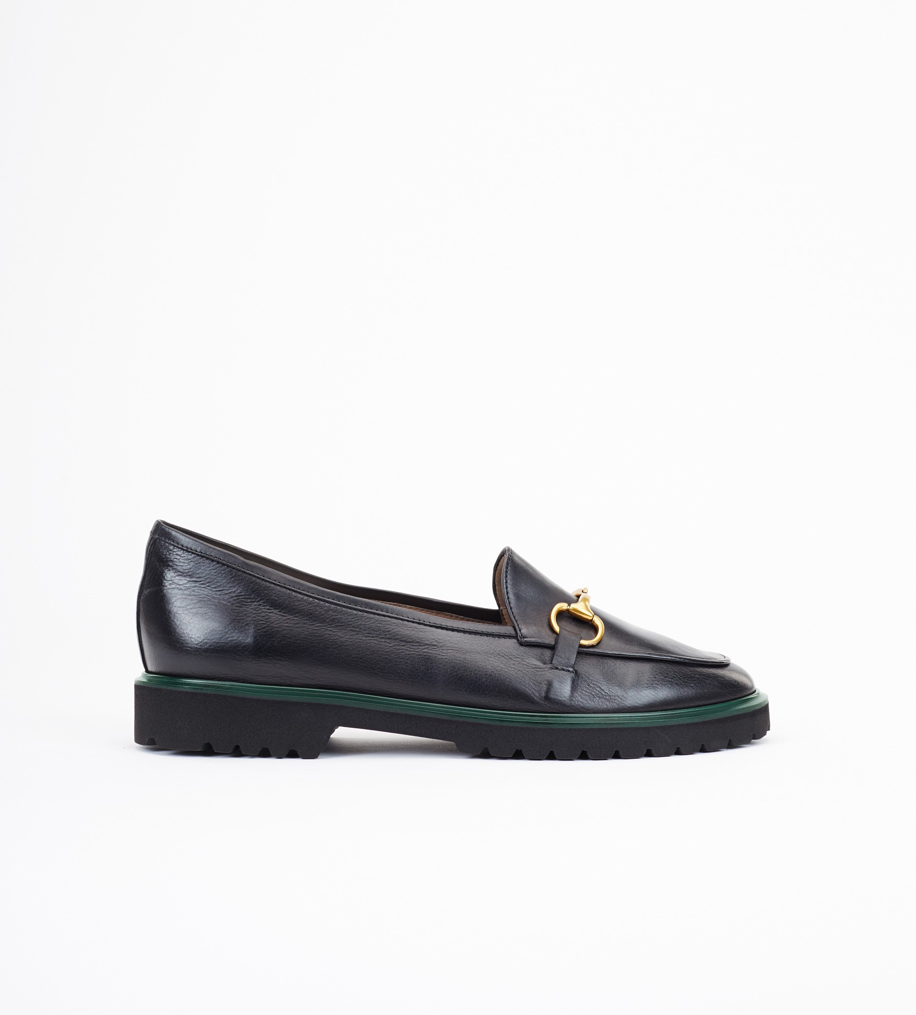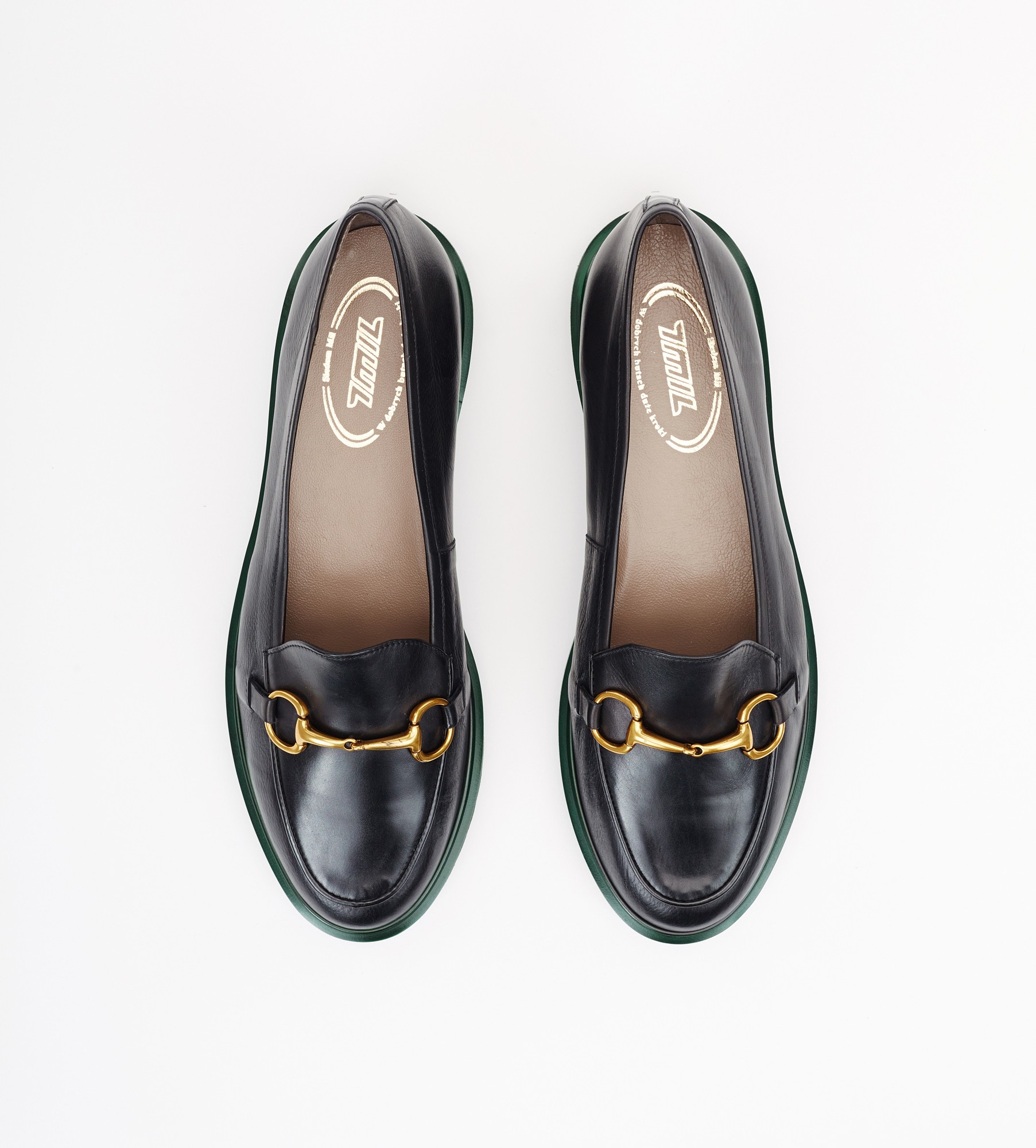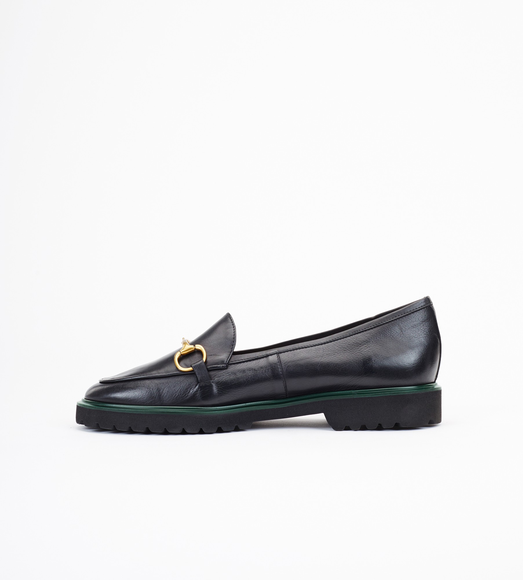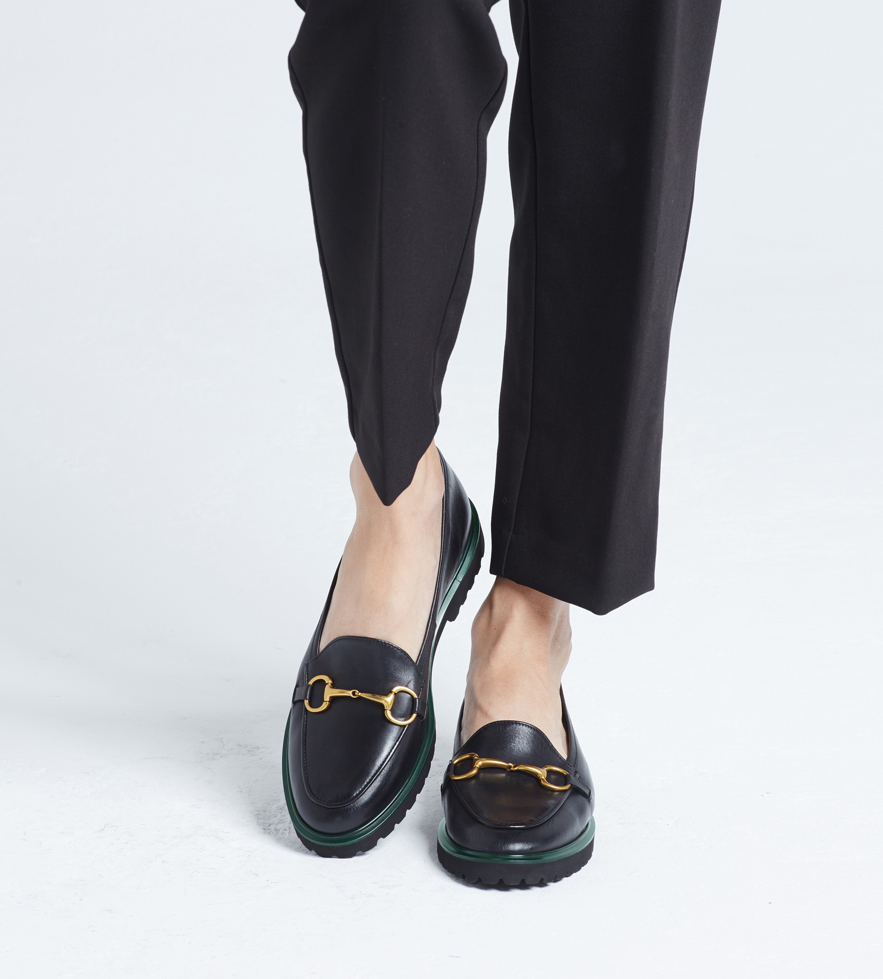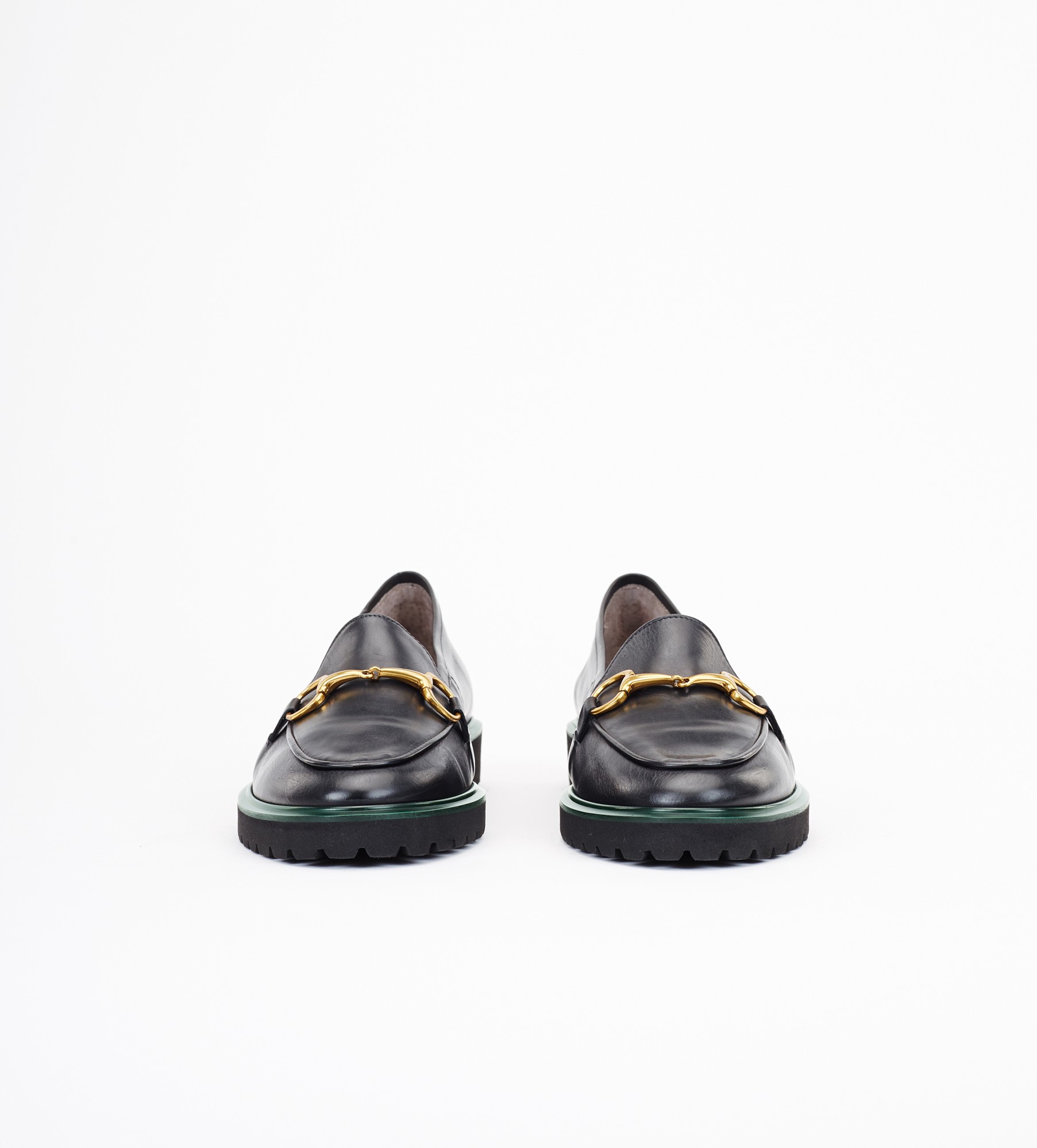 Czarne mokasyny z naturalnej skóry cielęcej ze złotą ozdobą to idealne obuwie dla każdej kobiety, która ceni sobie zarówno styl, jak i komfort. Wnętrze butów wyłożone jest naturalną skórą jagnięcą, która jest wyjątkowo miękka i przewiewna, co gwarantuje wysoki komfort nawet przy długotrwałym noszeniu. Podeszwa butów jest bardzo lekka i elastyczna, wyposażona w zielony otok, co dodaje im unikalnego stylu. Stylowa złota ozdoba na przodzie butów dodaje elegancji i wyrafinowanego charakteru, czyniąc je idealnym wyborem zarówno na co dzień, jak i na bardziej formalne okazje.