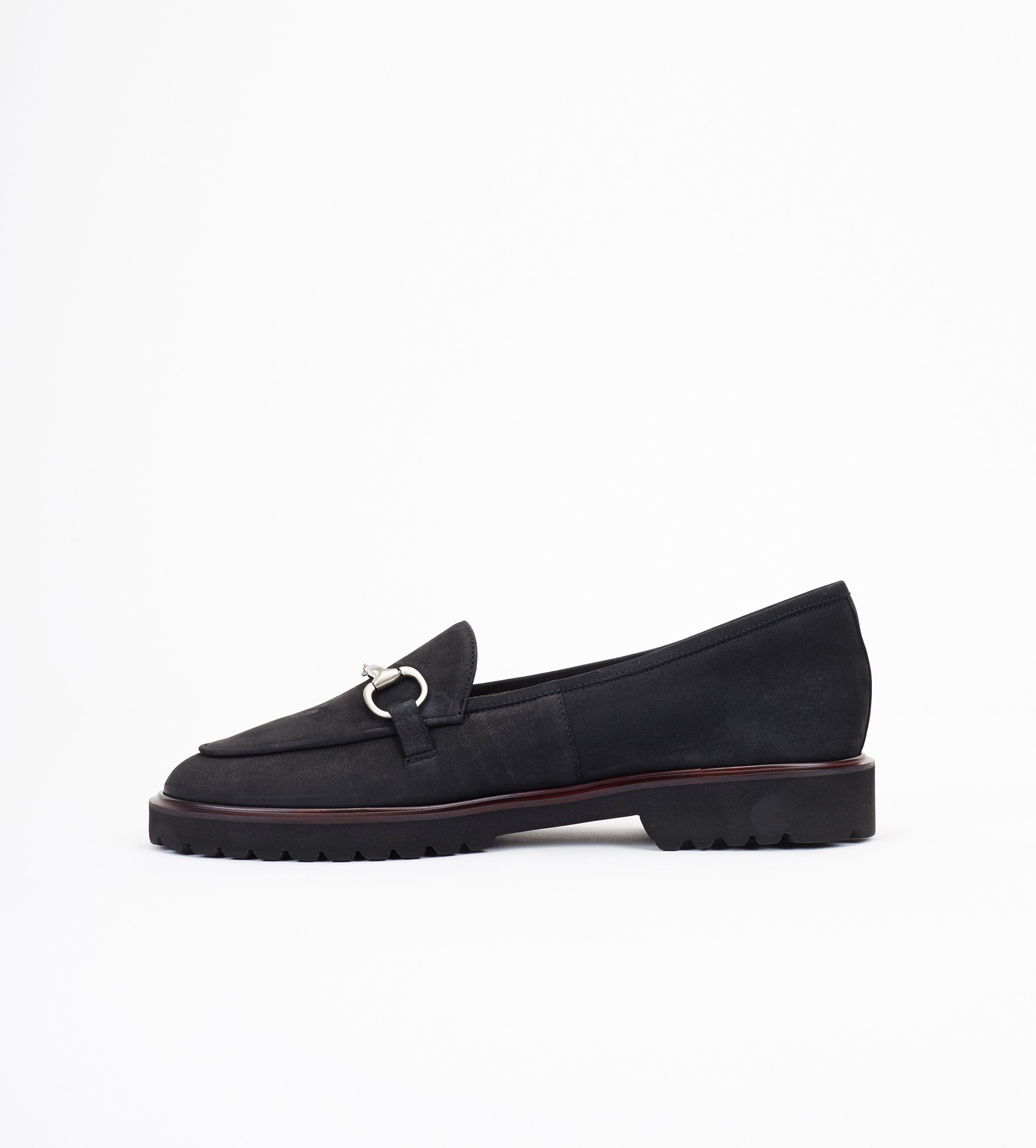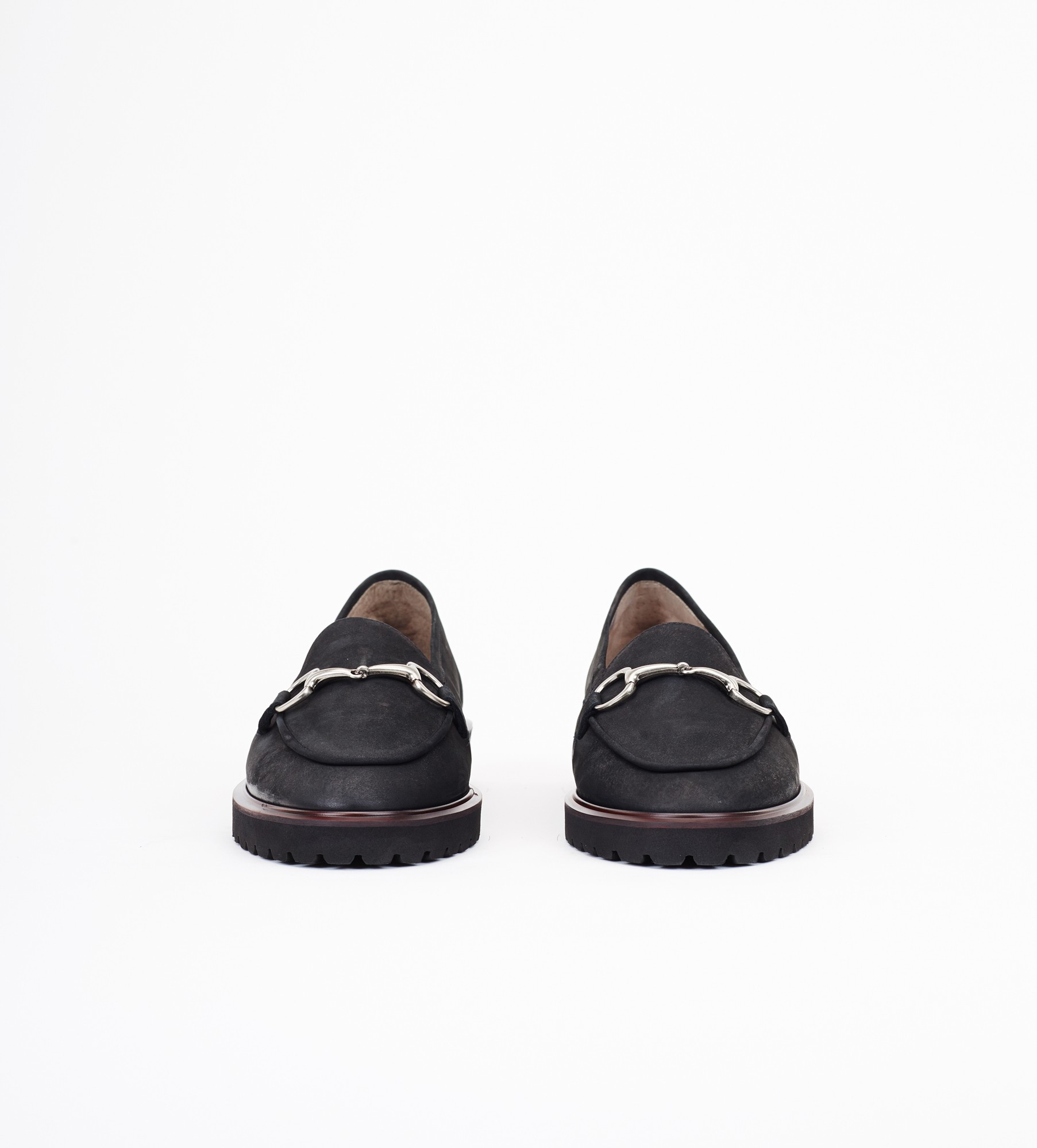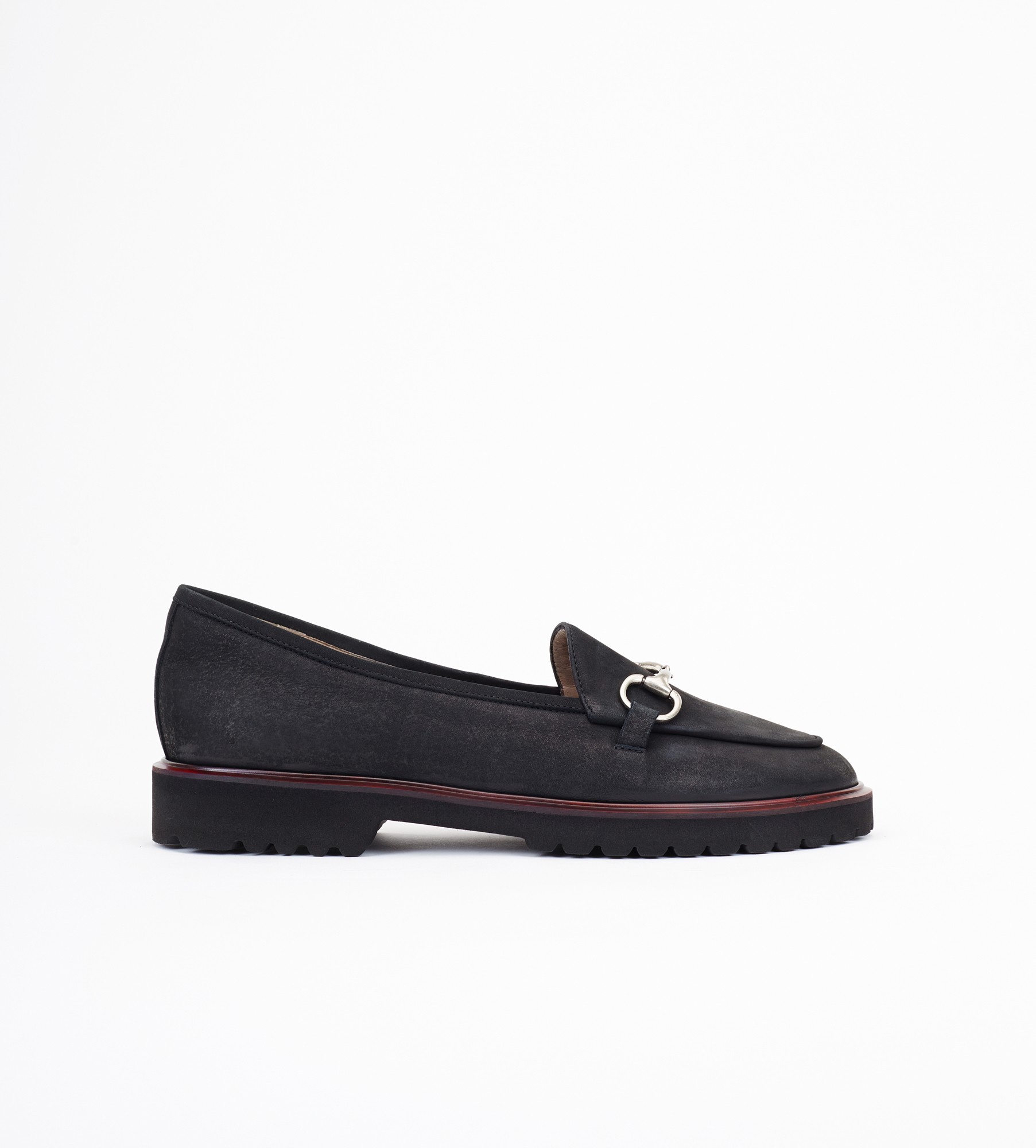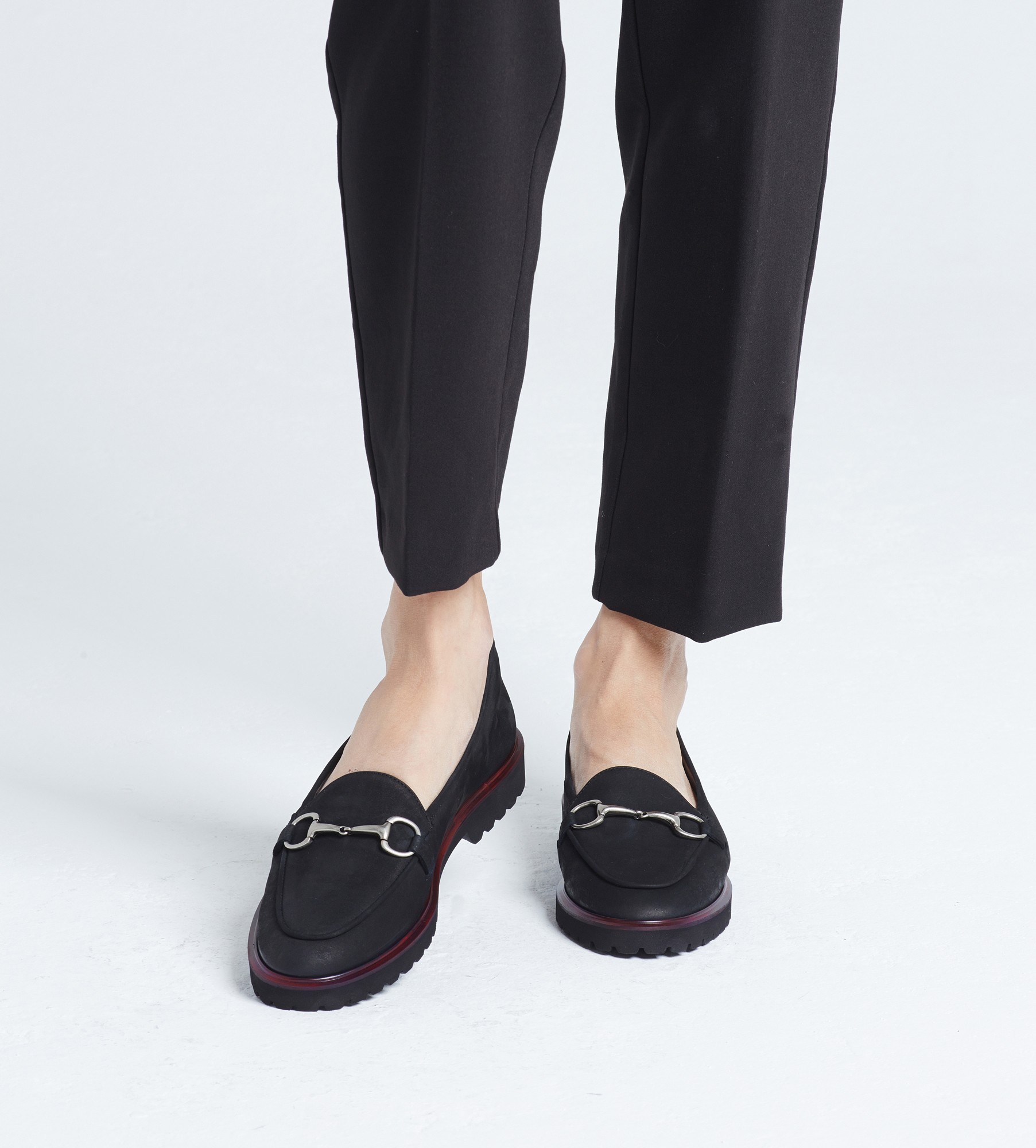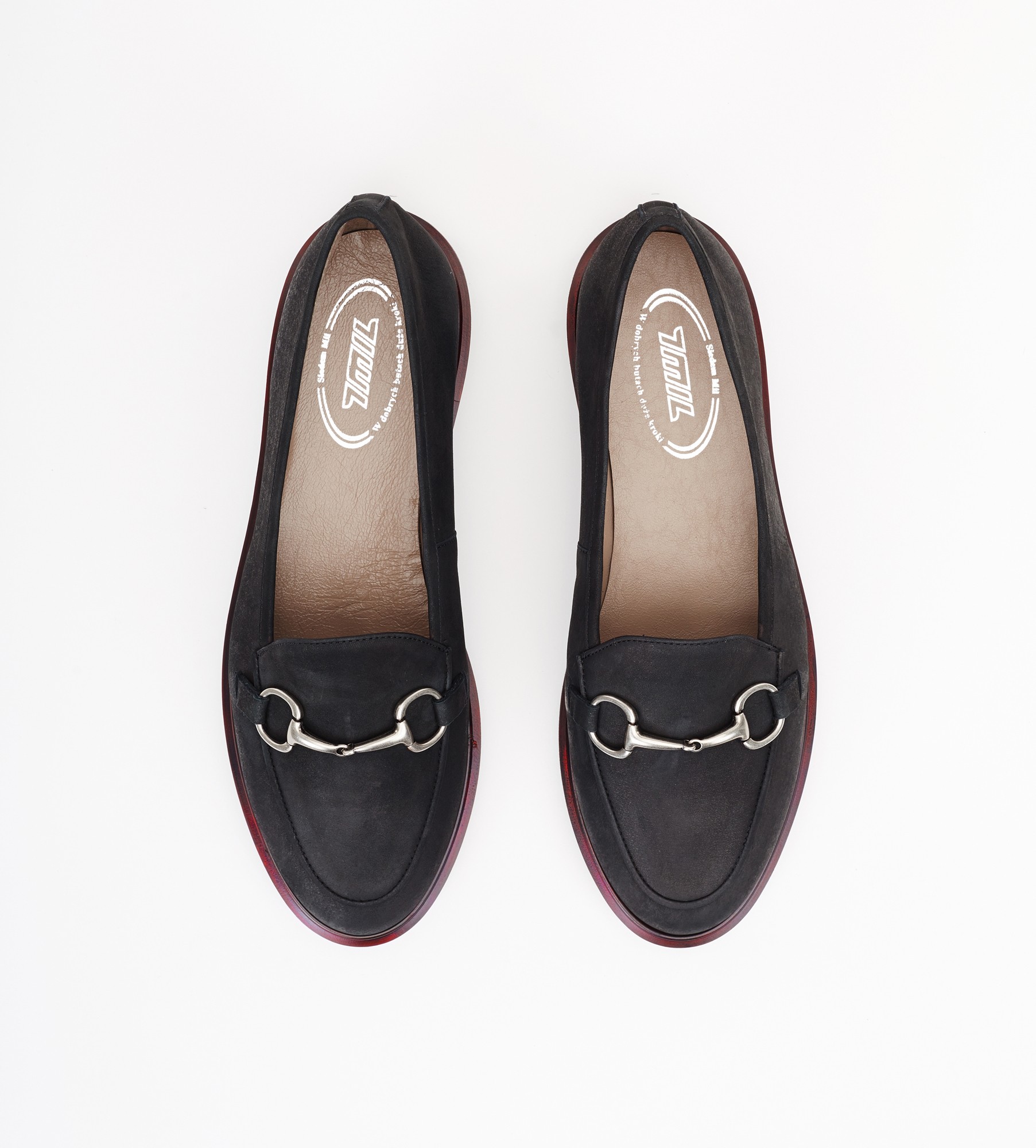 Czarne mokasyny to ponadczasowe klasyczne buty wykonane z naturalnej skóry zamszowej, ozdobione subtelną srebrną ozdobą na przodzie. Wnętrze i wkładka są z miękkiej skóry jagnięcej, co zapewnia wyjątkowy komfort noszenia. Mokasyny mają niski obcas o wysokości 2,5 cm oraz lekką i elastyczną podeszwę z bordowym otokiem, dodającą im charakteru. Idealne na różne okazje, łączą w sobie styl i wygodę.