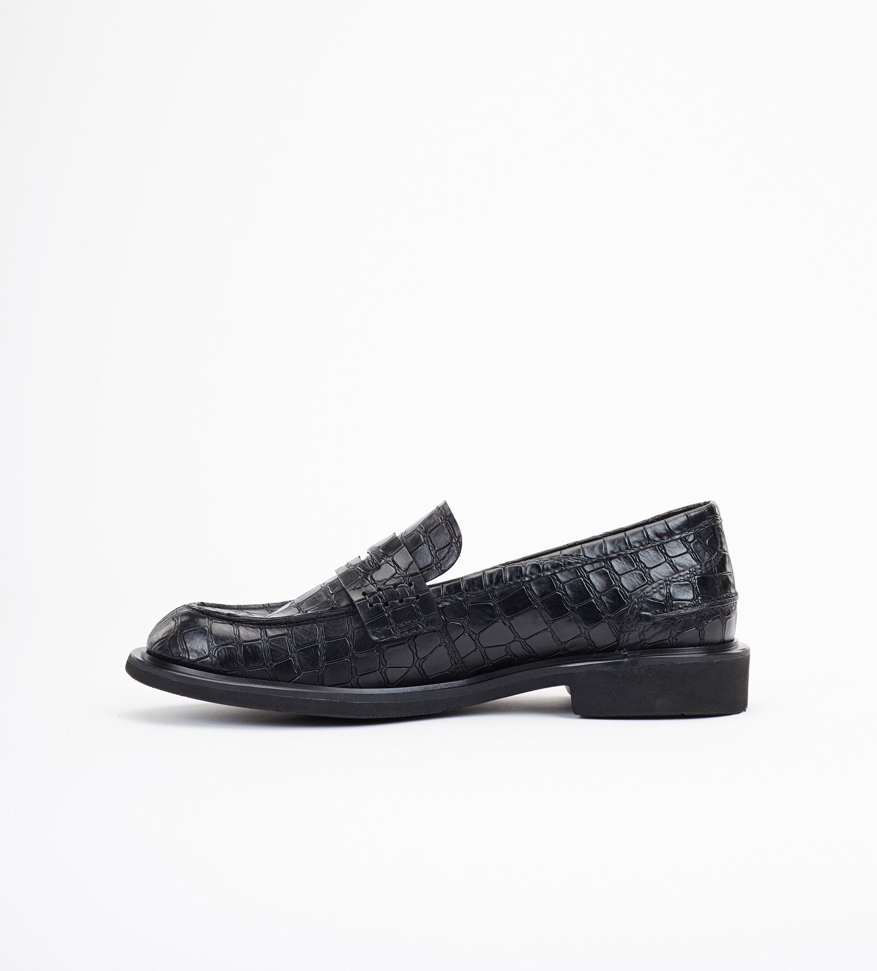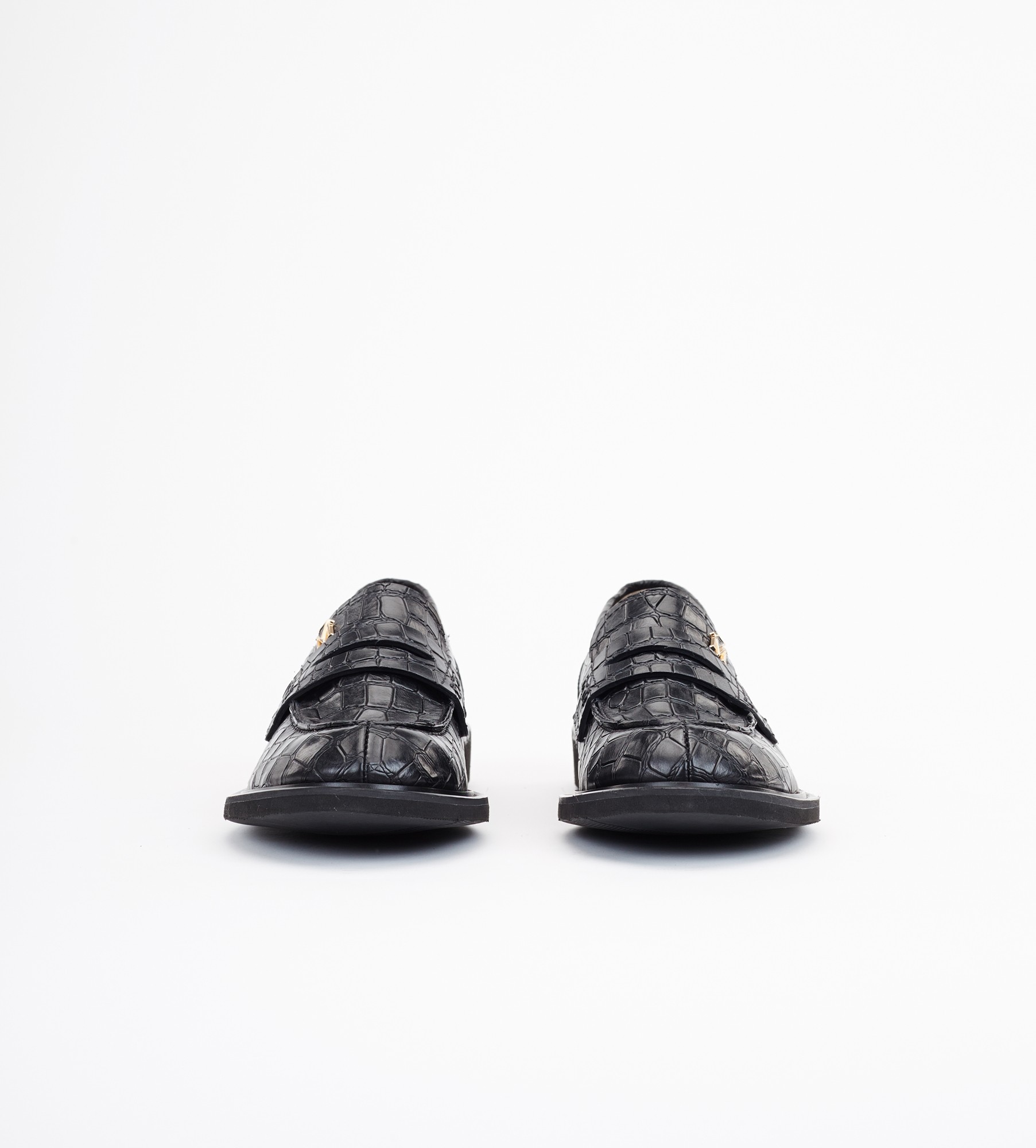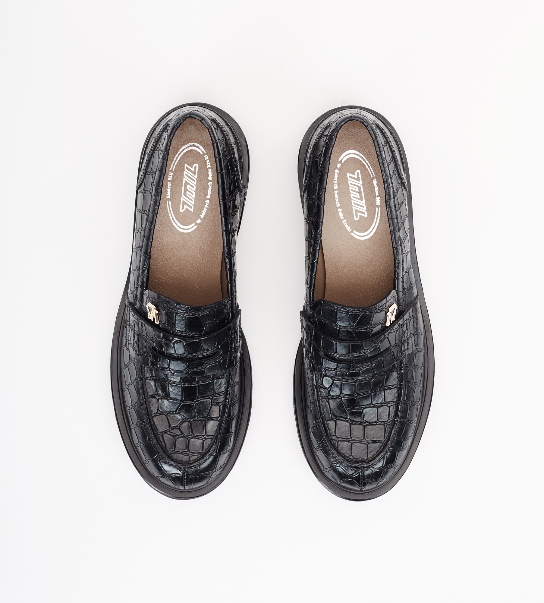 Mokasyny z naturalnej kóry cielęcej w kolorze czarnym wyróżniają się eleganckim designem, na który składa się srebrny ozdobny nit z logo 7MIL umieszczony na języku. Cholewka wykonana jest z naturalnej skóry cielęcej, tłoczonej tak, aby przypominała skórę krokodyla, co nadaje butom luksusowy wygląd. Wnętrze mokasynów wyściełane jest naturalną skórą jagnięcą, zapewniającą miękkość i komfort, a miękka, skórzana wkładka idealnie dopasowuje się do stopy.