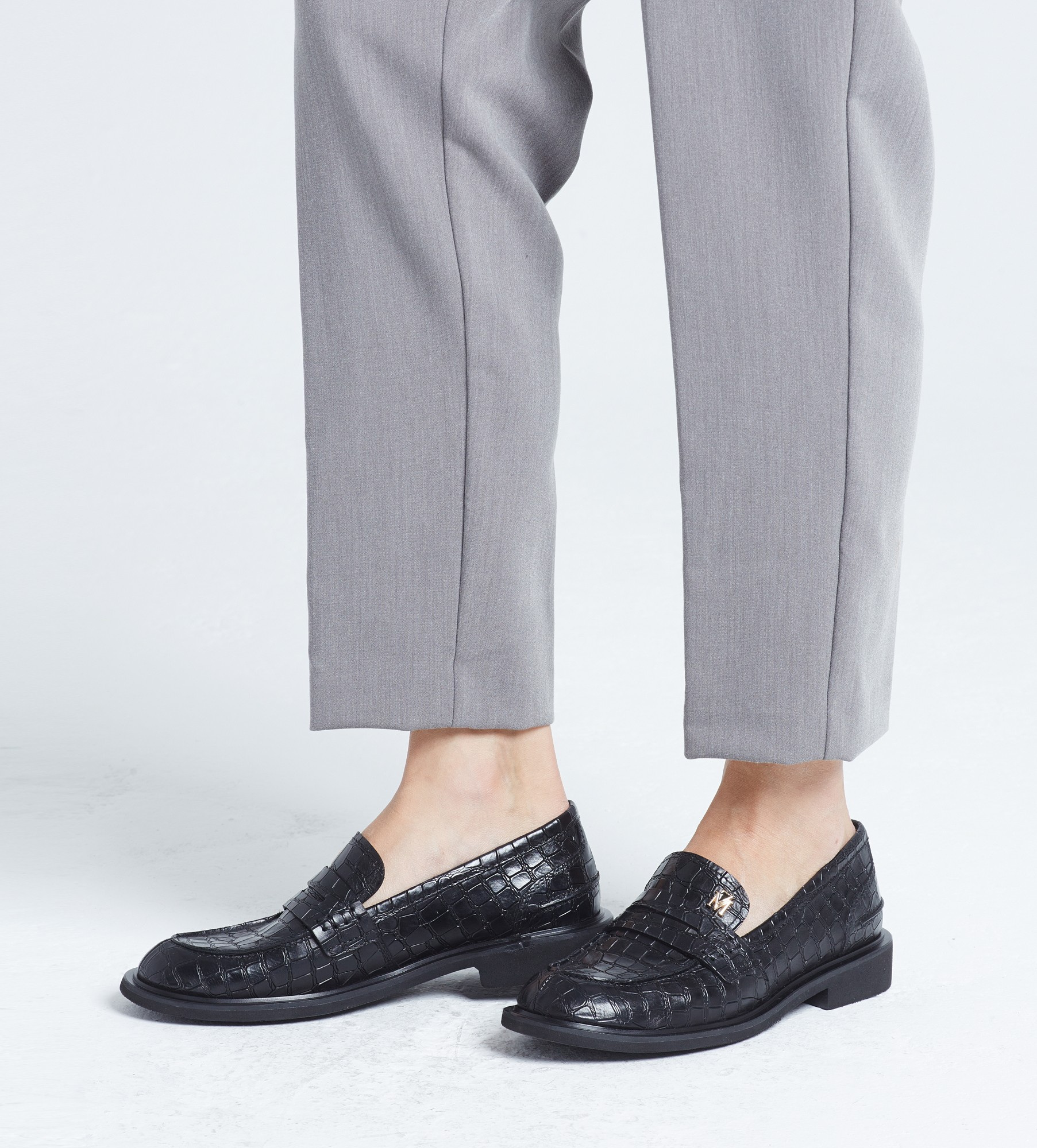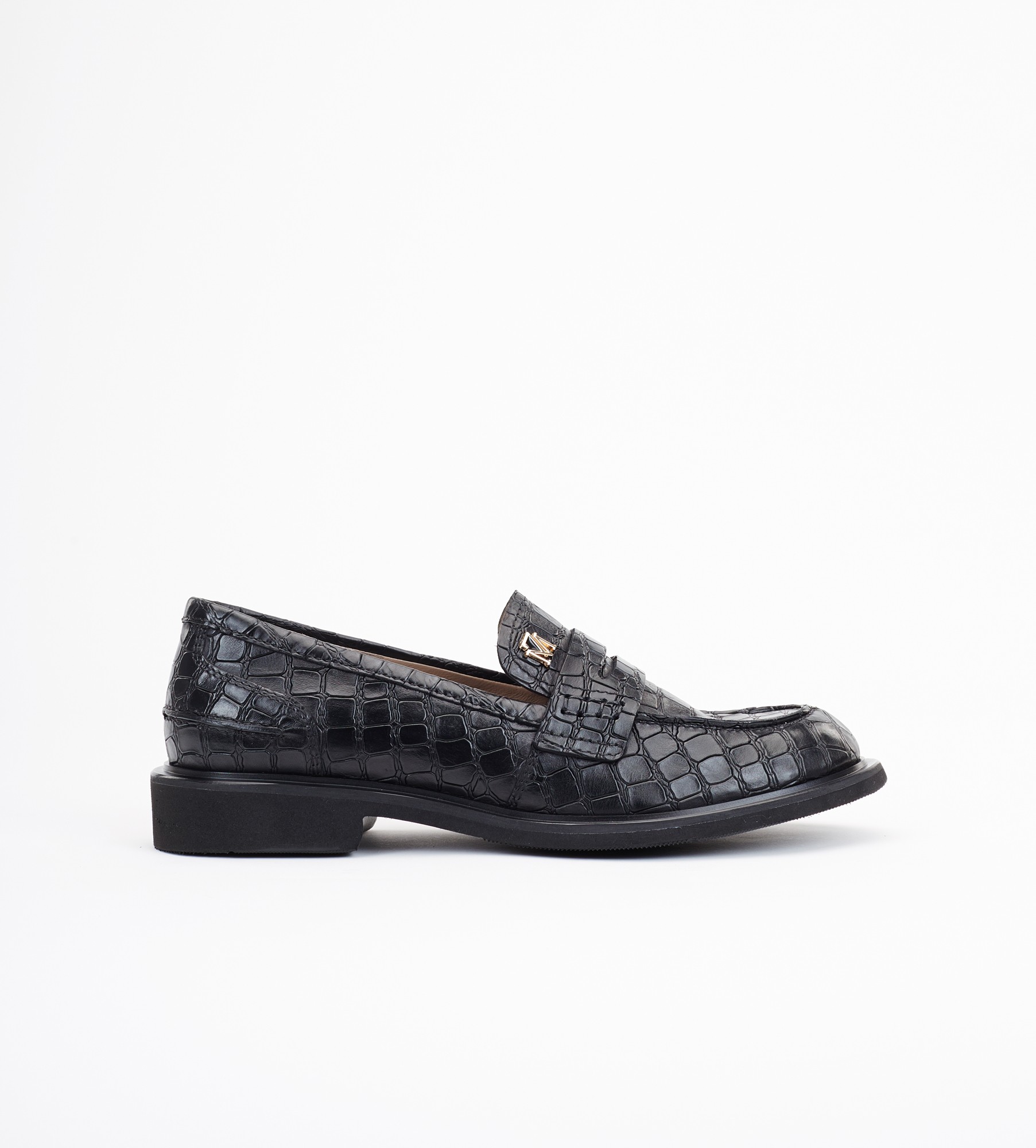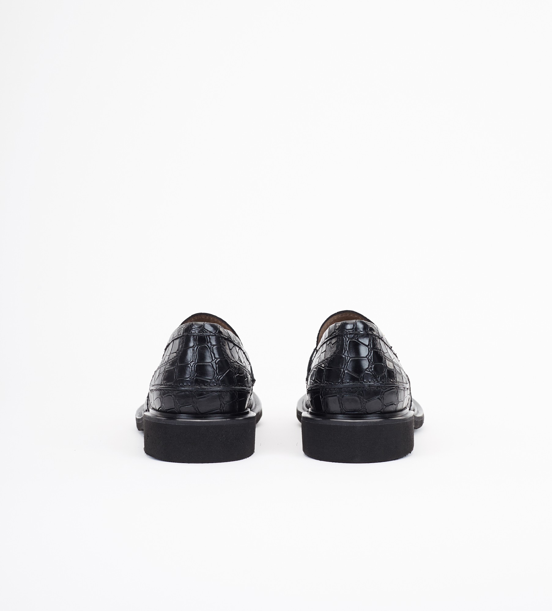 Mokasyny z naturalnej kóry cielęcej w kolorze czarnym wyróżniają się eleganckim designem, na który składa się srebrny ozdobny nit z logo 7MIL umieszczony na języku. Cholewka wykonana jest z naturalnej skóry cielęcej, tłoczonej tak, aby przypominała skórę krokodyla, co nadaje butom luksusowy wygląd. Wnętrze mokasynów wyściełane jest naturalną skórą jagnięcą, zapewniającą miękkość i komfort, a miękka, skórzana wkładka idealnie dopasowuje się do stopy.