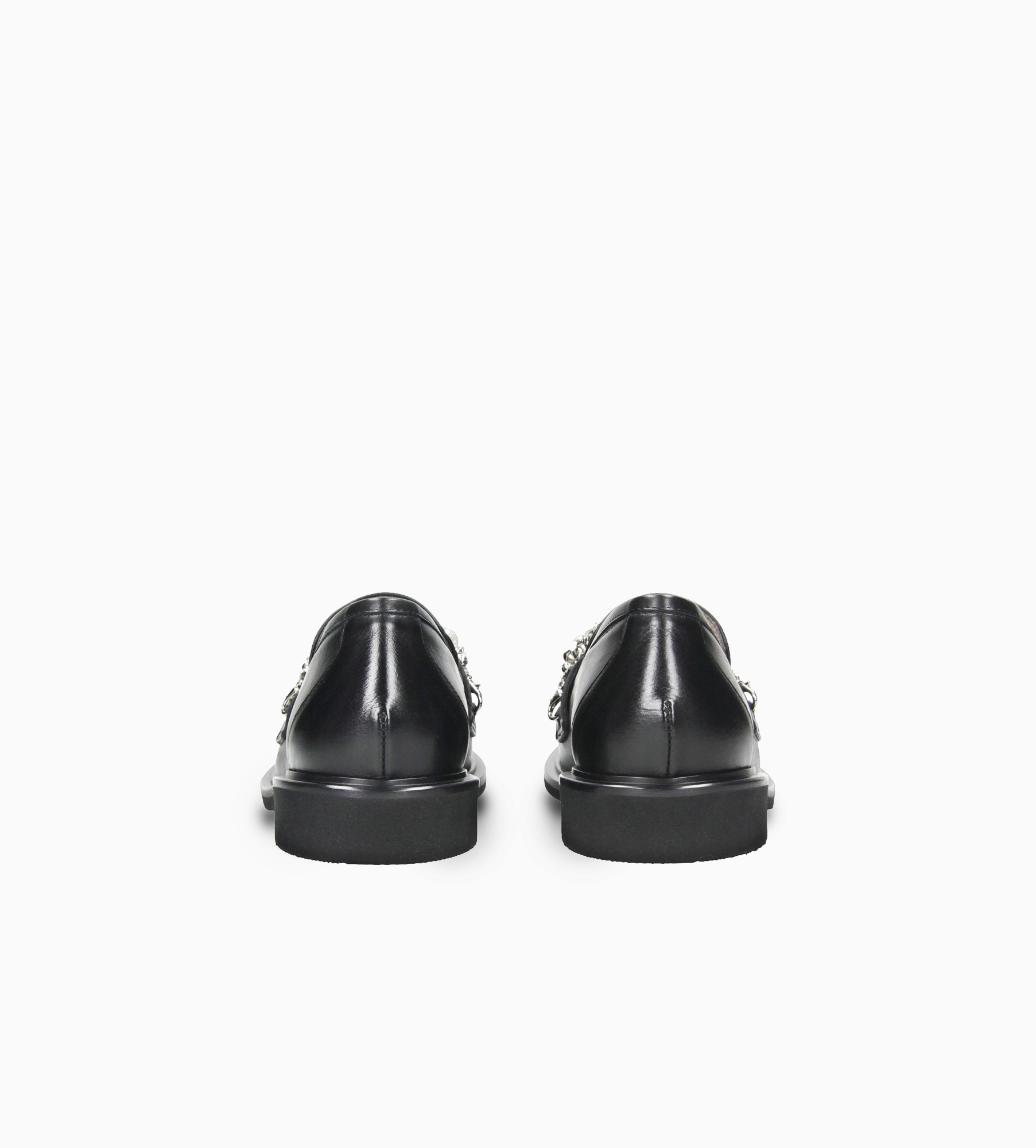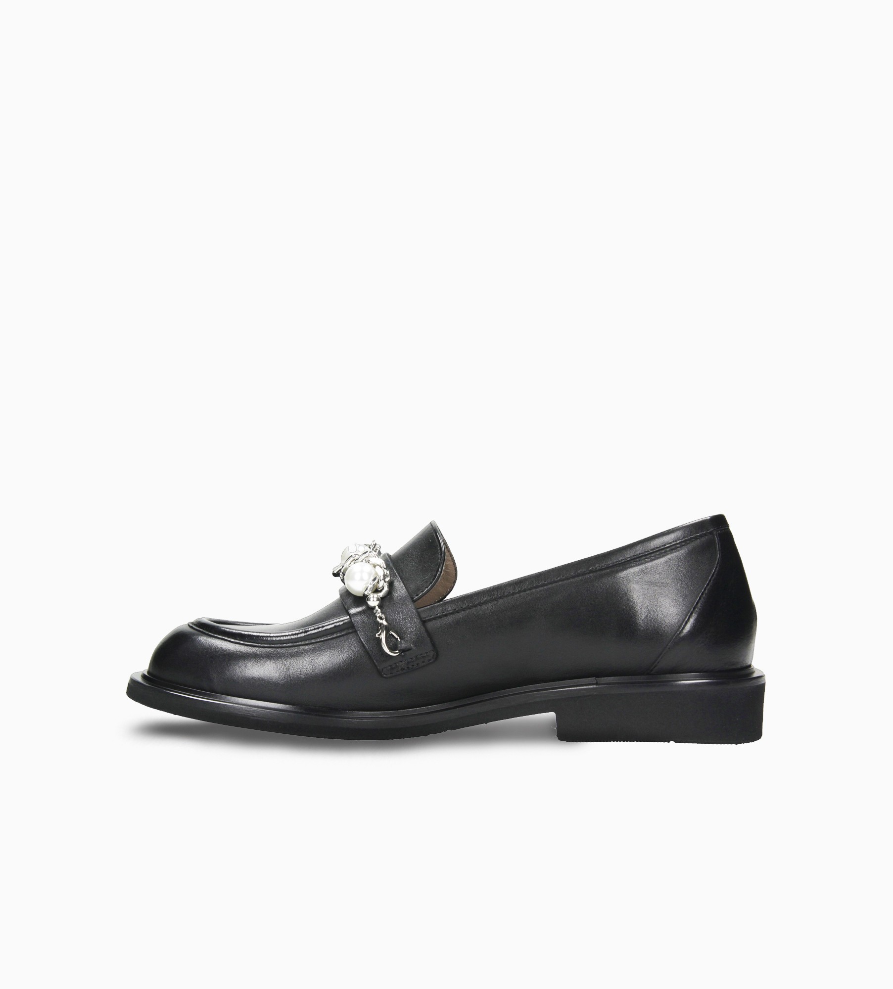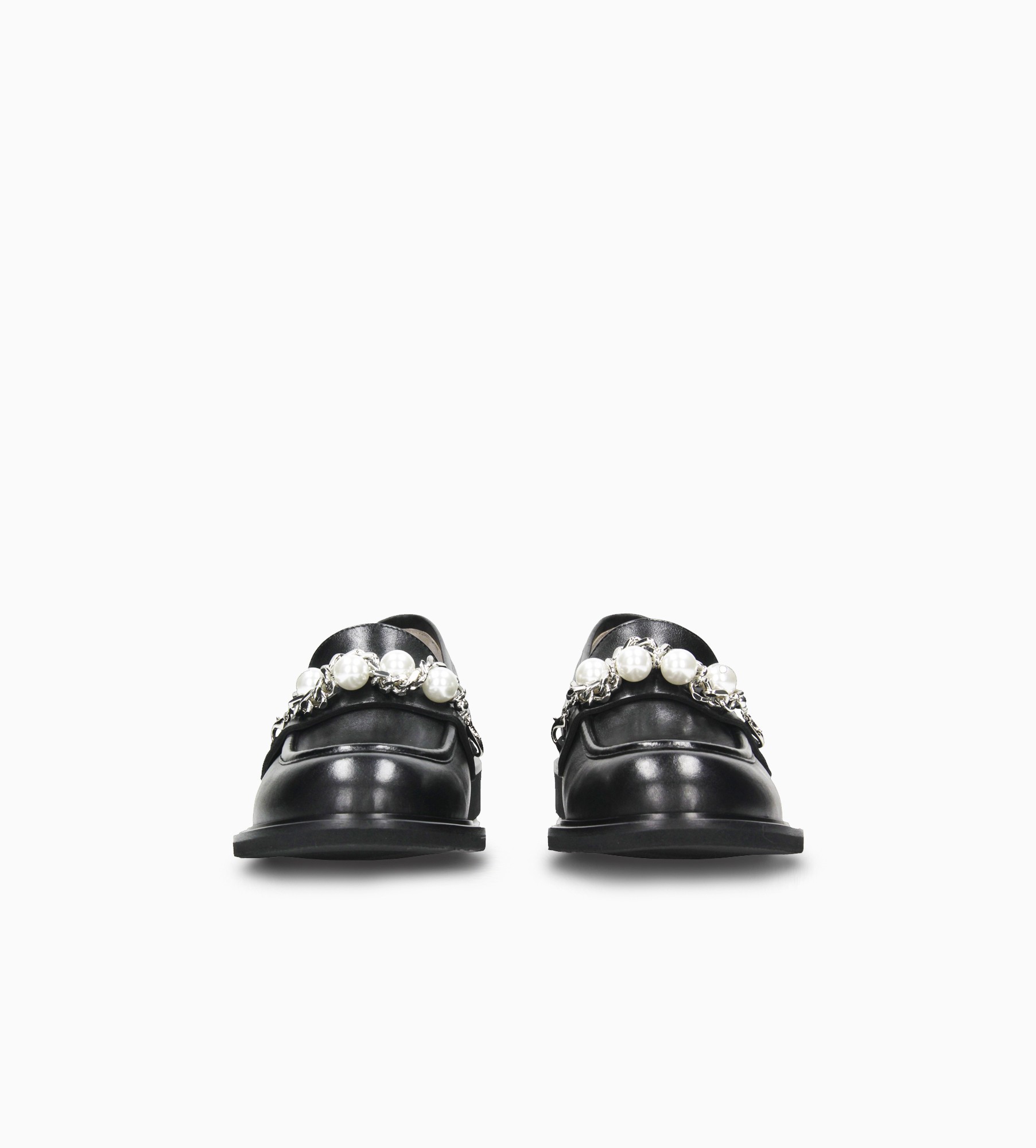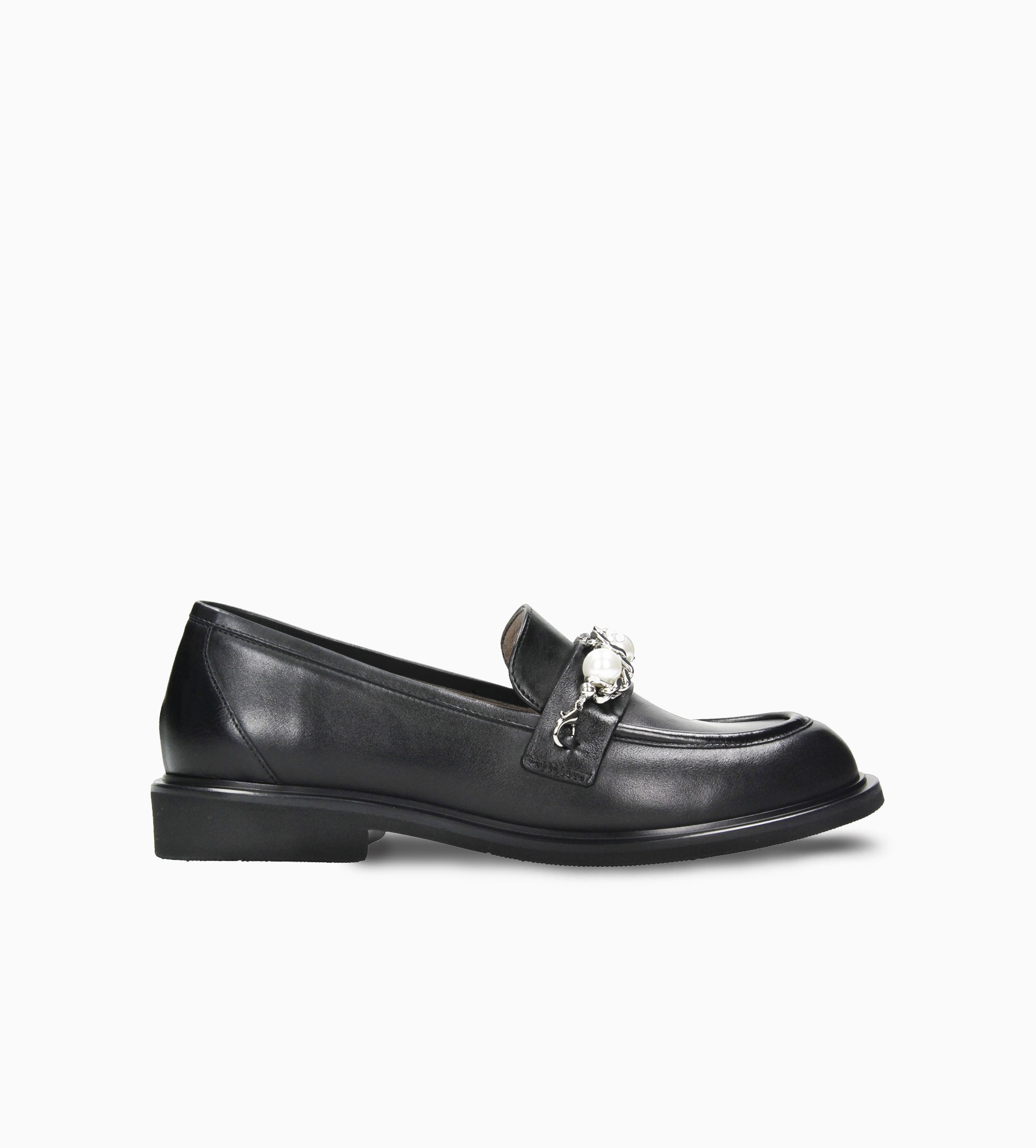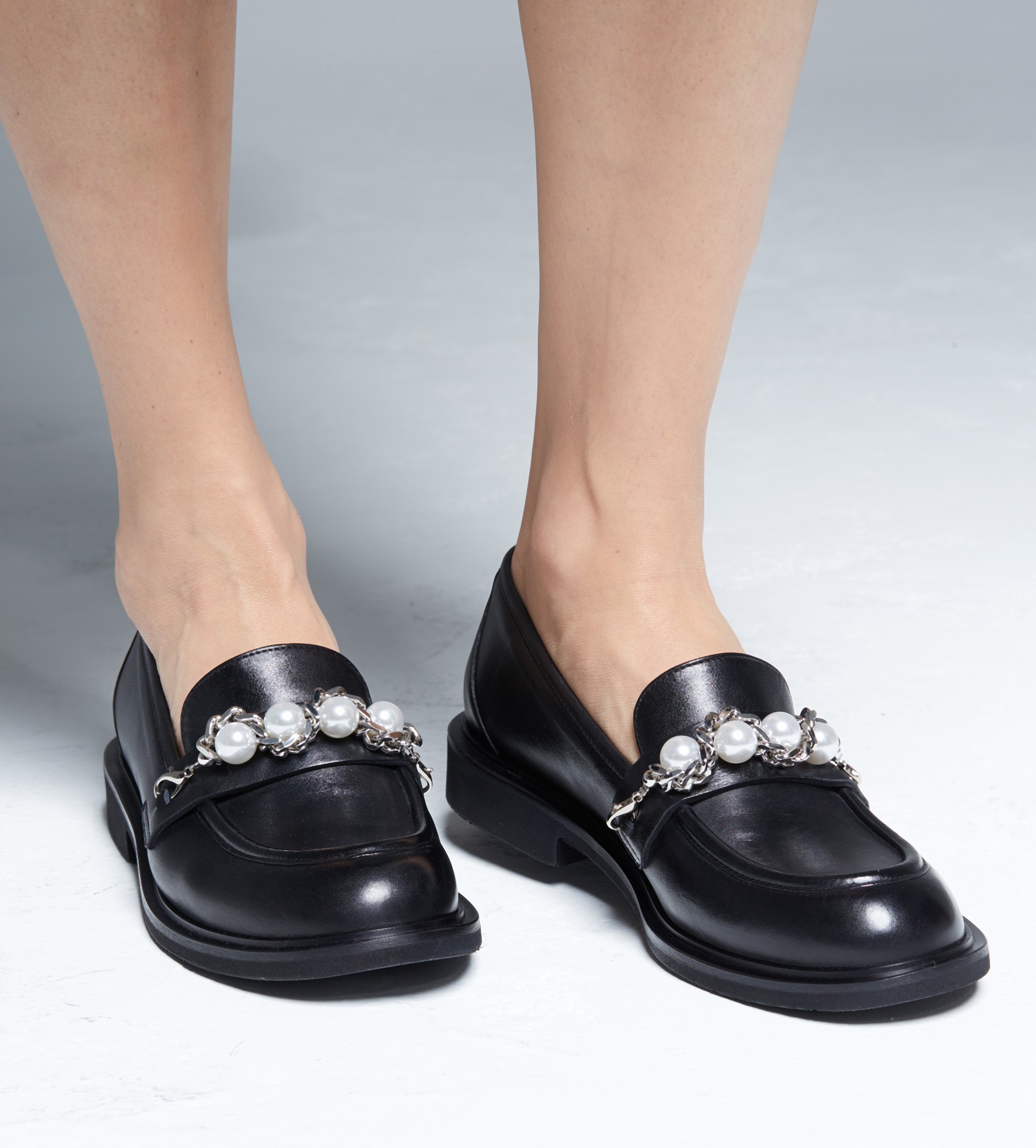 Czarne klasyczne mokasyny wyróżniają się eleganckim designem, na który składa się srebrny ozdobny łańczuszek z perełkami (możliwość odpiecia ozdoby) umieszczony na języku. Cholewka wykonana jest z naturalnej skóry cielęcej. Wnętrze mokasynów wyściełane jest naturalną skórą jagnięcą, zapewniającą miękkość i komfort, a miękka, skórzana wkładka idealnie dopasowuje się do stopy.