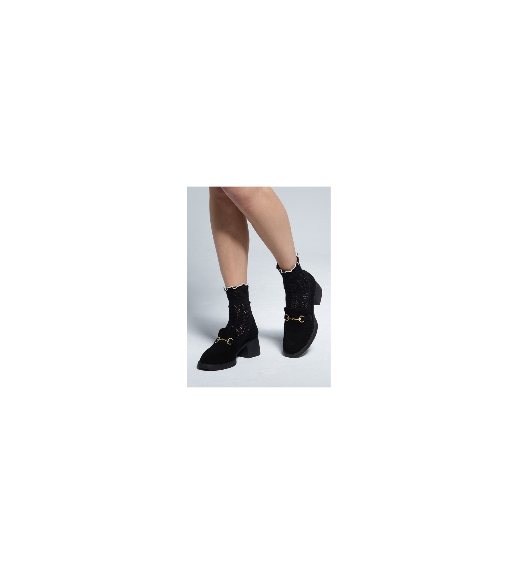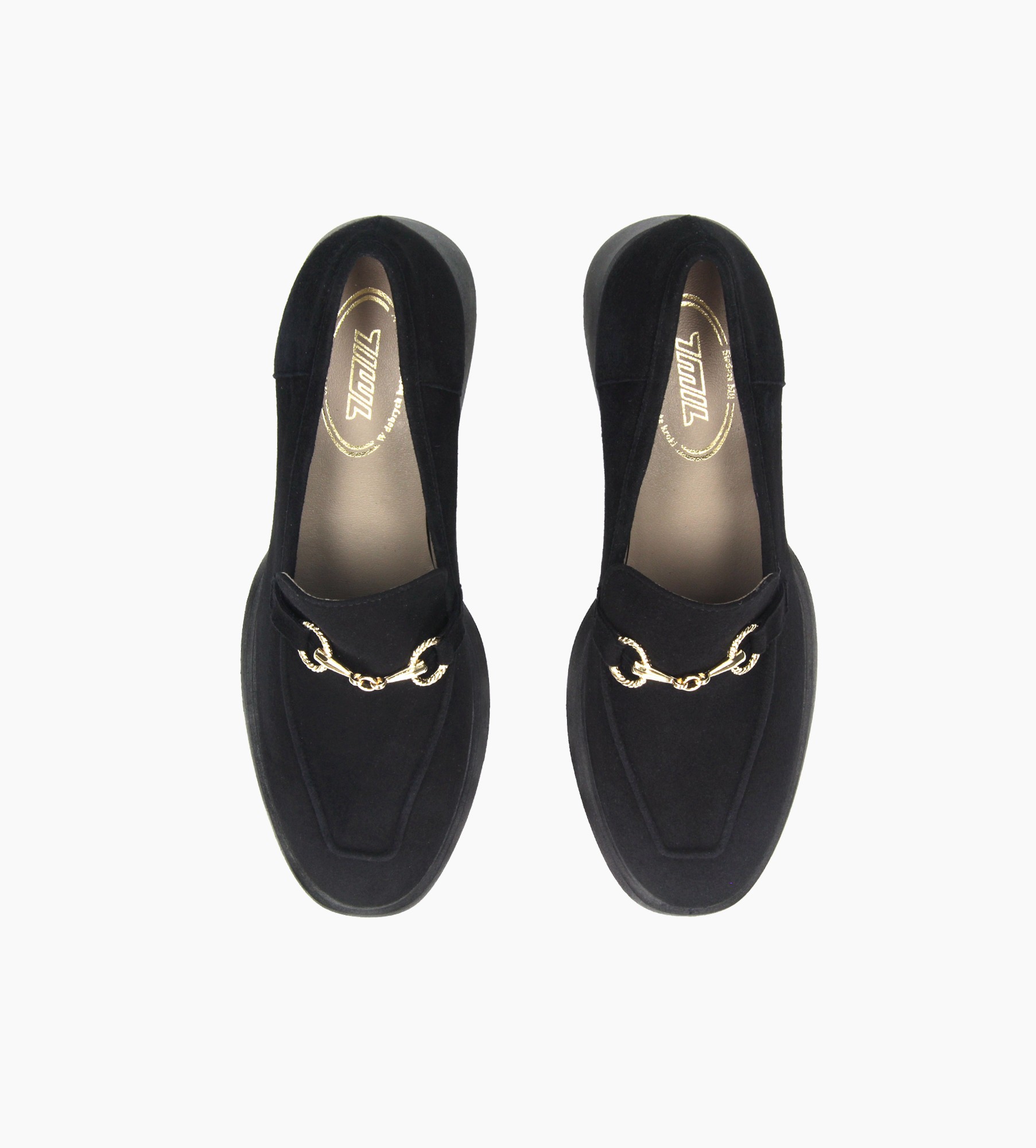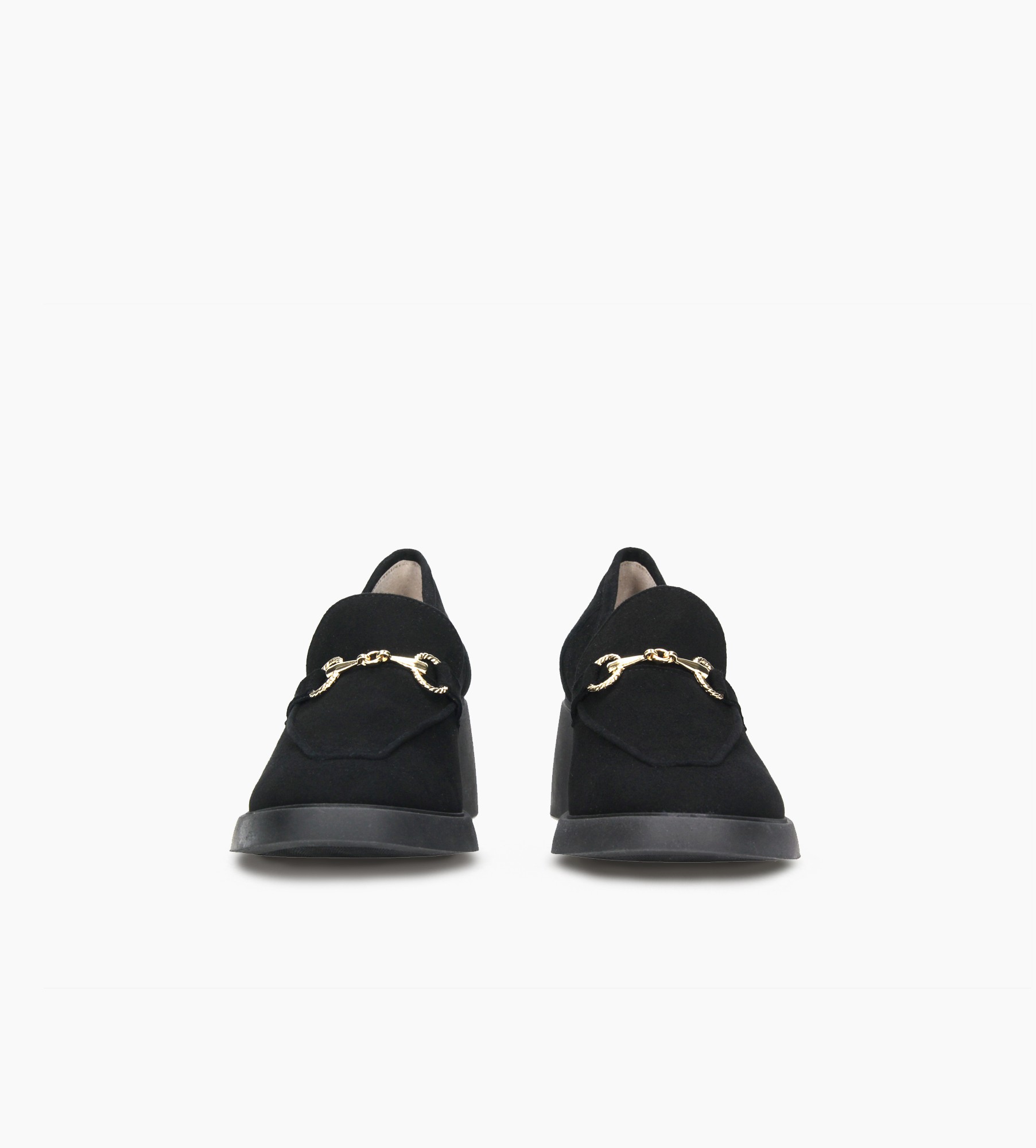 Czarne mokasyny damskie z naturalnej skóry zamszowej to kwintesencja elegancji i wygody. Wyróżniają się złotą ozdobą, która dodaje im szyku. Wnętrze buta wyściełane jest miękką skórą jagnięcą, co zapewnia komfort noszenia przez cały dzień. Solidny, 6-centymetrowy obcas dodaje delikatnej wysokości, idealnie komponując się z klasyczną sylwetką buta. Te mokasyny doskonale sprawdzą się zarówno w eleganckich, jak i codziennych stylizacjach.