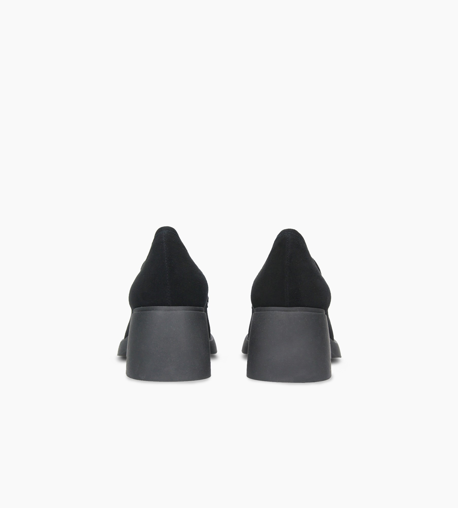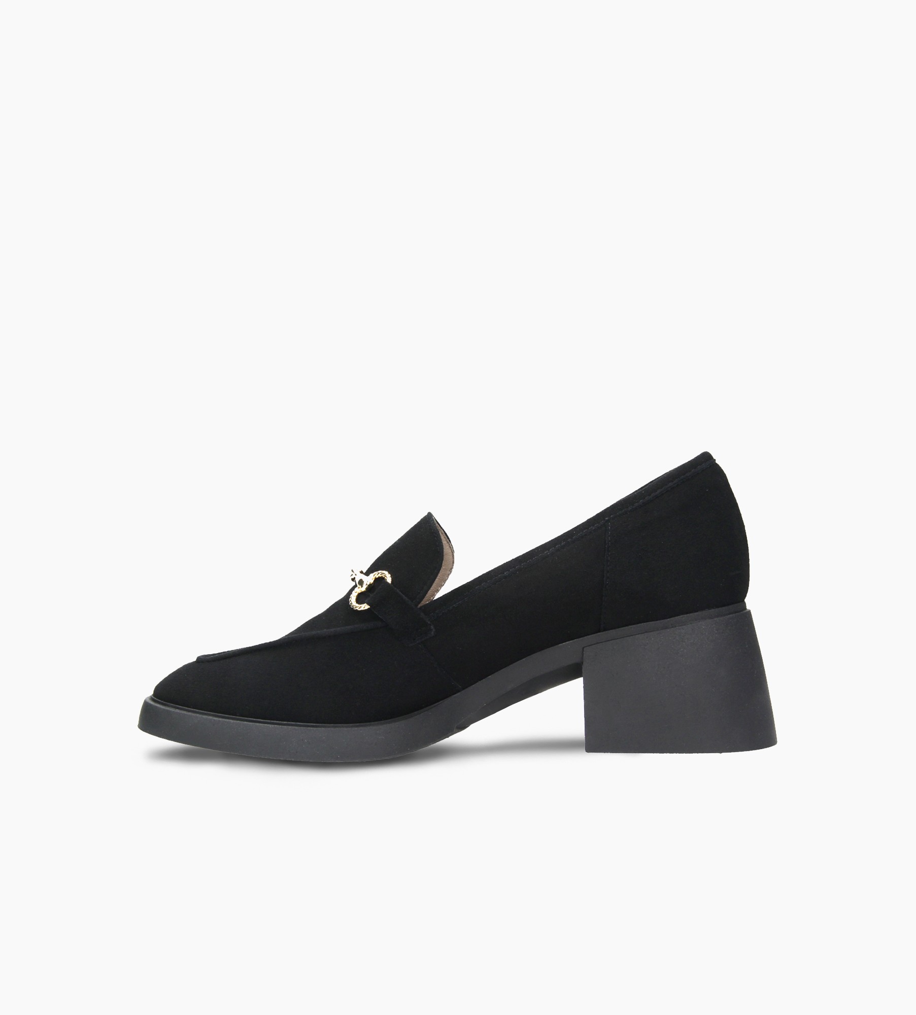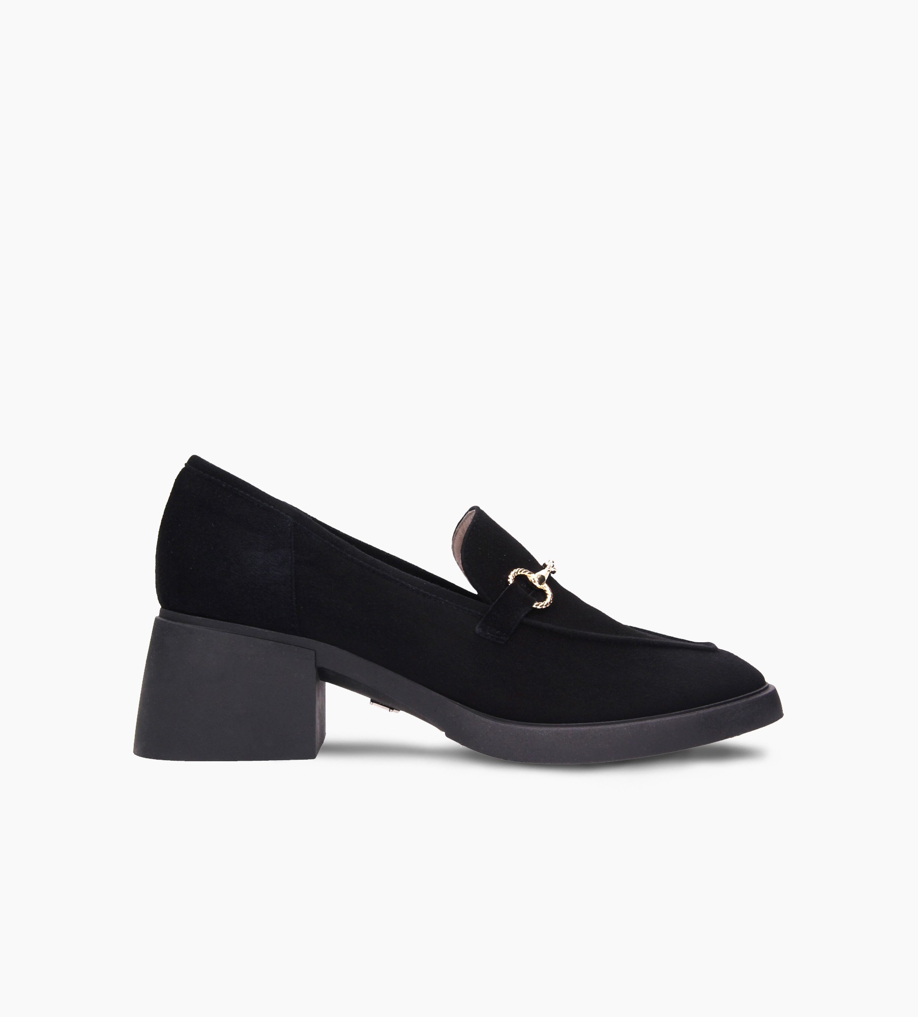 Czarne mokasyny damskie z naturalnej skóry zamszowej to kwintesencja elegancji i wygody. Wyróżniają się złotą ozdobą, która dodaje im szyku. Wnętrze buta wyściełane jest miękką skórą jagnięcą, co zapewnia komfort noszenia przez cały dzień. Solidny, 6-centymetrowy obcas dodaje delikatnej wysokości, idealnie komponując się z klasyczną sylwetką buta. Te mokasyny doskonale sprawdzą się zarówno w eleganckich, jak i codziennych stylizacjach.