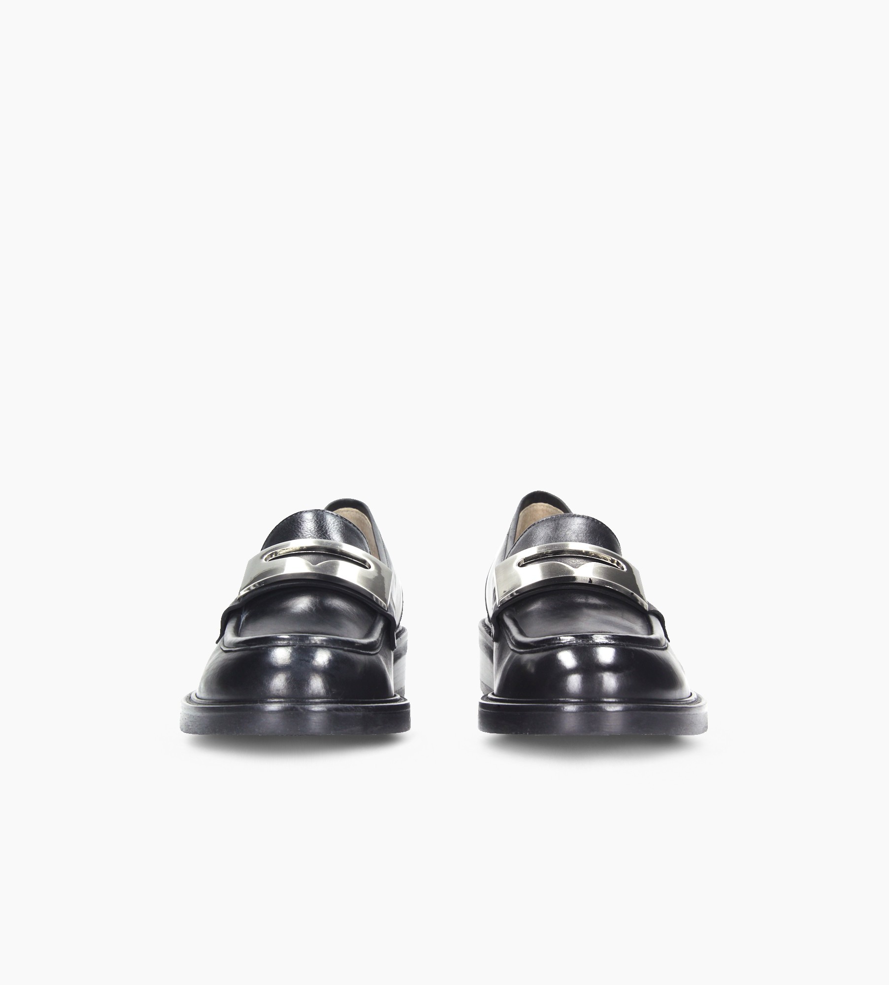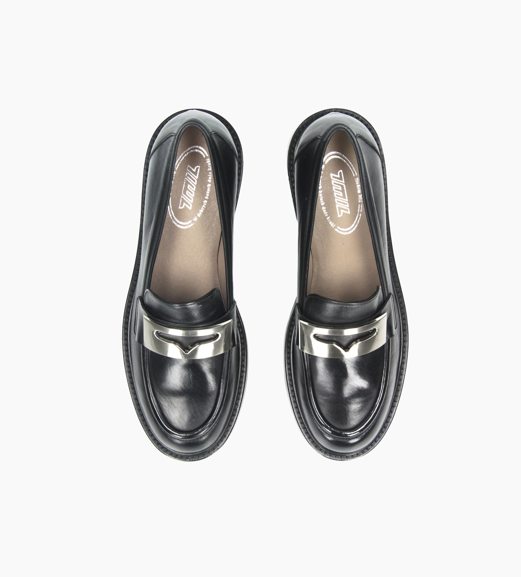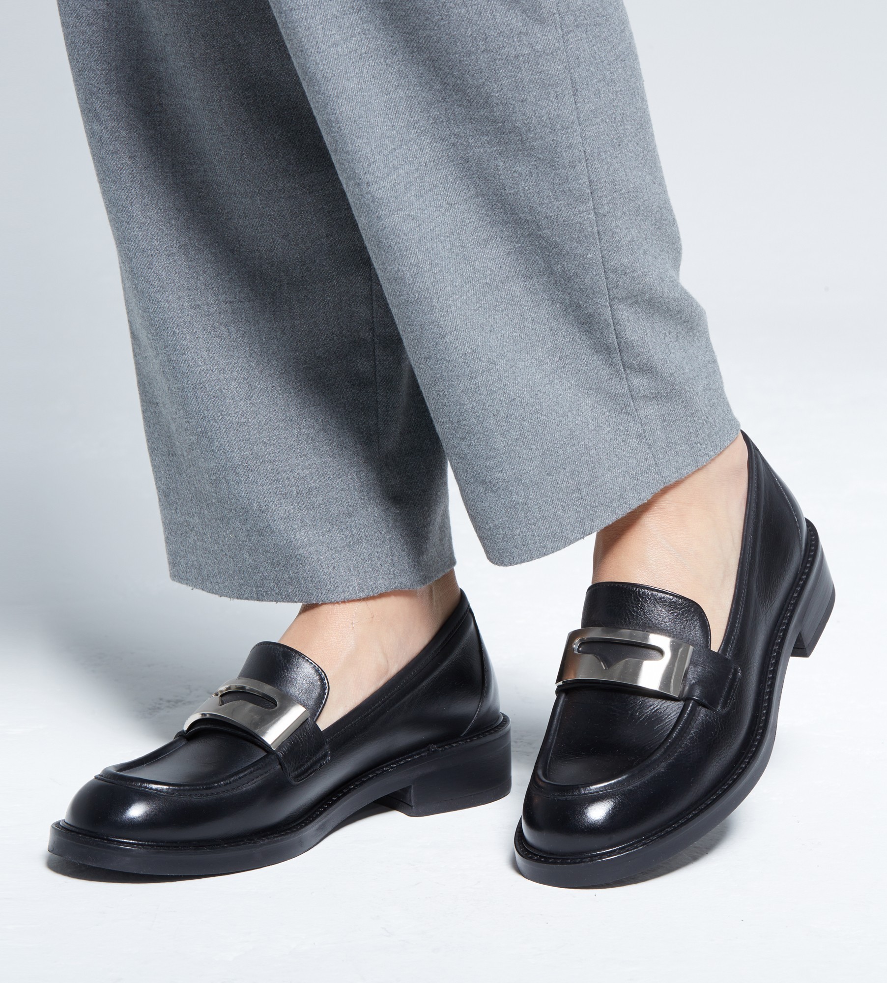 Czarne mokasyny damskie z naturalnej skóry cielęcej to elegancka propozycja dla kobiet ceniących klasyczny styl i komfort. Wykonane z najwyższej jakości skóry cielęcej, te buty wyróżniają się srebrną ozdobą na przodzie, co dodaje im szyku i elegancji. Dzięki skórzanej wkładce i futrówce, są niezwykle wygodne w noszeniu. Niewysoki, 3,5 cm obcas dodaje delikatnej wysokości, zachowując jednocześnie stabilność. Idealne na różne okazje, od codziennych spacerów po bardziej formalne wyjścia.