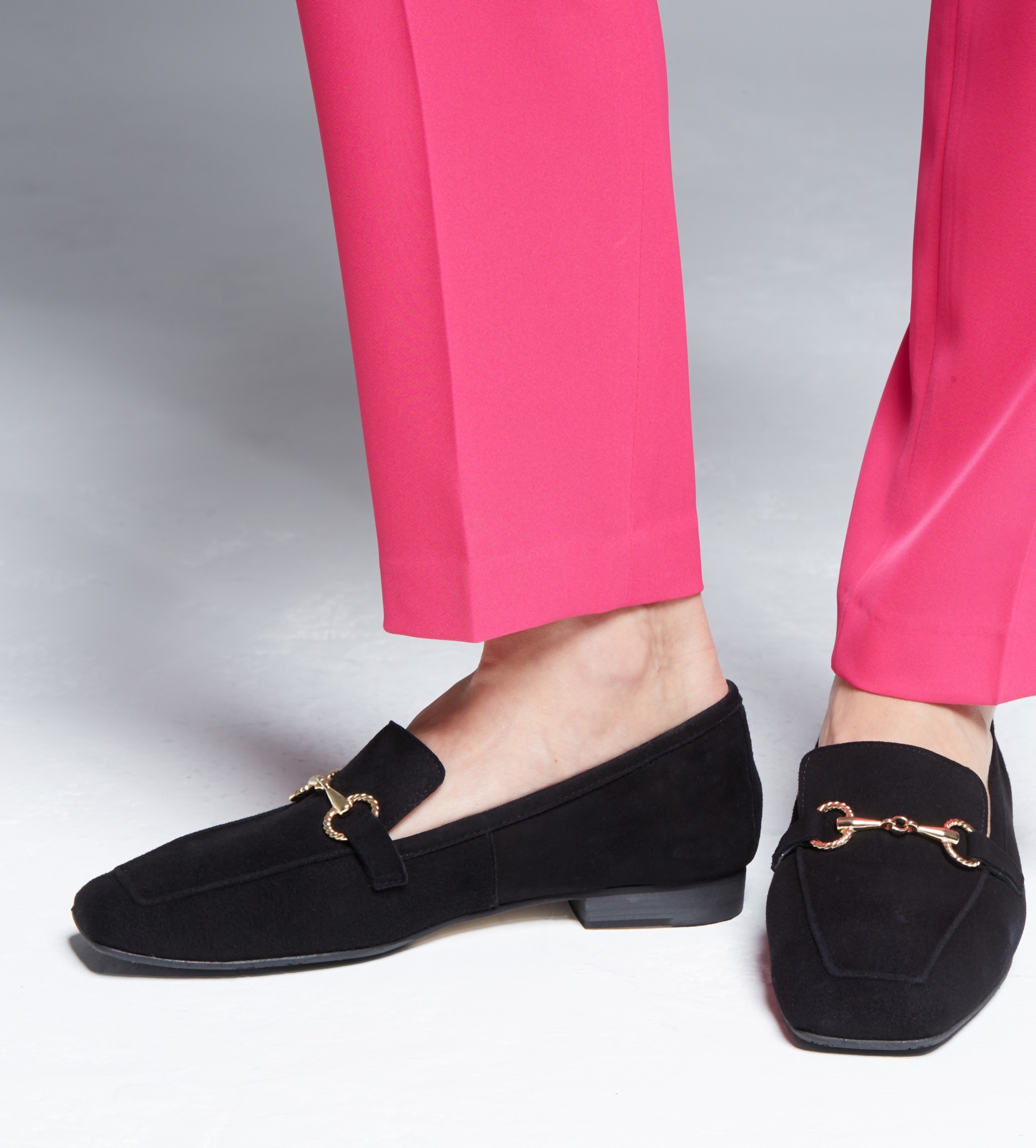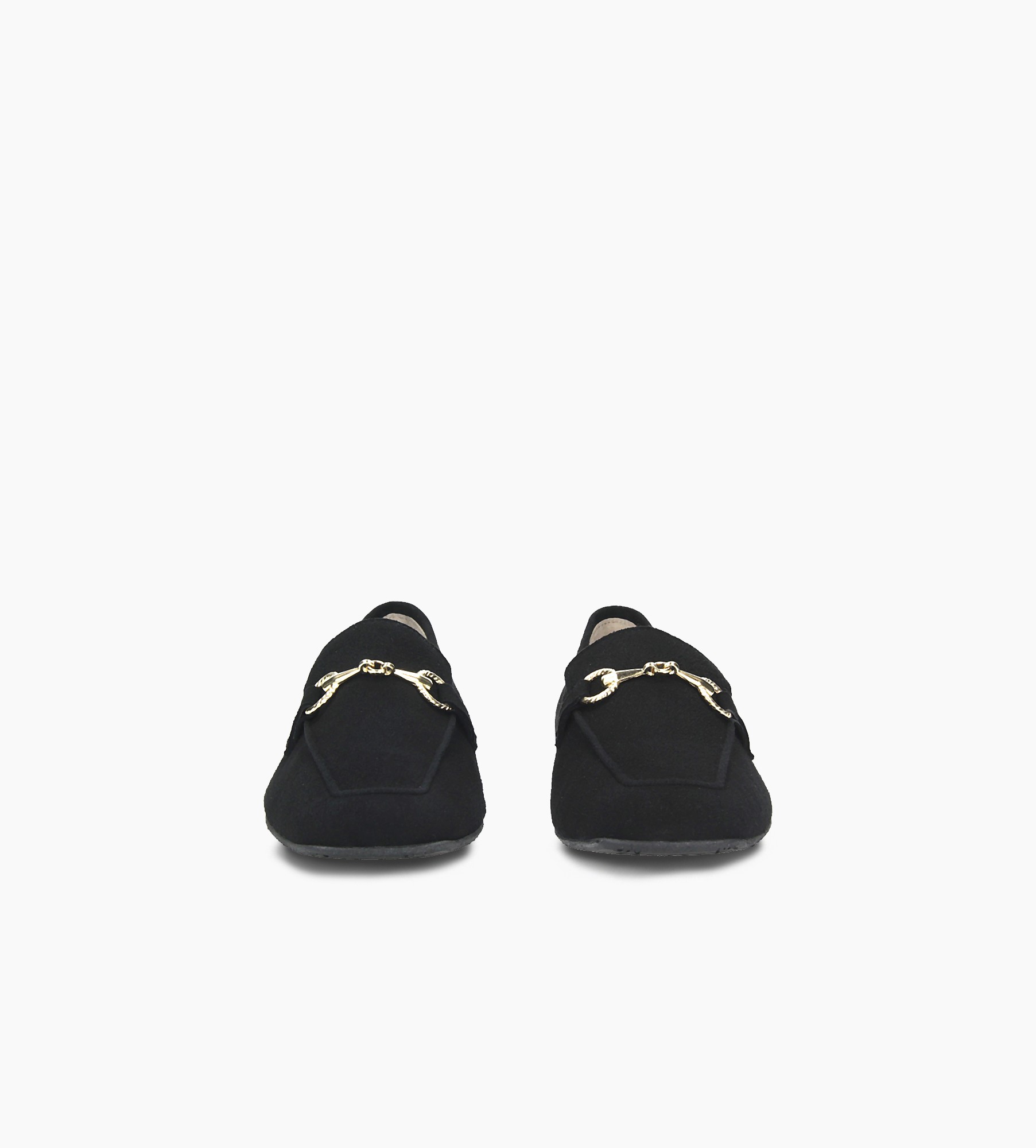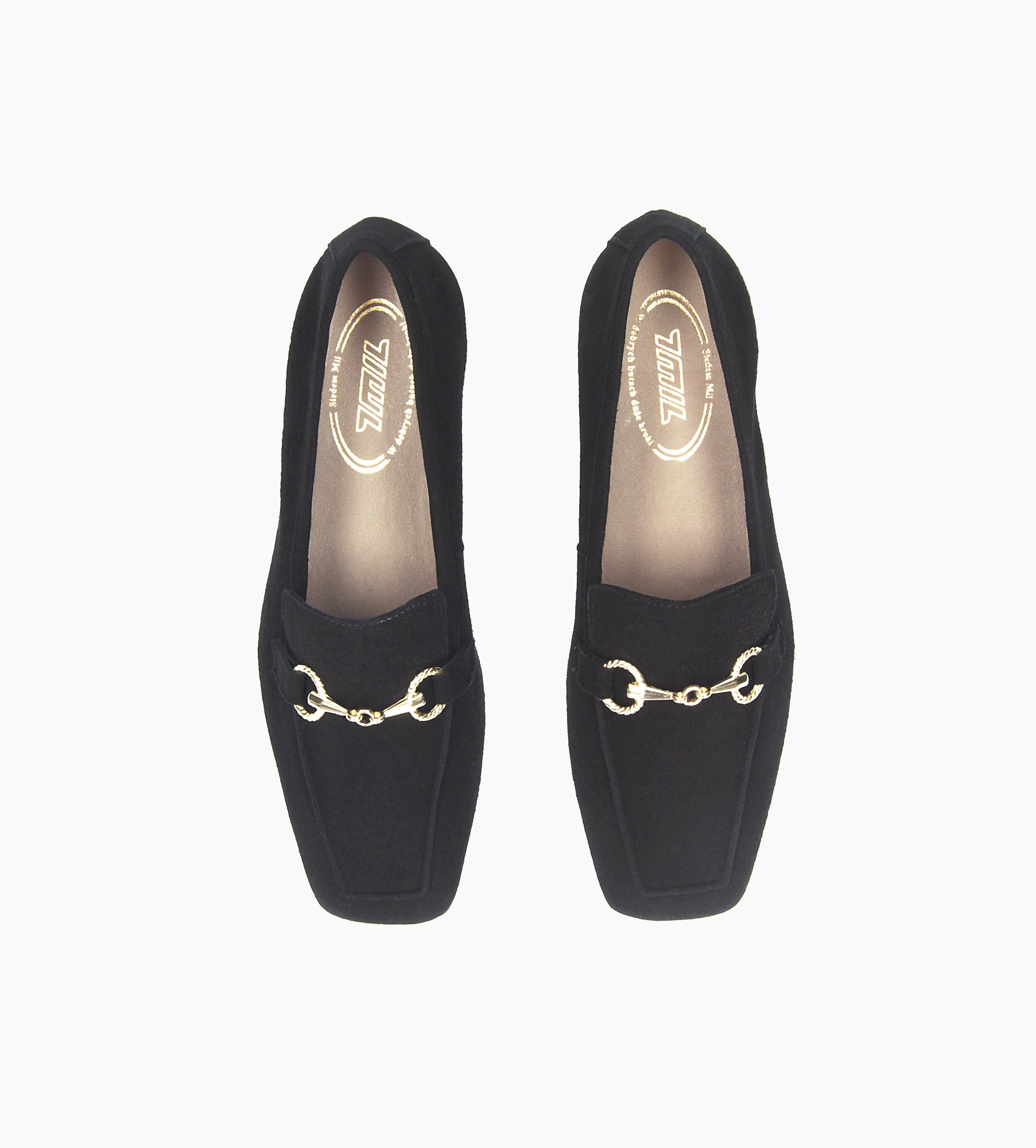 Czarne mokasyny to połączenie klasy i wygody, idealne dla nowoczesnej kobiety, która ceni sobie zarówno styl, jak i komfort. Cholewka wykonana z naturalnej zamszowej skóry w pięknym czarnym odcieniu jest subtelnie ozdobiona złotą aplikacją i modnym ściętym czubkiem. Wnętrze butów wyściełane jest miękką, naturalną skórą jagnięcą, co gwarantuje wyjątkowy komfort noszenia przez cały dzień. Miękka, skórzana wkładka oraz podeszwa sprawiają, że każdy krok staje się przyjemnością. Z wysokością obcasa 2 cm, mokasyny te delikatnie podnoszą sylwetkę, zachowując jednocześnie wygodę płaskiego buta.