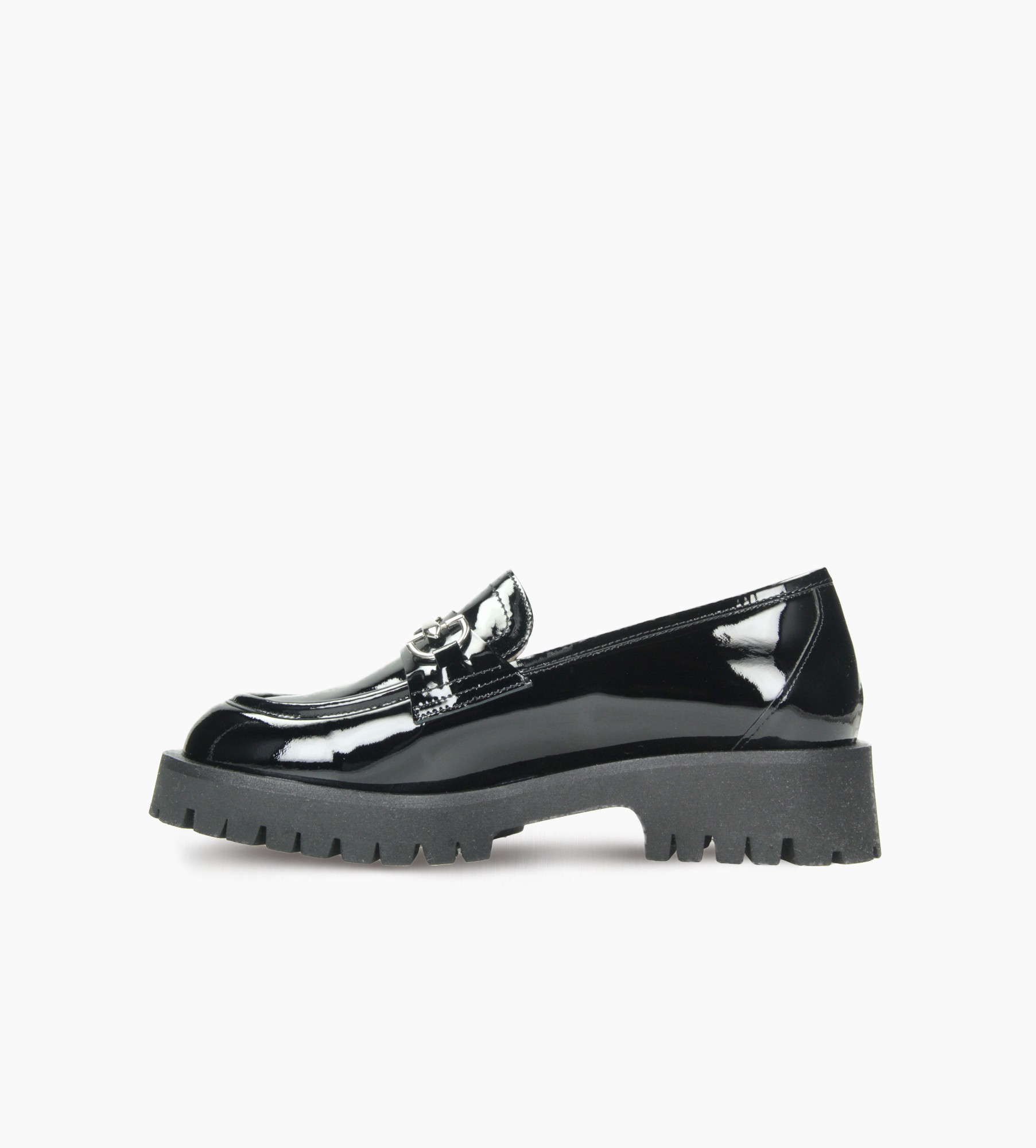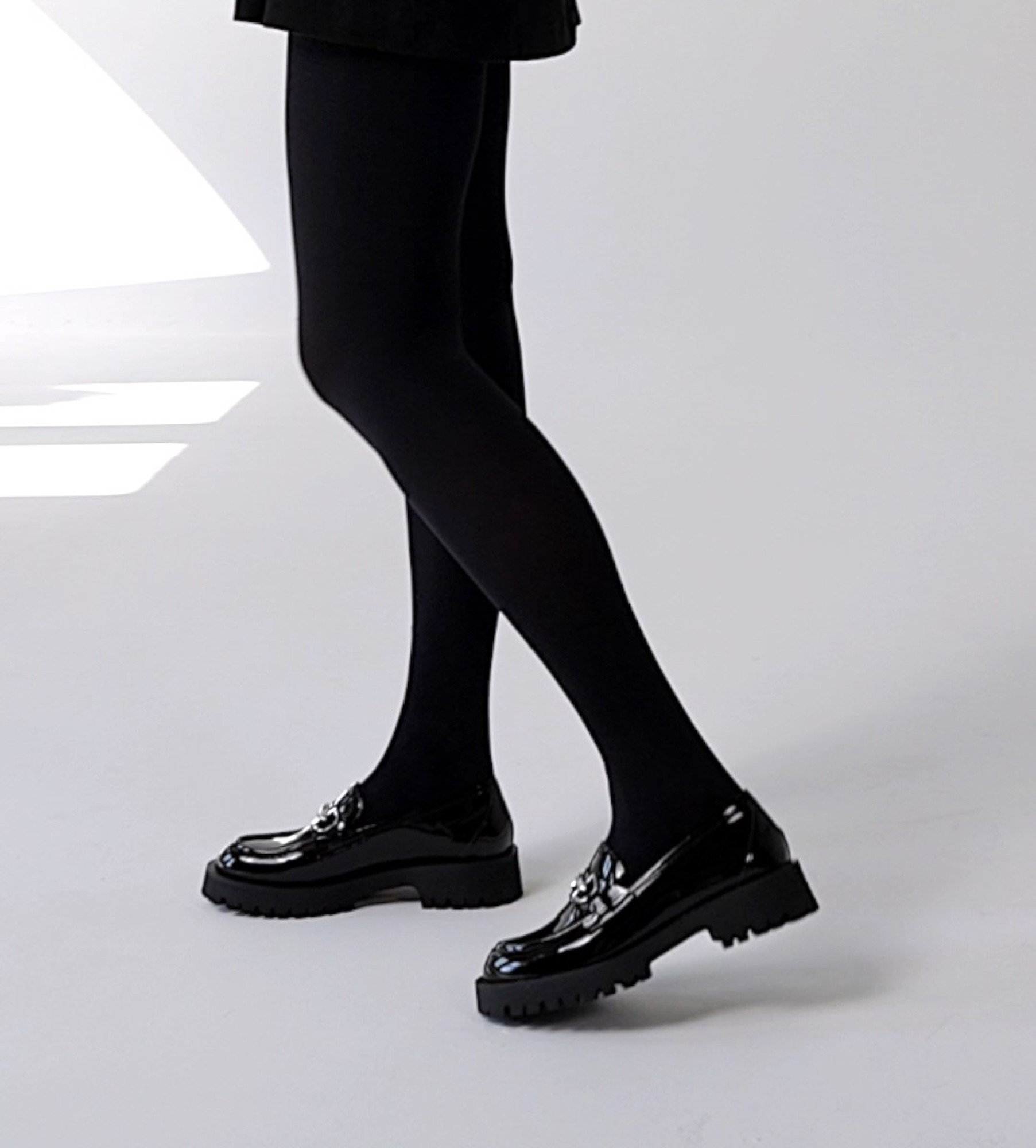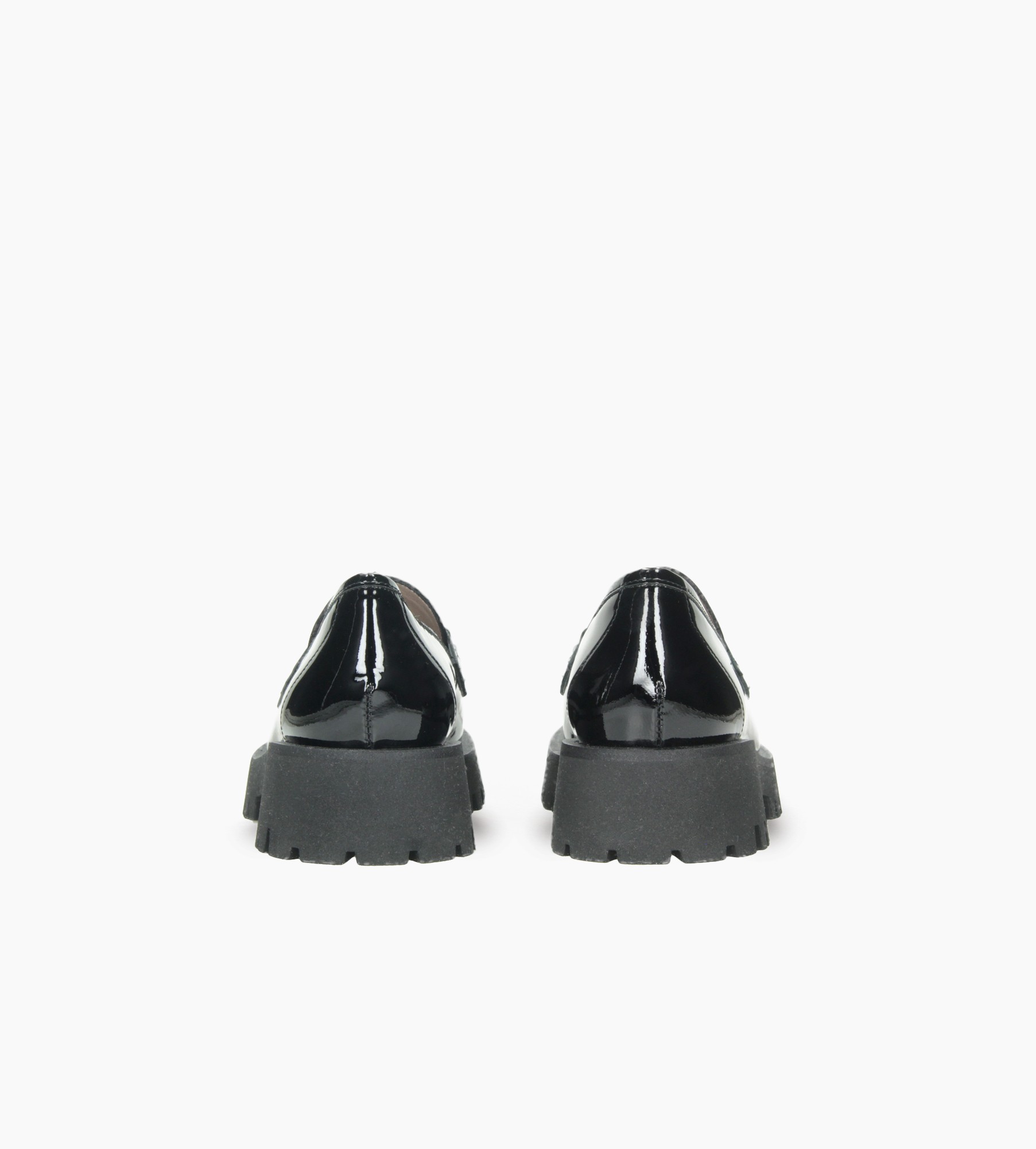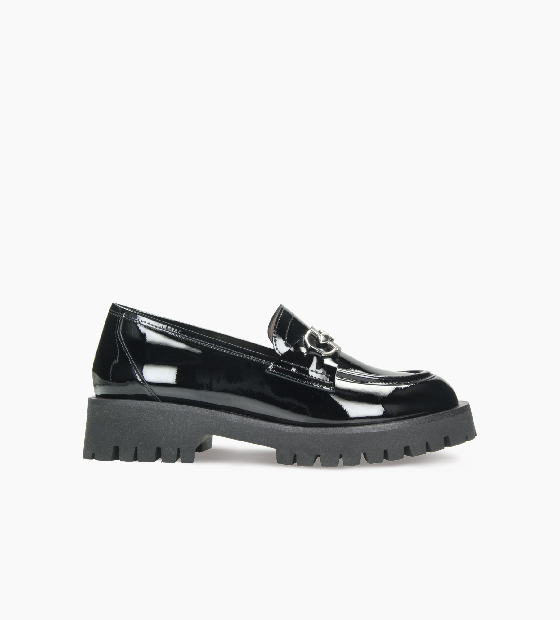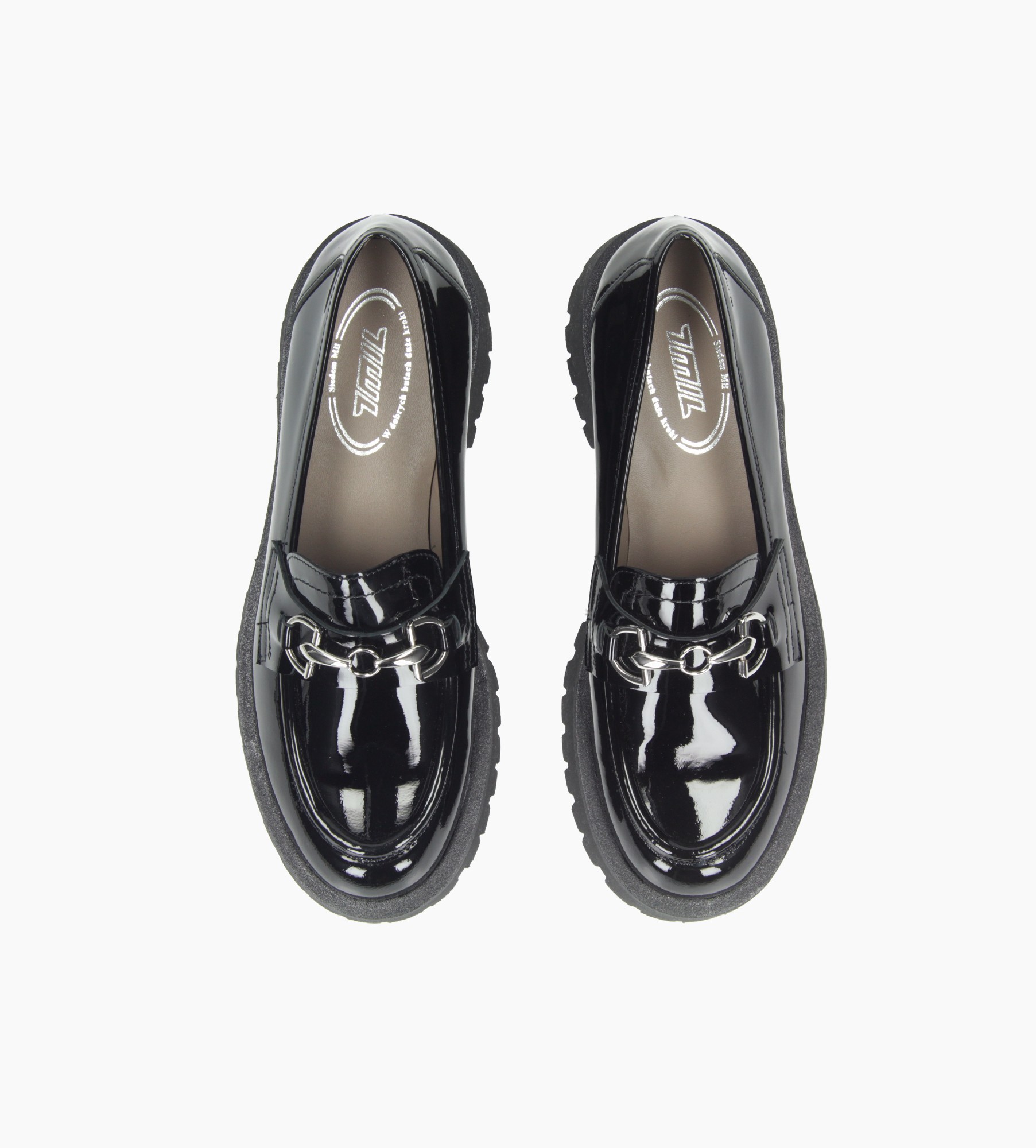 Czarne lakierowane mokasyny to stylowe i nowoczesne obuwie, które łączy elegancję z odrobiną drapieżności. Charakteryzują się one połyskującą, lakierowaną skórą, która nadaje im efektywnego wyglądu. Grubsza podeszwa dodaje im nieco masywności, co sprawia, że są zarówno modne, jak i wygodne, idealnie wpisując się w trendy. Na przodzie mokasyn znajduje się srebrna ozdoba, która przyciąga wzrok i dodaje im elegancji. Ten detal nadaje butom subtelny, ale zauważalny akcent biżuteryjny, który może być idealnym uzupełnieniem różnych stylizacji, od casualowych po bardziej formalne.