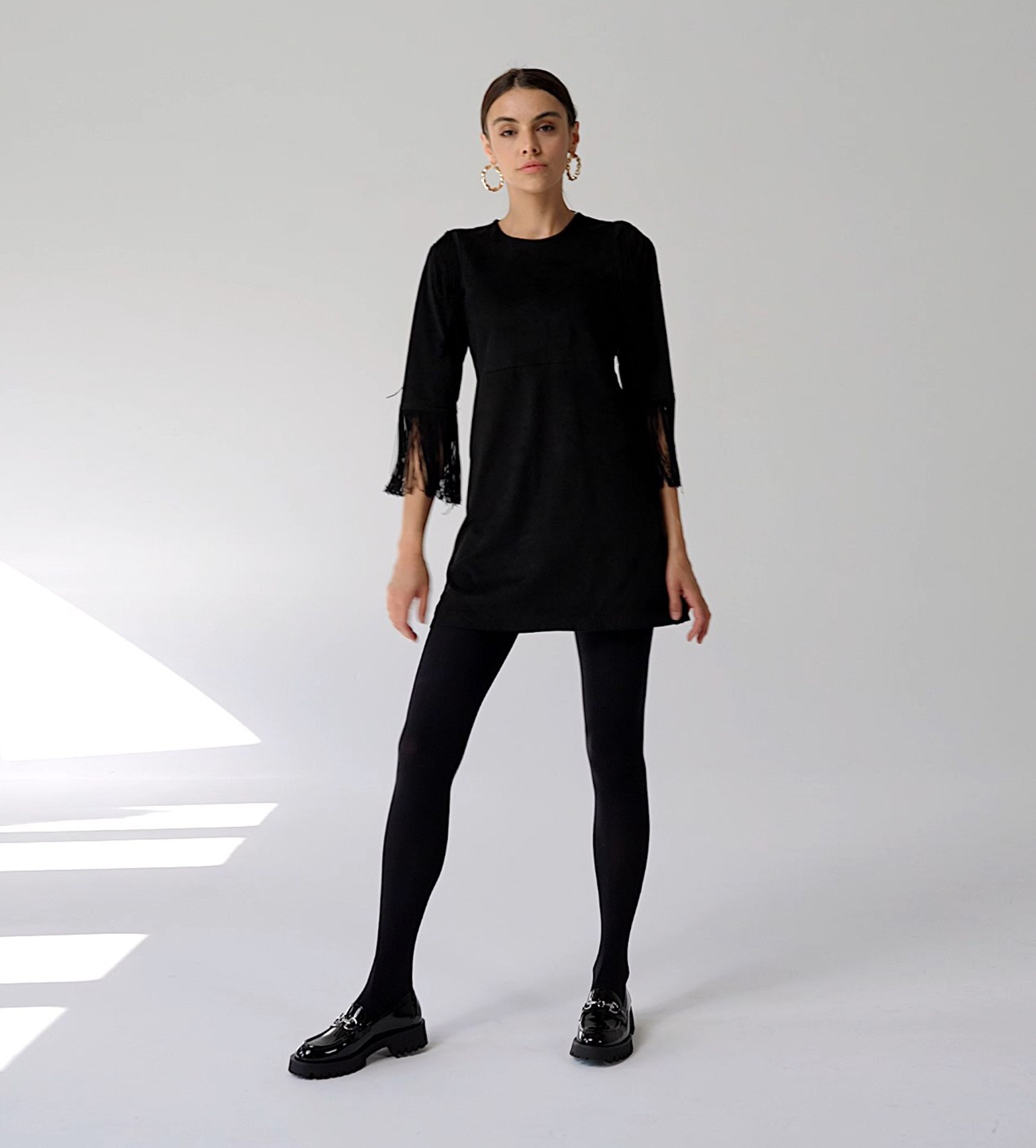Postaw na luźną sukienkę midi w kolorze ciemnej zieleni lub burgundu, najlepiej z miękkiego, jesiennego materiału, takiego jak dzianina. Do tego dodaj ciemne, kryjące rajstopy, które nadadzą stylizacji spójności. Na wierzch załóż skórzaną ramoneskę w kolorze czarnym, która doda całości nieco zadziorności i idealnie skomponuje się z lakierowanymi mokasynami. Całość uzupełni mała torebka na łańcuszku w srebrnym odcieniu, nawiązująca do detalu na butach. Możesz również dodać delikatne kolczyki w kształcie kół oraz subtelny szalik w neutralnym kolorze, aby stylizacja była gotowa na chłodniejsze dni.