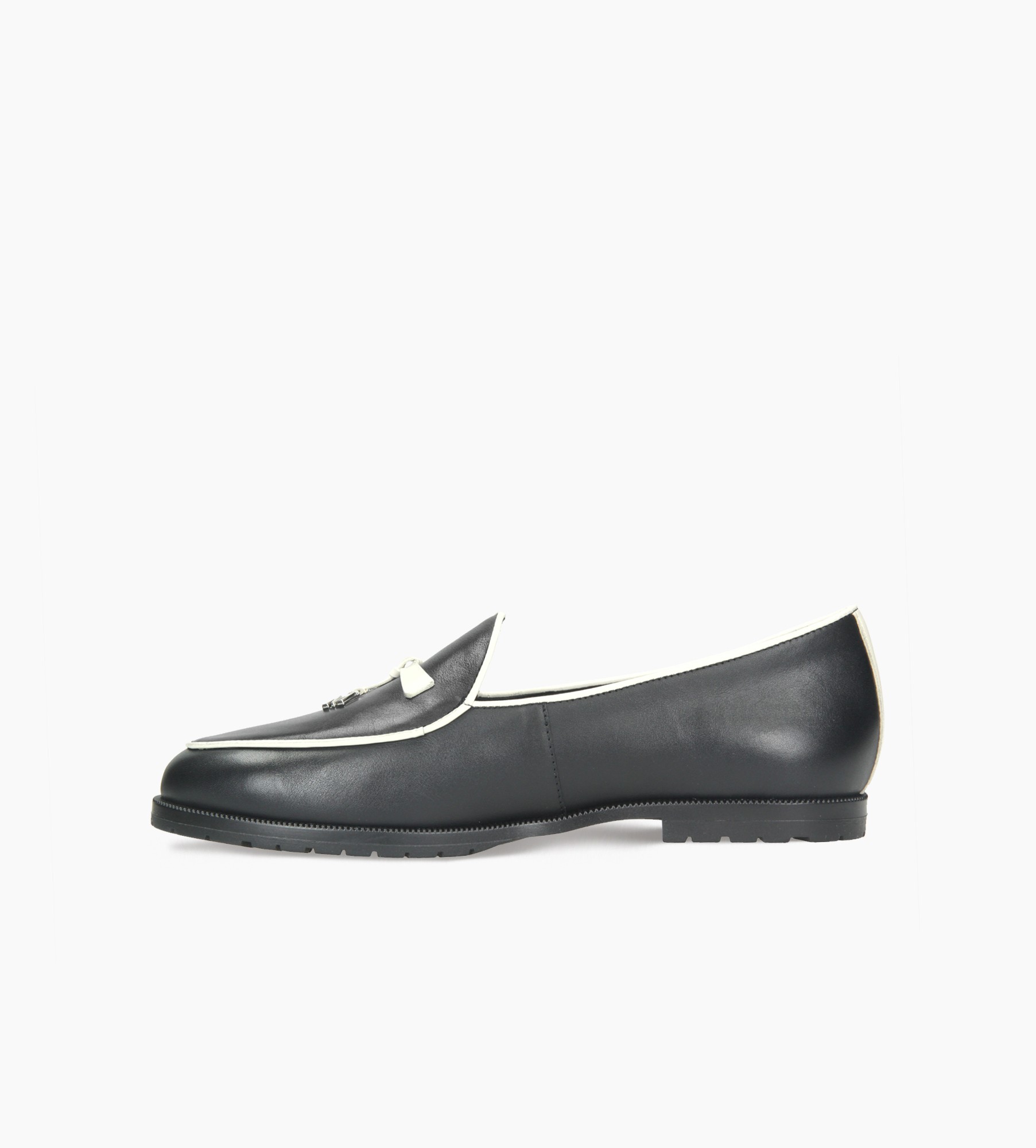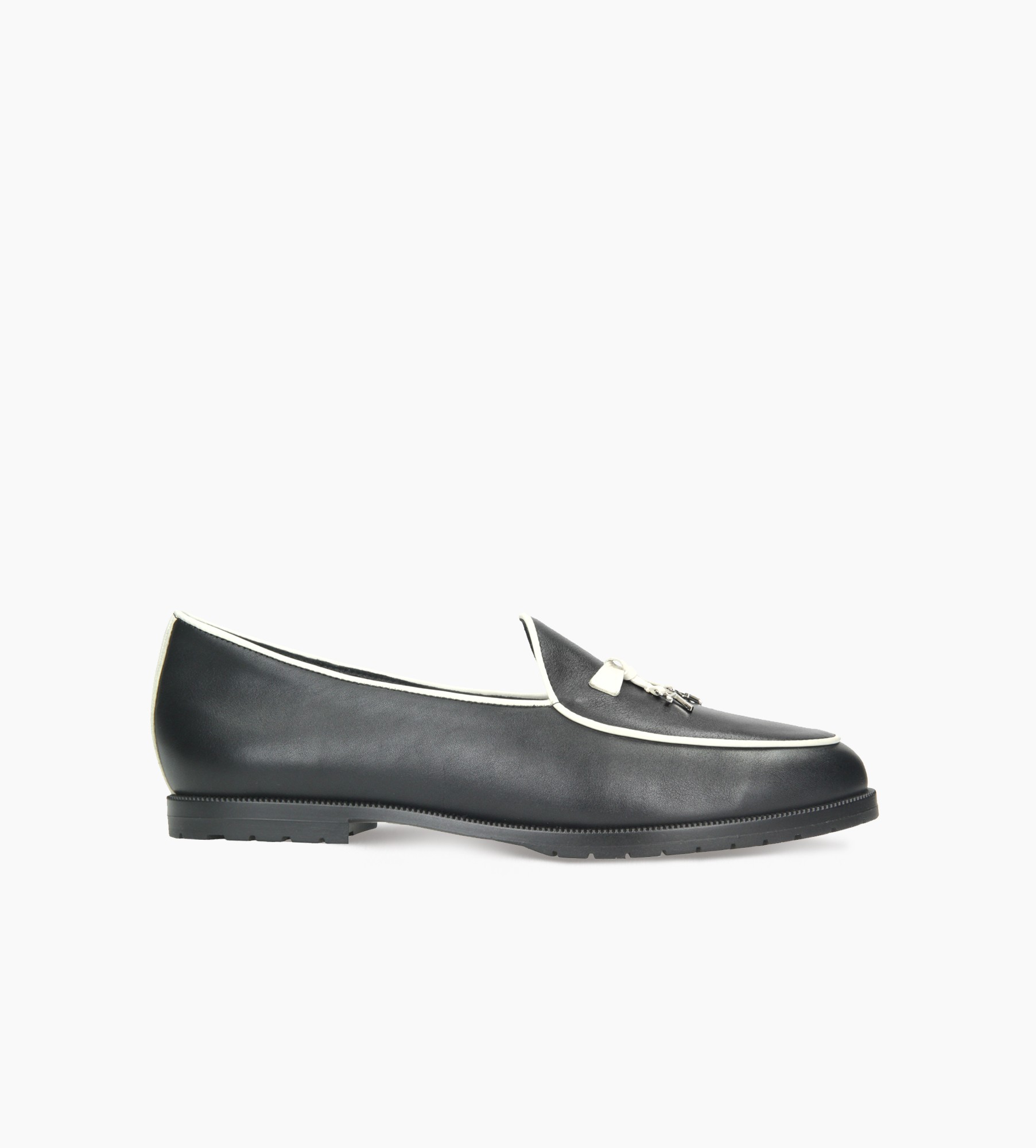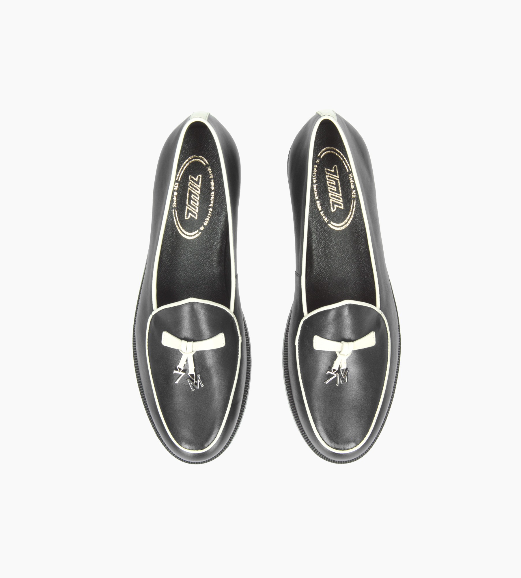 Czarne mokasyny damskie wykonane z najwyższej jakości naturalnej skóry cielęcej wyróżniają się elegancją i precyzją wykonania. Wnętrze buta wyściełane jest miękką skórą jagnięcą, co zapewnia wyjątkowy komfort i dopasowanie do stopy. Kontrastowe, jasne wykończenie podkreśla klasyczny fason obuwia, nadając mu nowoczesnego charakteru. Na cholewce znajdują się ozdobne chwosty, wzbogacone o metalowe dekoracje z logo firmy, które dodają modnego akcentu. Model ten doskonale sprawdzi się zarówno w stylizacjach casualowych, jak i eleganckich, łącząc wygodę z ponadczasowym stylem.