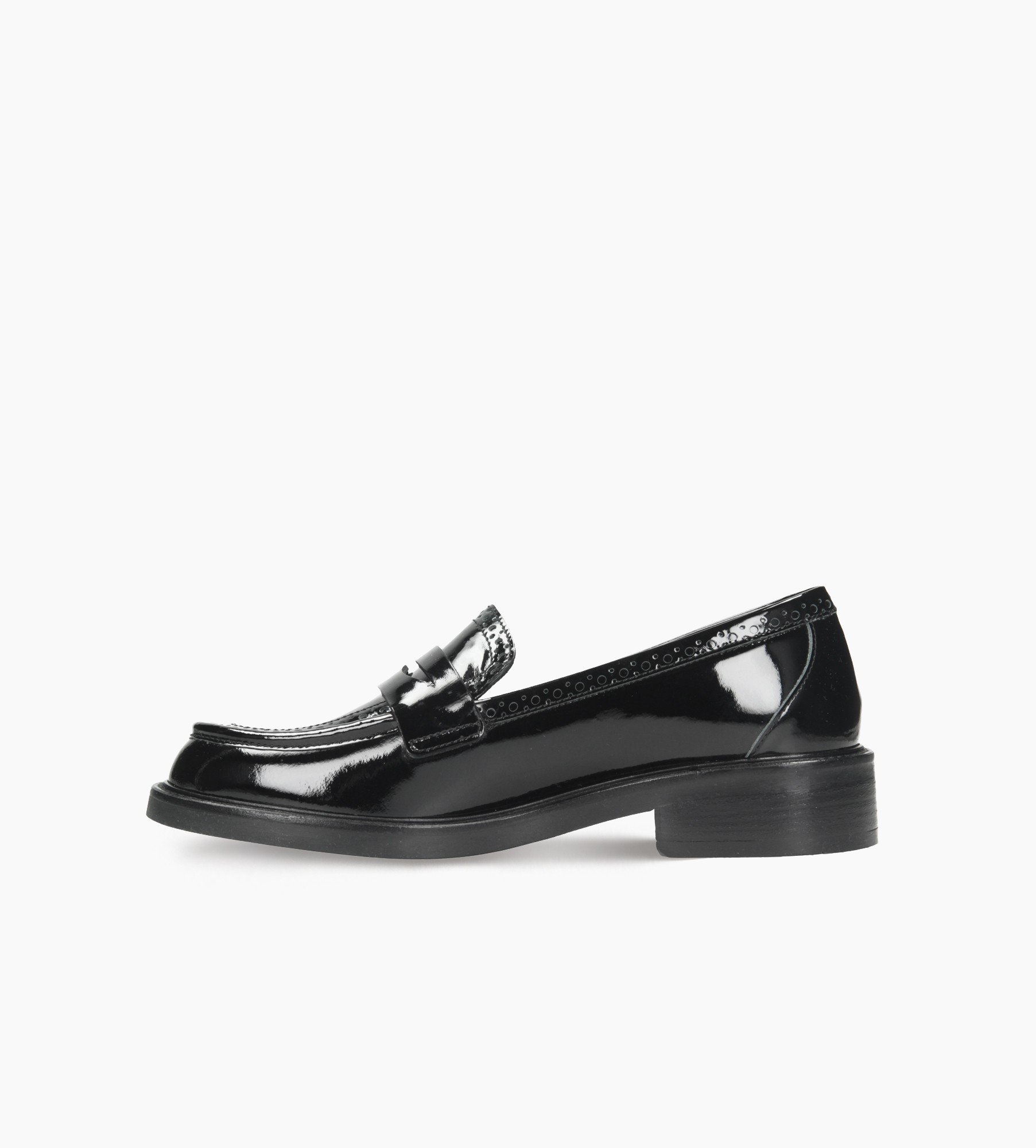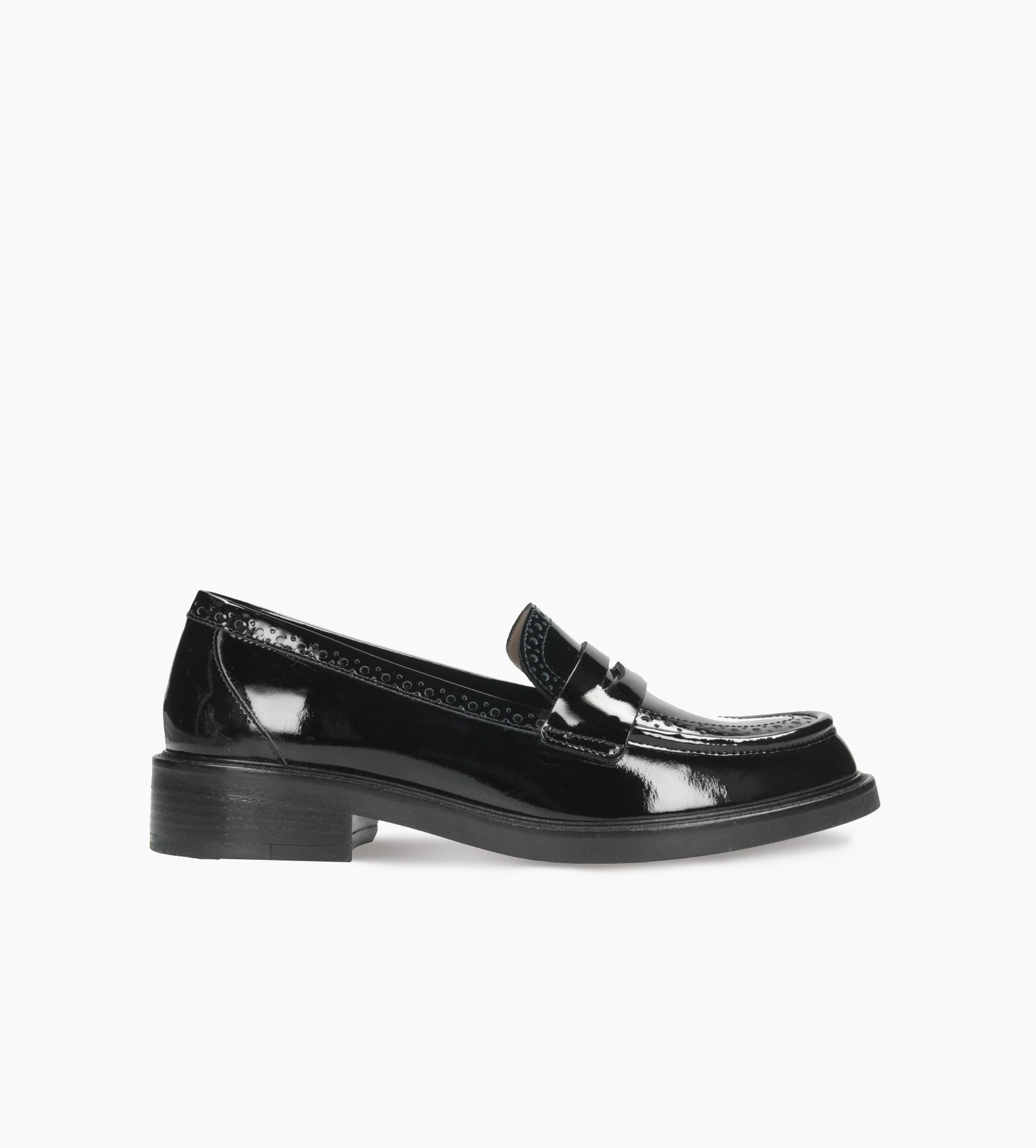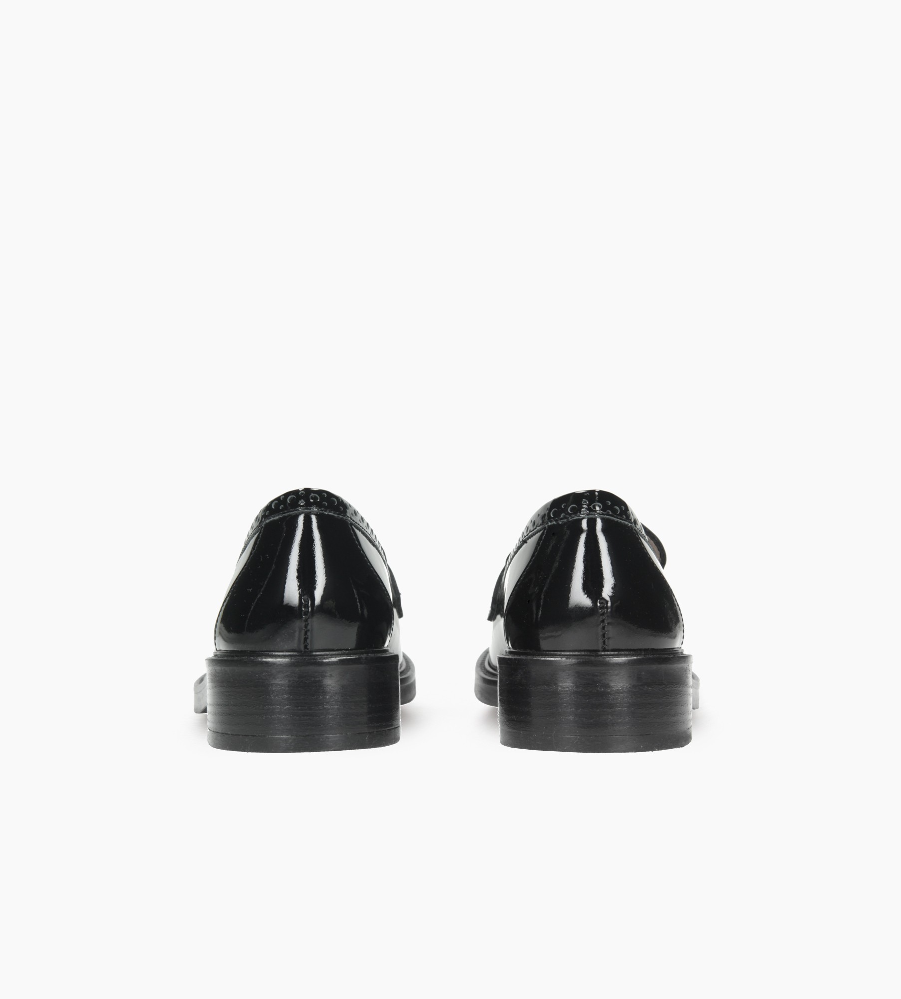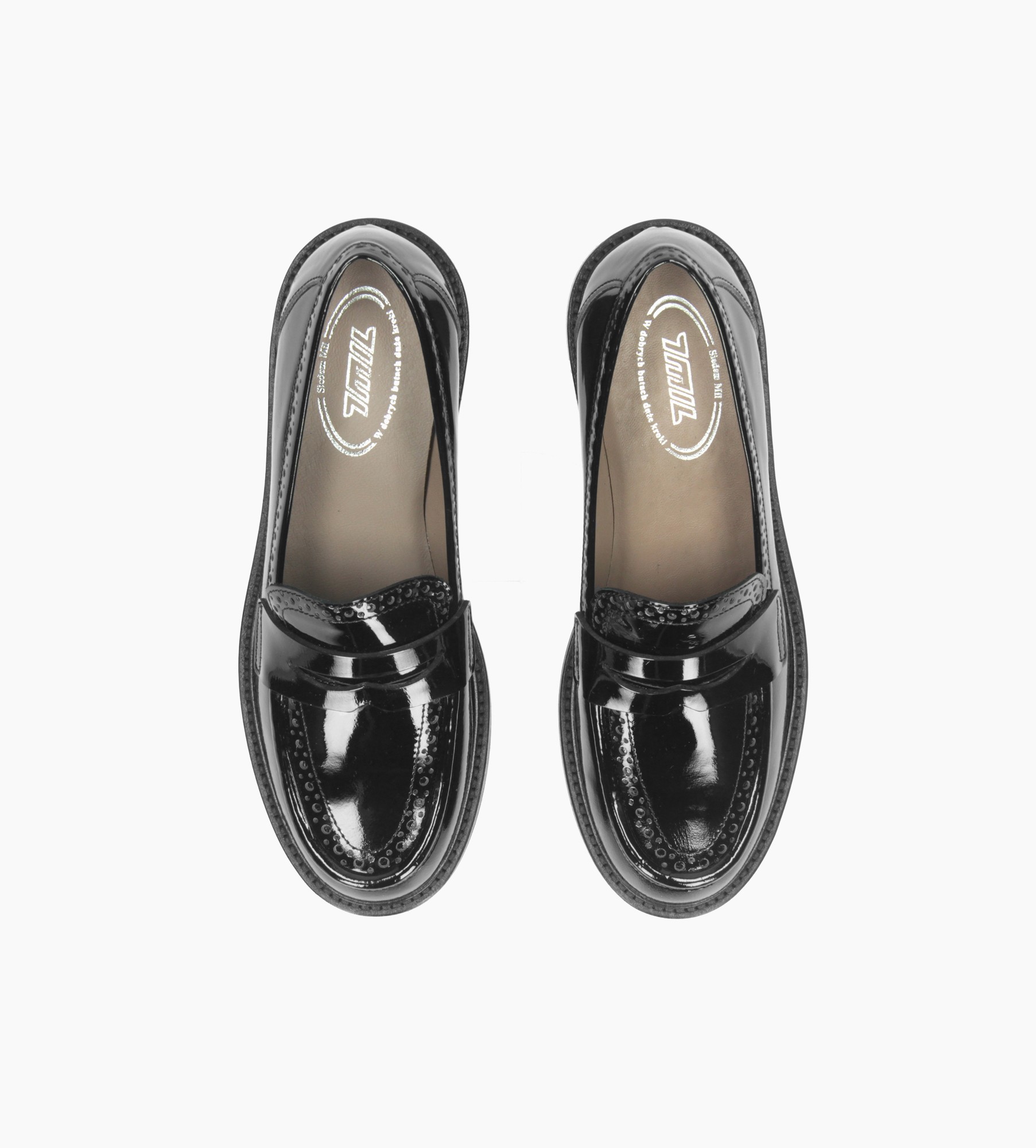 Czarne lakierowane mokasyny to połączenie klasycznej elegancji i nowoczesnego wykończenia. Wykonane z wysokiej jakości lakierowanej skóry, przyciągają uwagę swoim subtelnym połyskiem, który dodaje im charakteru. Wnętrze buta wyściełane jest niezwykle miękką skórą jagnięcą, zapewniając komfort noszenia przez cały dzień. Wyjątkowym akcentem tego modelu są delikatne, kobiece perforacje na krawędziach cholewki, które dodają im lekkości i uroku. Precyzyjnie wykonane wzory subtelnie podkreślają klasyczną formę buta, nadając mu eleganckiego, ale zarazem nowoczesnego charakteru.