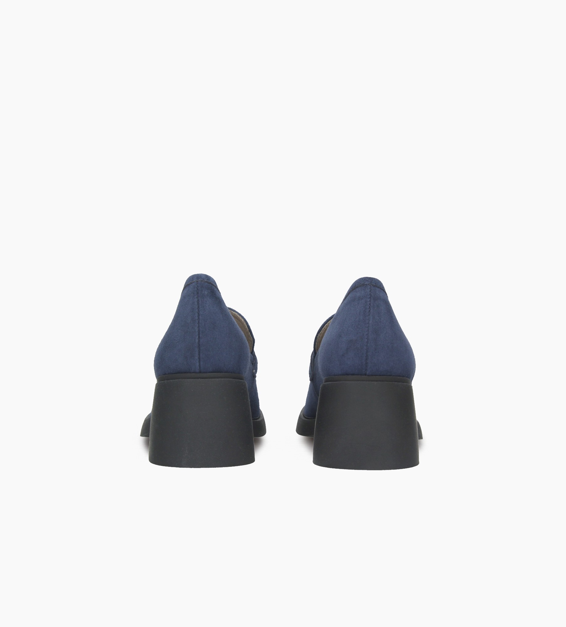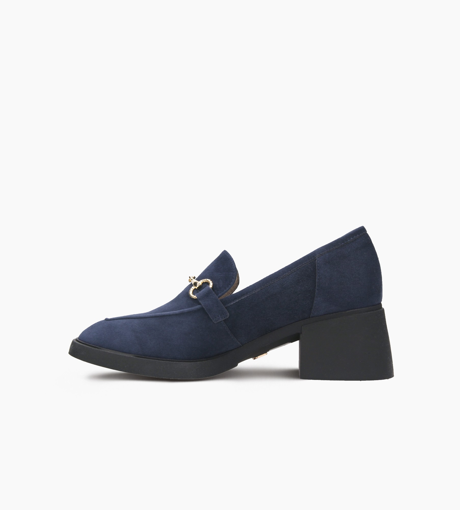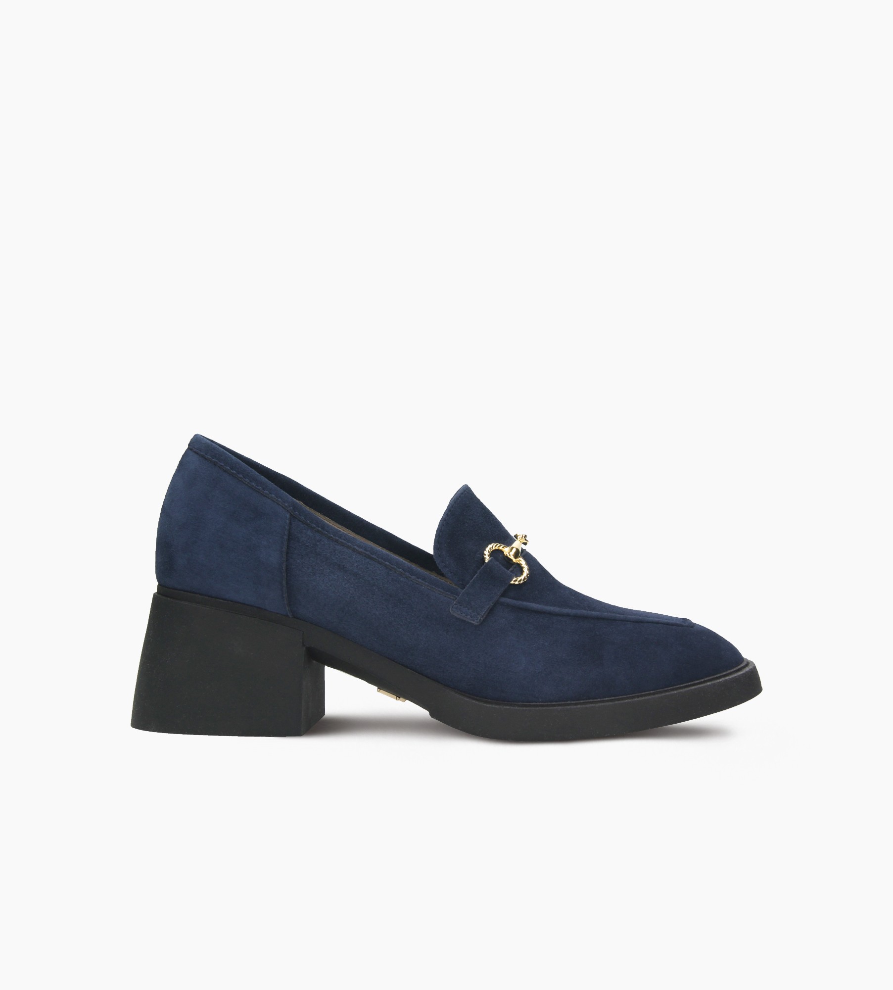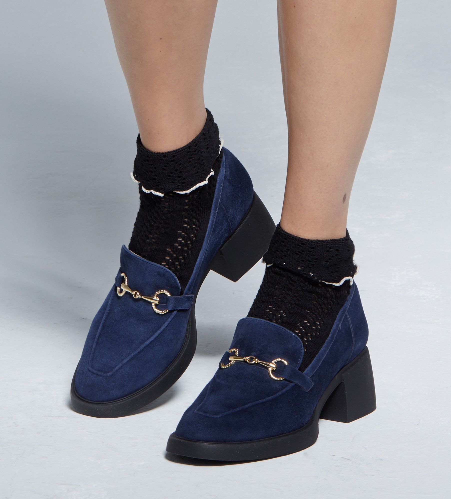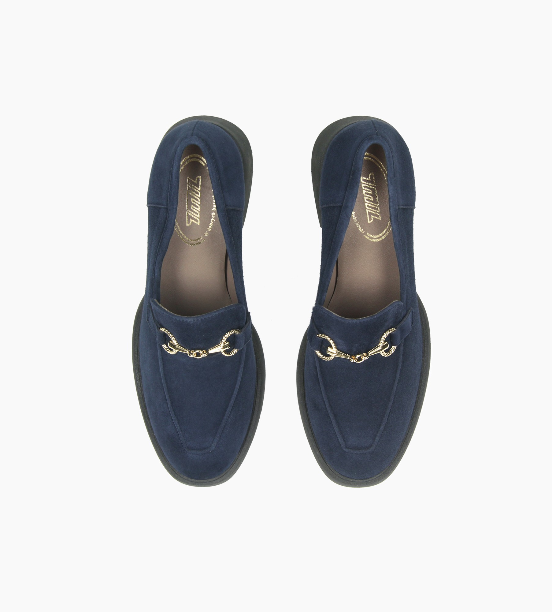 Te granatowe mokasyny damskie z naturalnej skóry zamszowej to kwintesencja elegancji i wygody. Wyróżniają się złotą ozdobą, która dodaje im szyku. Wnętrze buta wyściełane jest miękką skórą jagnięcą, co zapewnia komfort noszenia przez cały dzień. Solidny, 6-centymetrowy obcas dodaje delikatnej wysokości, idealnie komponując się z klasyczną sylwetką buta. Te mokasyny doskonale sprawdzą się zarówno w eleganckich, jak i codziennych stylizacjach.