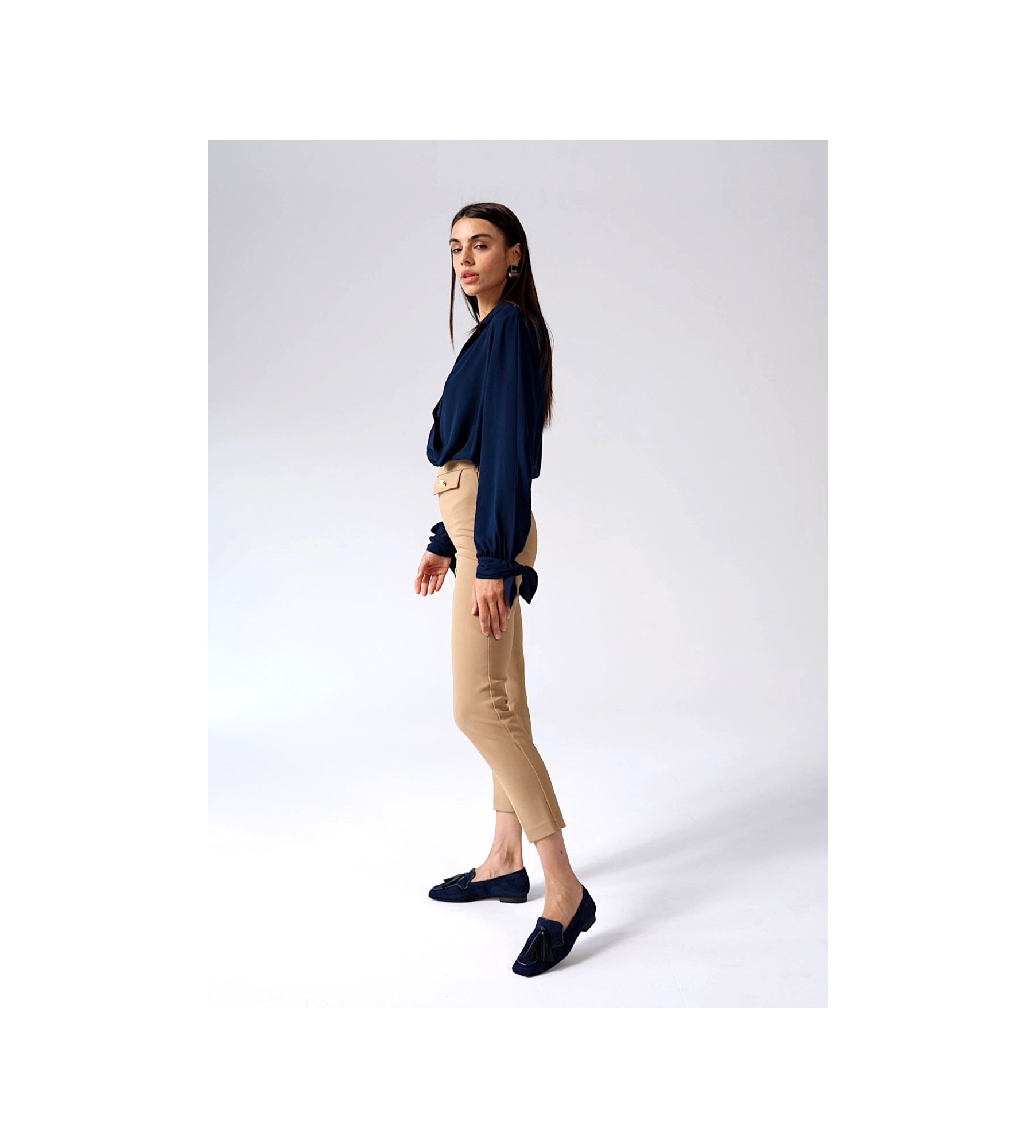 Zestaw je z dopasowanymi granatowymi spodniami cygaretkami, które podkreślą nogi i nadadzą sylwetce elegancji. Do tego dodaj beżowy, oversize'owy sweter z golfem, który wprowadza przytulność i ciepło na chłodniejsze dni. Na wierzch narzuć krótki, szary płaszcz o prostym kroju, który doda stylizacji lekkości i miejskiego szyku. Całość uzupełnij granatową torebką na ramię i delikatnymi srebrnymi kolczykami, które dodadzą subtelnego blasku.