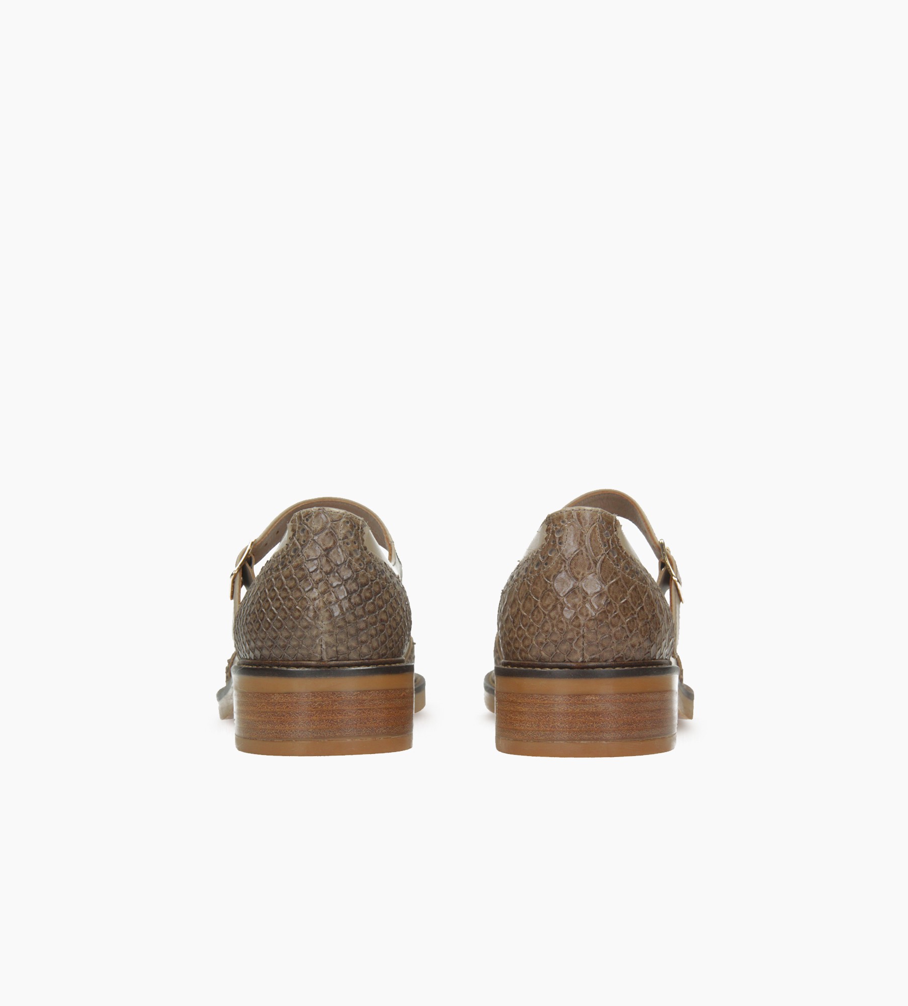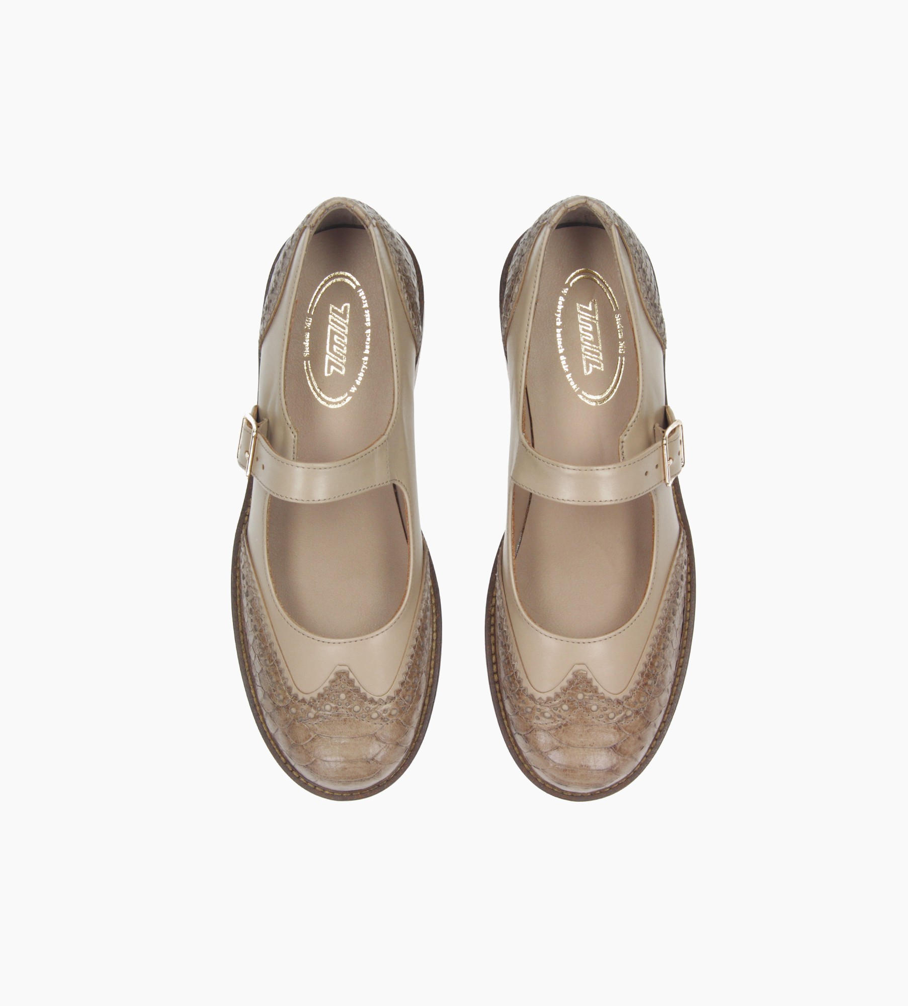 Beżowe półbuty łączą w sobie klasyczny fason z subtelnymi, luksusowymi detalami. Wykonane z najwyższej jakości naturalnej skóry licowej w delikatnym beżowym odcieniu, prezentują się niezwykle elegancko i uniwersalnie. Charakterystycznym elementem modelu są dekoracyjne wstawki z fakturą skóry inspirowaną motywem krokodyla umieszczone na czubku i pięcie – dodają one butom wyrafinowanego charakteru, podkreślając jednocześnie ich kobiecy styl. Subtelne perforacje na przodach wprowadzają lekkość i finezję, a klamerka na pasku nie tylko zdobi, ale też zapewnia idealne dopasowanie do stopy.