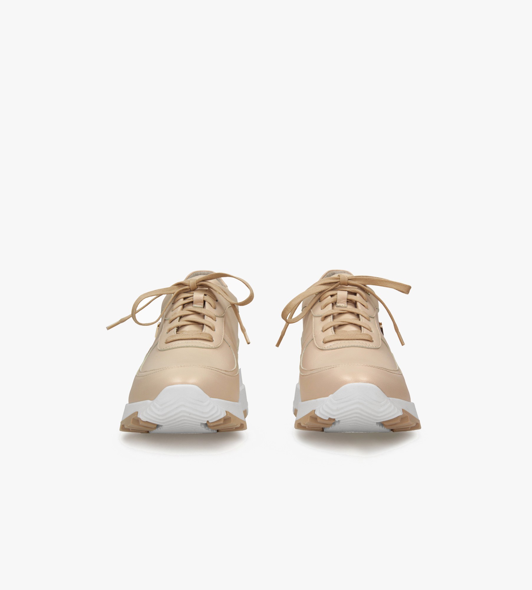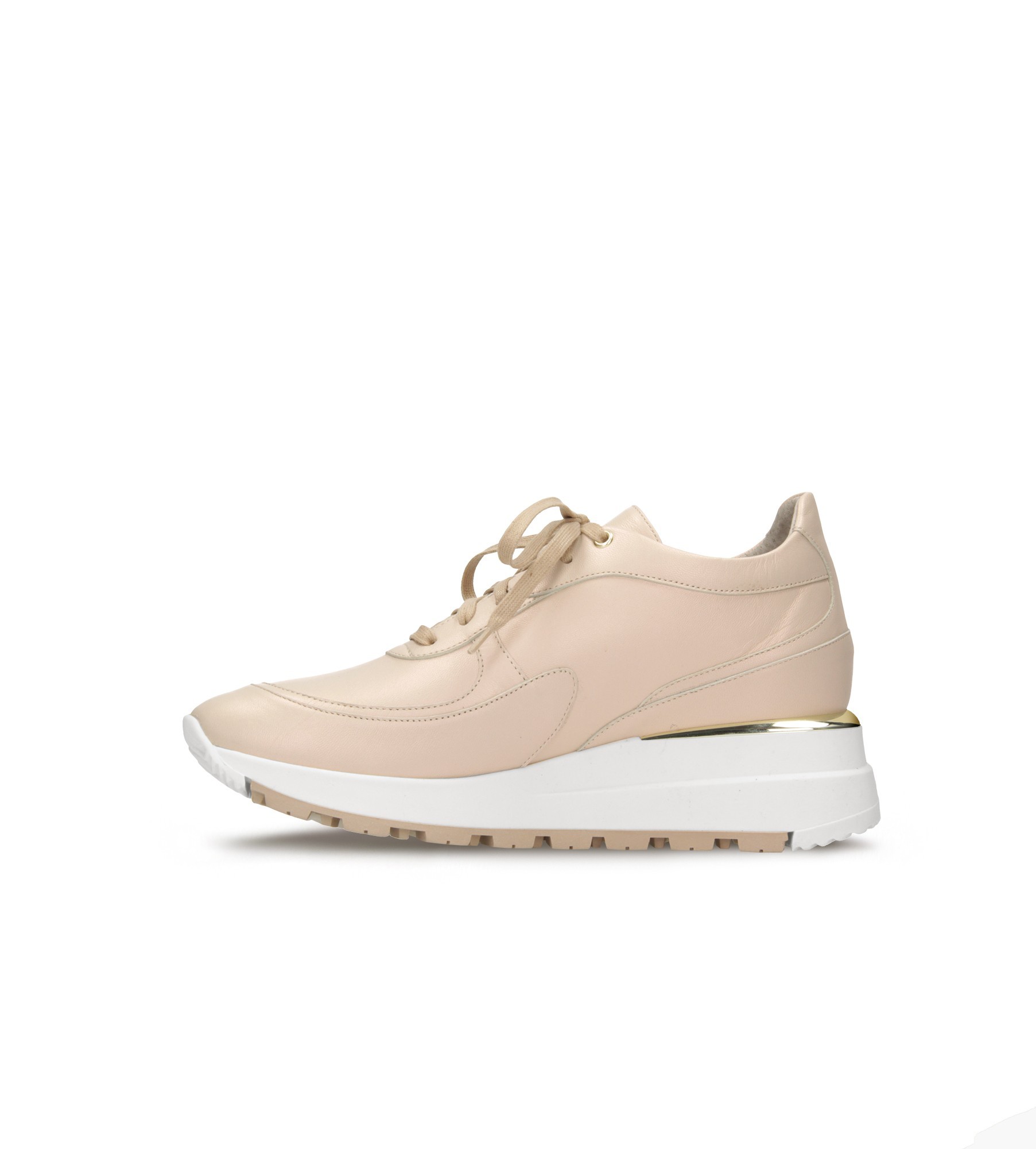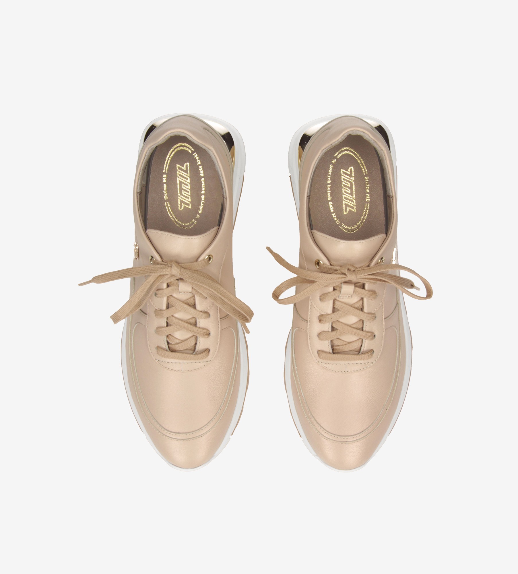 Beżowe sneakersy damskie od 7mil wykonane są z naturalnej skóry licowej. Cholewka w neutralnym kolorze ozdobiona jest złotym nitem, a wnętrze butów wyściełane jest skórą jagnięcą, zapewniając komfort noszenia. Miękka, skórzana wkładka jest jest wykonana ze specjalnego materiału, który pomaga utrzymać stopy w idealnej kondycji. Sneakersy mają niski, czterocentymetrową podeszwę. Te sneakersy łączą w sobie elegancję i wygodę, idealne do codziennych stylizacji.