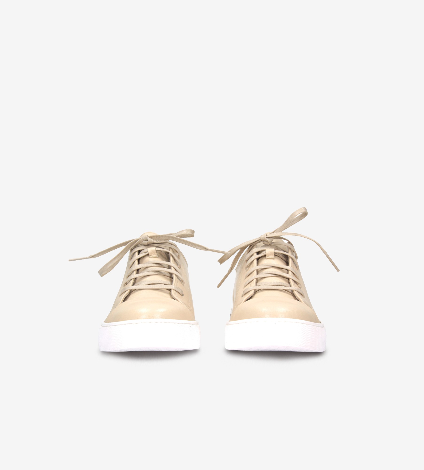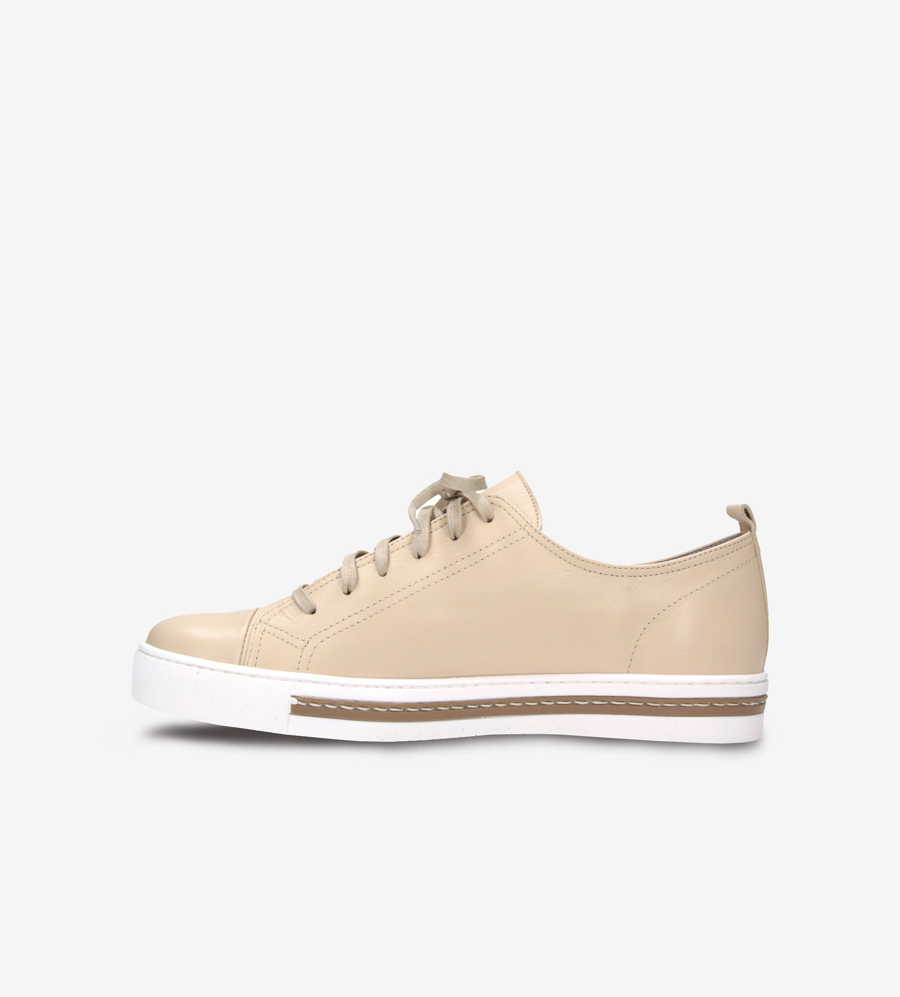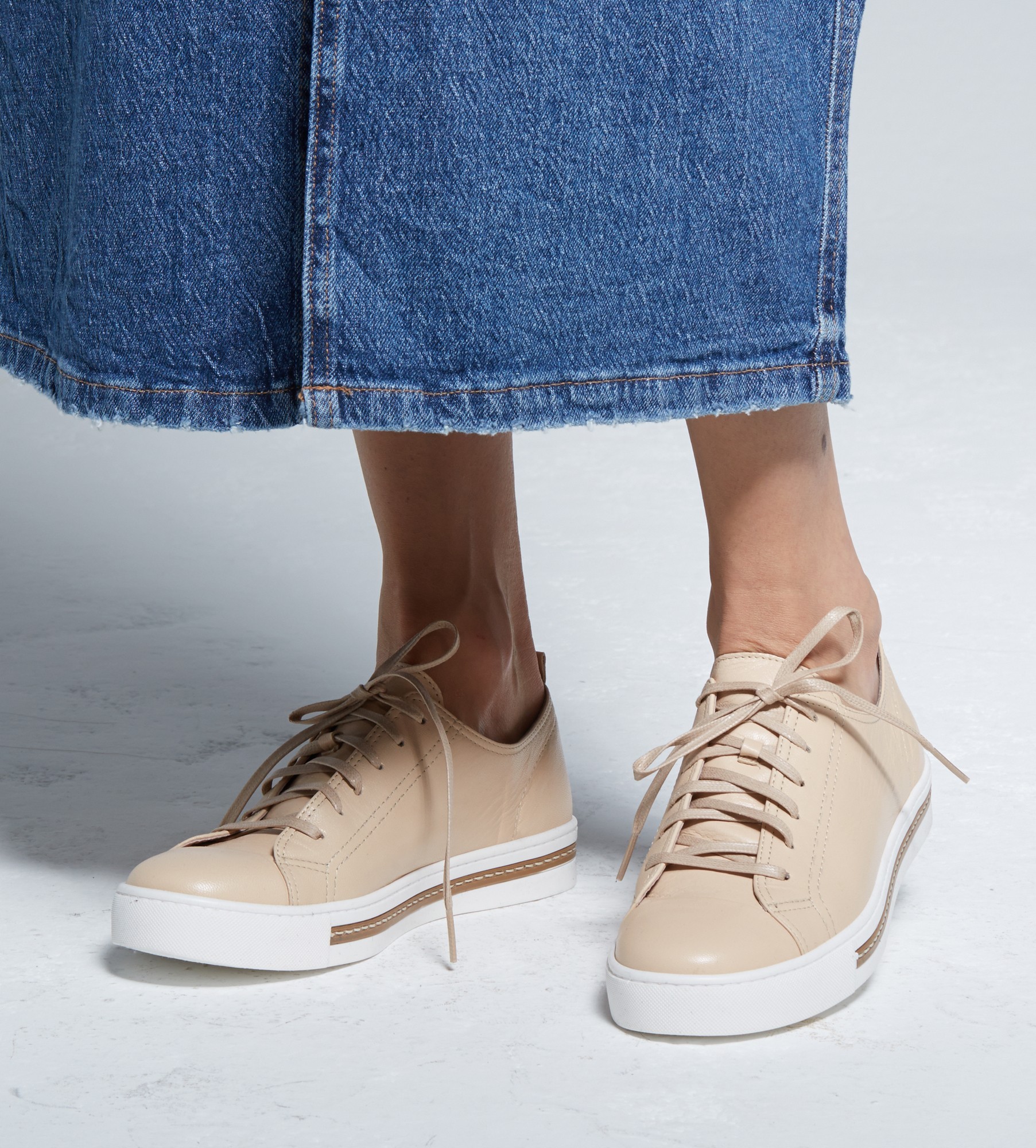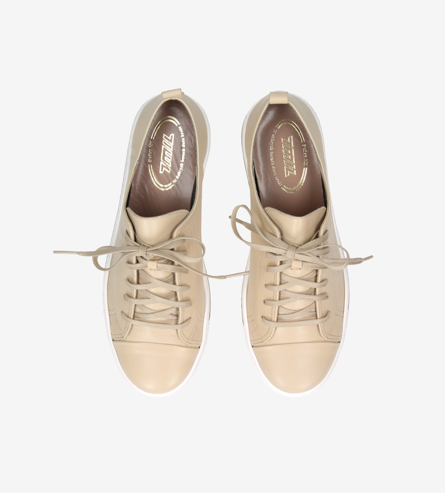 Beżowe trampki to idealne połączenie elegancji i komfortu. Wykonane z najwyższej jakości naturalnej skóry licowej, prezentują się niezwykle stylowo dzięki subtelnym złotym akcentom. Miękkie wnętrze wyścielone skórą jagnięcą zapewnia komfort przez cały dzień. Skórzana wkładka dodatkowo zwiększa wygodę, a niski obcas oraz solidna podeszwa gwarantują stabilność i wsparcie. Te trampki są doskonałym wyborem na co dzień, dodając szyku każdej stylizacji.