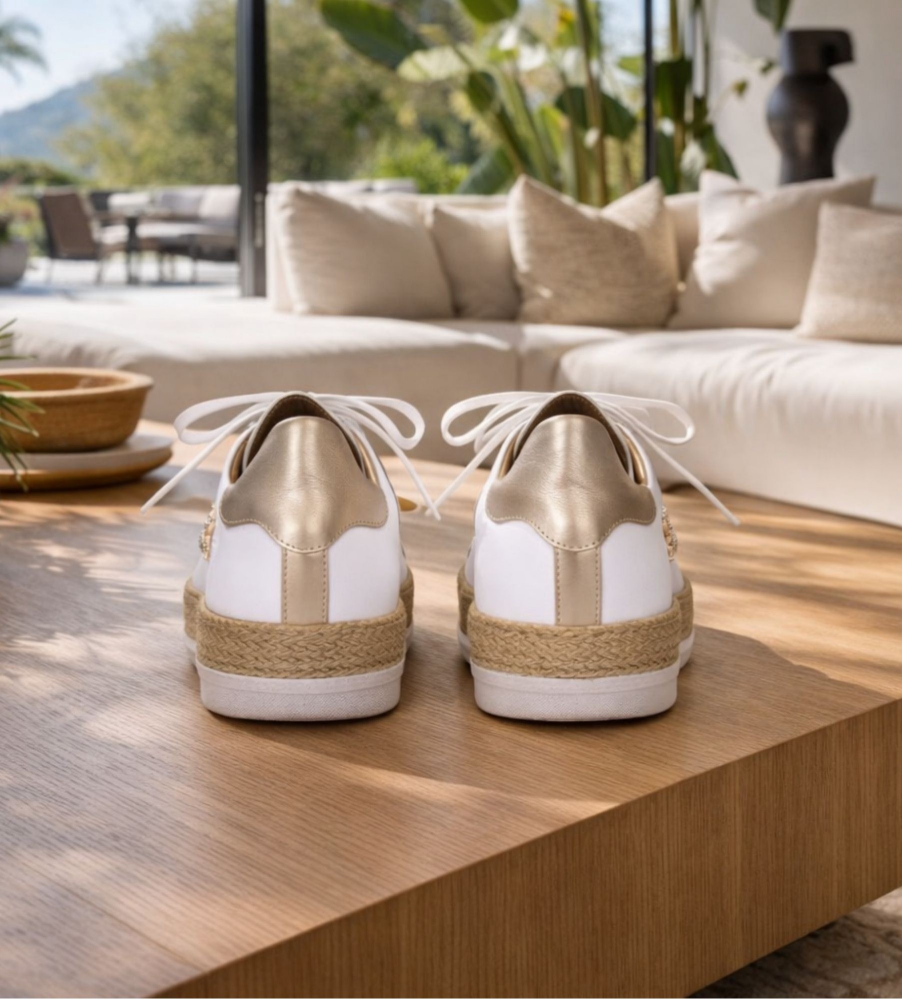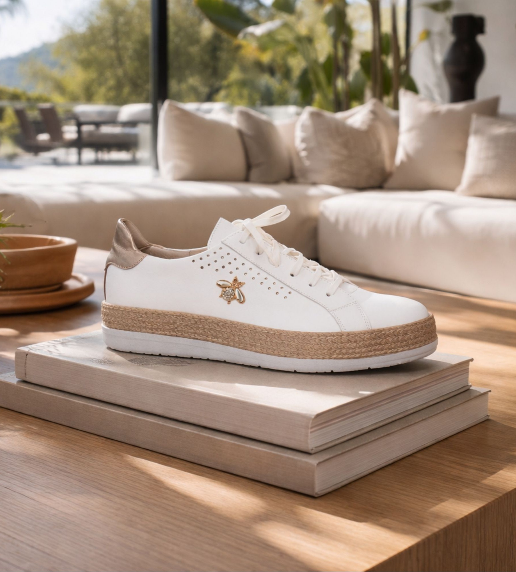 Białe sneakersy damskie to połączenie elegancji i codziennego komfortu, idealne dla nowoczesnej kobiety, która ceni sobie zarówno styl, jak i wygodę. Cholewka wykonana jest z wysokiej jakości naturalnej skóry cielęcej. Wnętrze butów wyściełane jest miękką skórą jagnięcą, co zapewnia komfort noszenia przez cały dzień oraz pozwala stopom oddychać, utrzymując odpowiedni mikroklimat. Miękka, skórzana wkładka dodaje dodatkowego komfortu. Ich nowoczesny, minimalistyczny design z subtelnymi detalami takimi jak ozdoba w kształcie owada, dodaje butom charakteru.