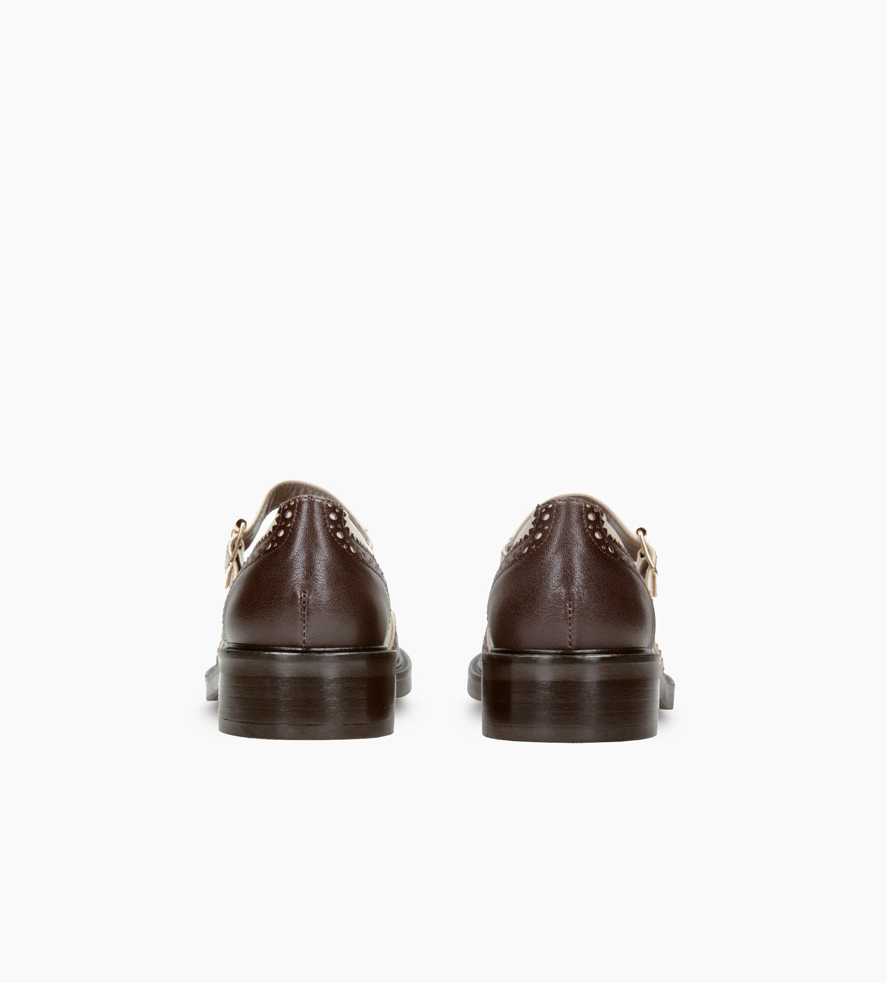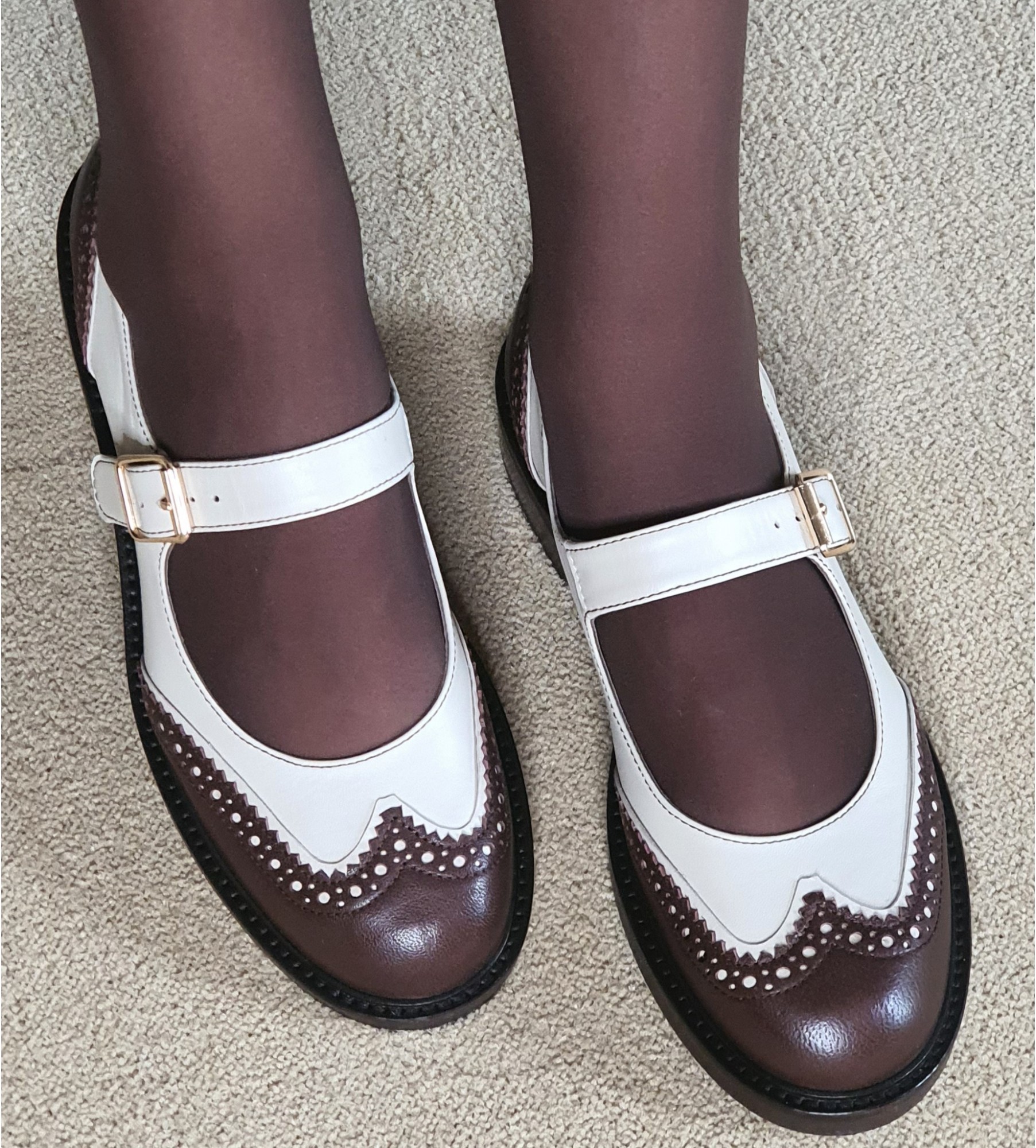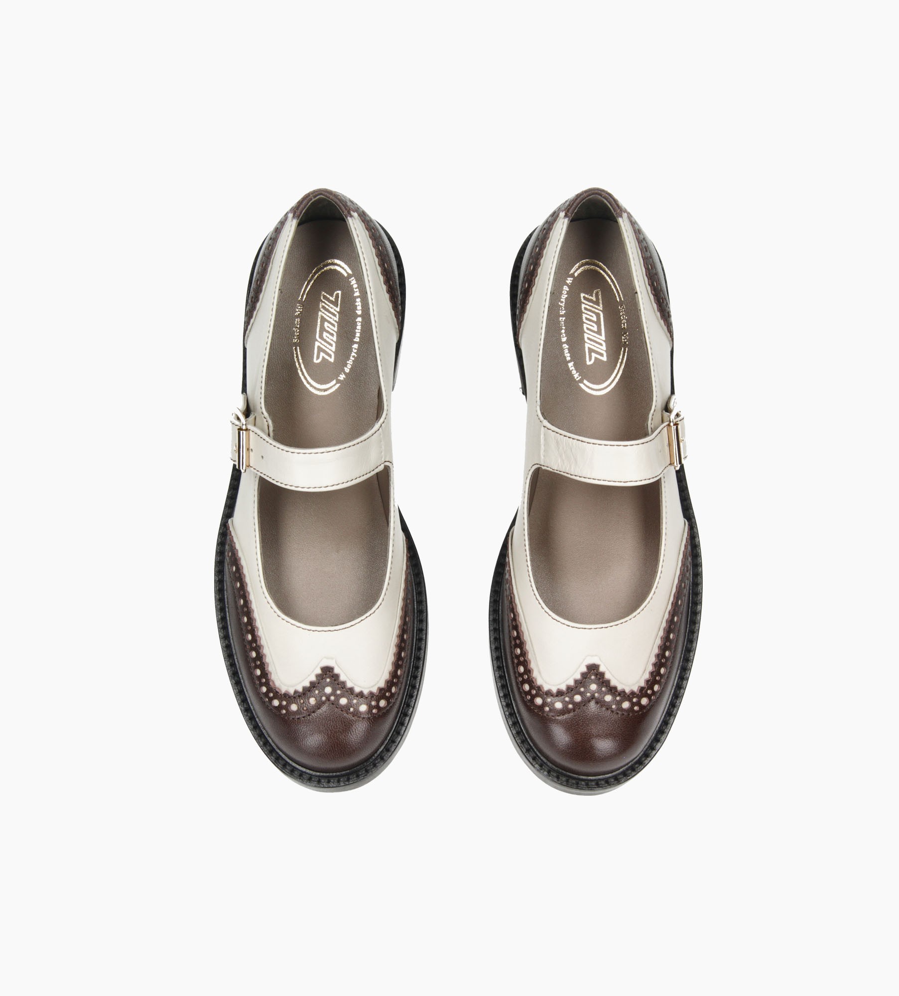 Stylowe półbuty damskie wykonane z najwyższej jakości naturalnej skóry, w eleganckim zestawieniu kolorów: ciepłego brązu i klasycznej bieli. Model zachwyca dopracowanym wzornictwem w stylu retro, z charakterystycznymi ażurowymi perforacjami i dekoracyjnymi przeszyciami, które nadają mu lekkości i wyrafinowanego charakteru. Buty posiadają pasek zapinany na złotą sprzączkę, który stabilnie trzyma stopę i subtelnie podkreśla linię podbicia. Zaokrąglony nosek i niska, solidna podeszwa zapewniają komfort noszenia przez cały dzień.